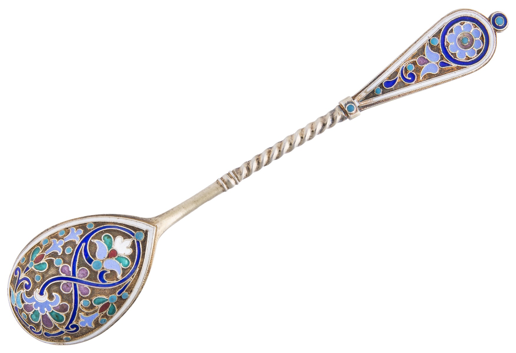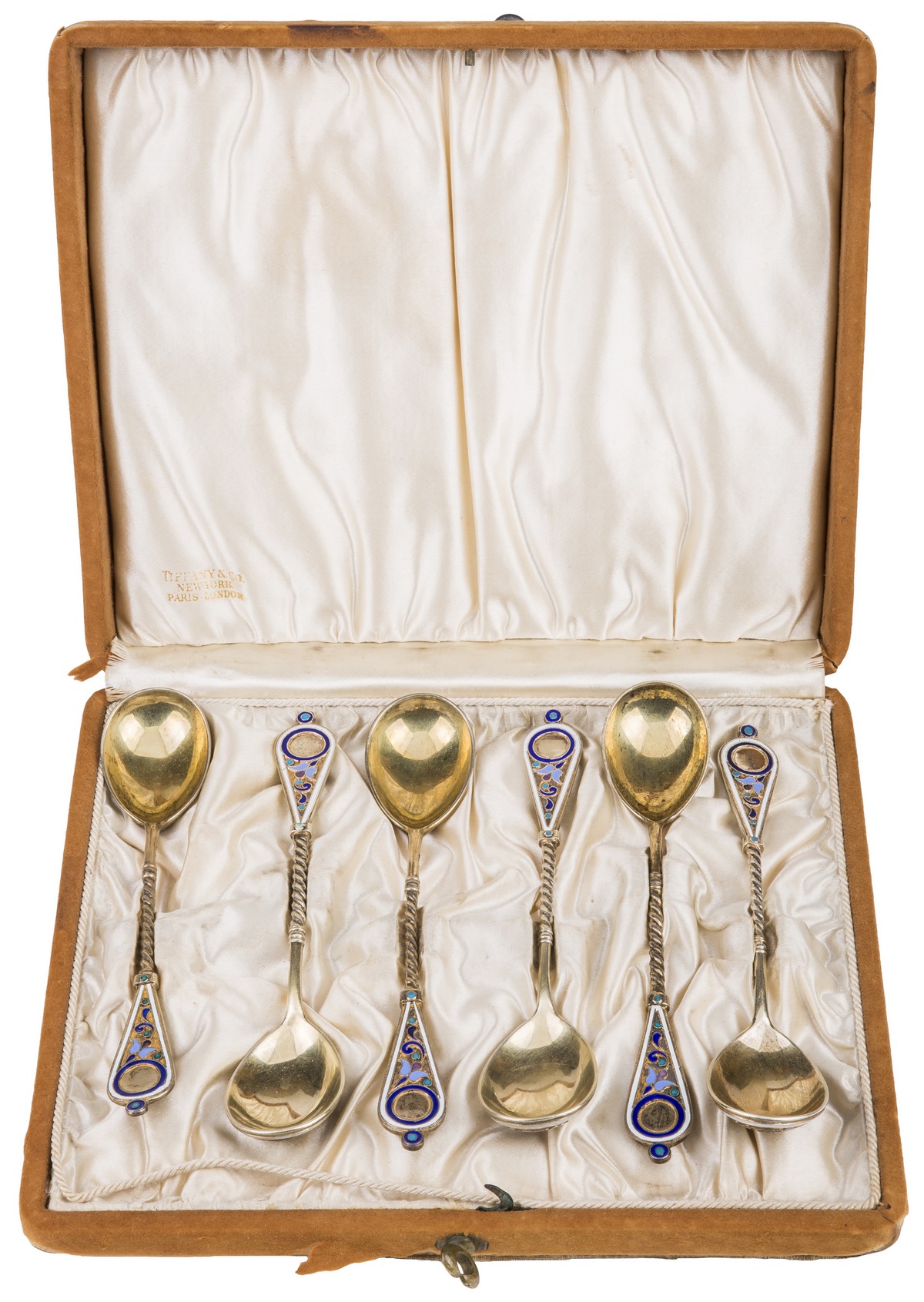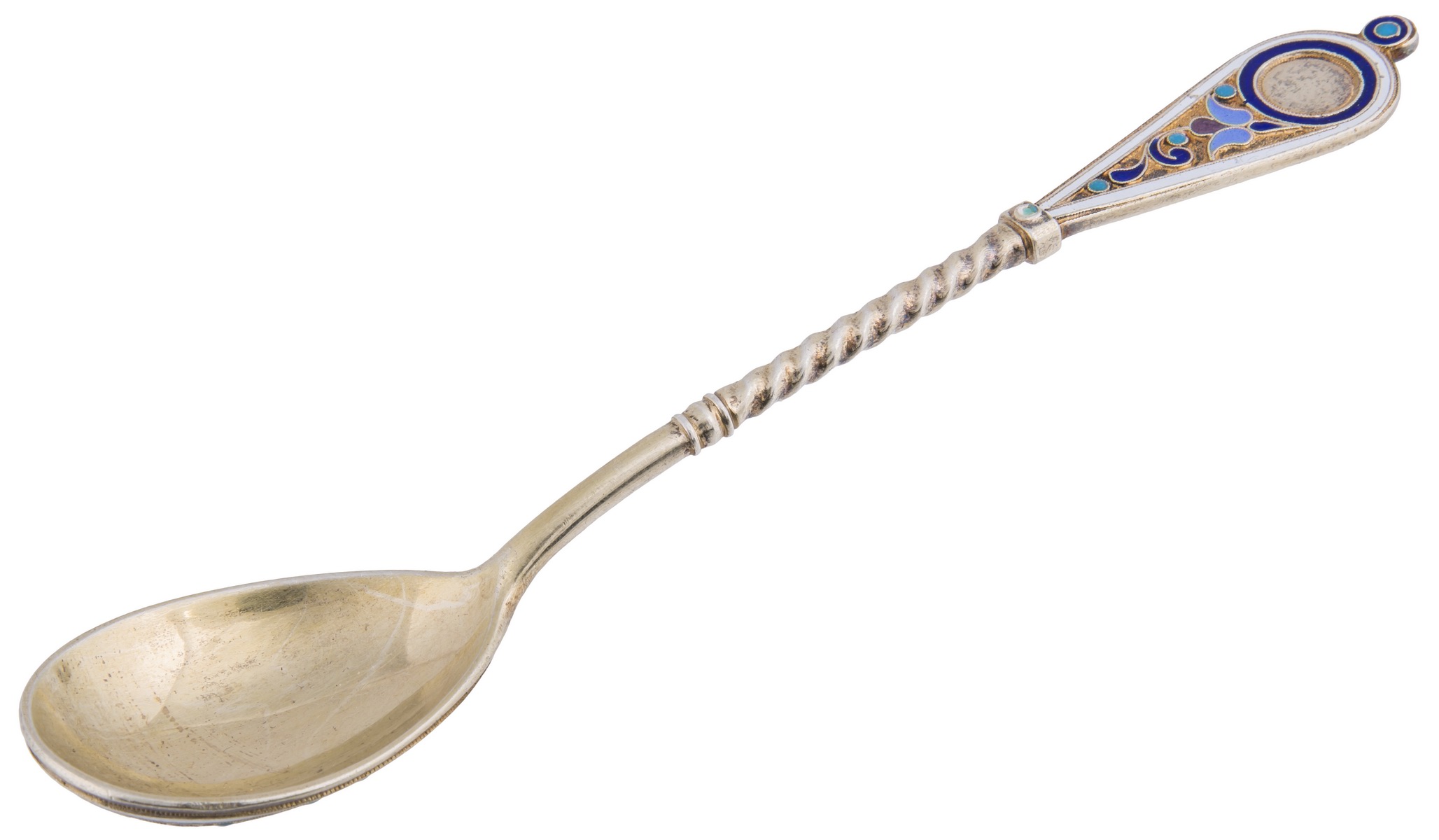 Серебро, гравировка, перегородчатая эмаль, золочение. Клейма: «Георгий Победоносец на коне, поражающий копьем дракона» - городовое клеймо Москвы (1880-е); «88» - проба серебра; «АК» - владелец фабрики золотых, серебряных и бронзовых изделий Кузмичев Антип Ив., основанной в 1856 году. Футляр фирмы Tiffany&Co. в подборе.