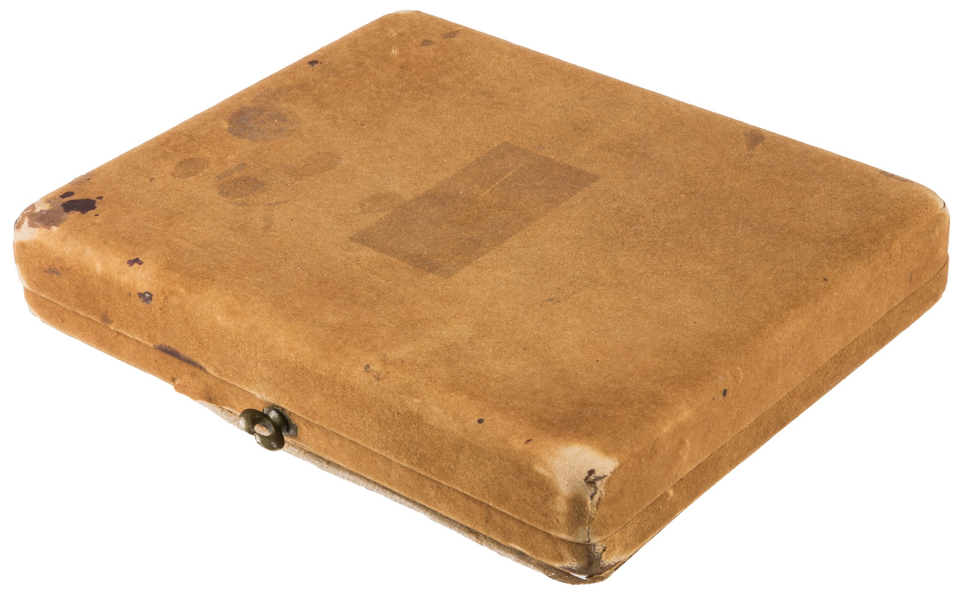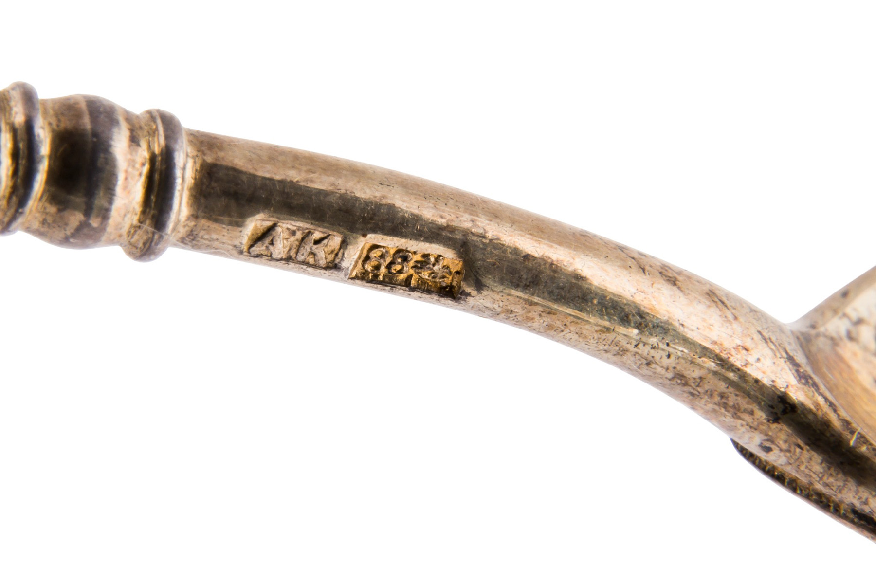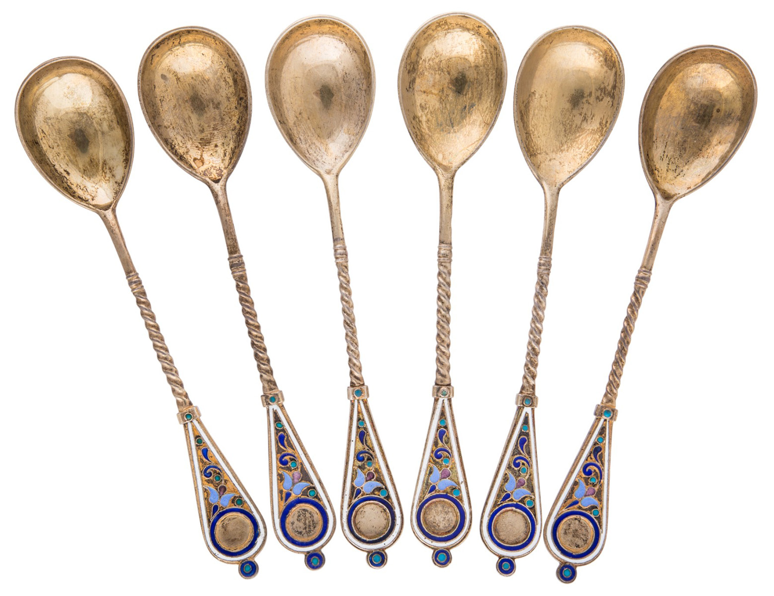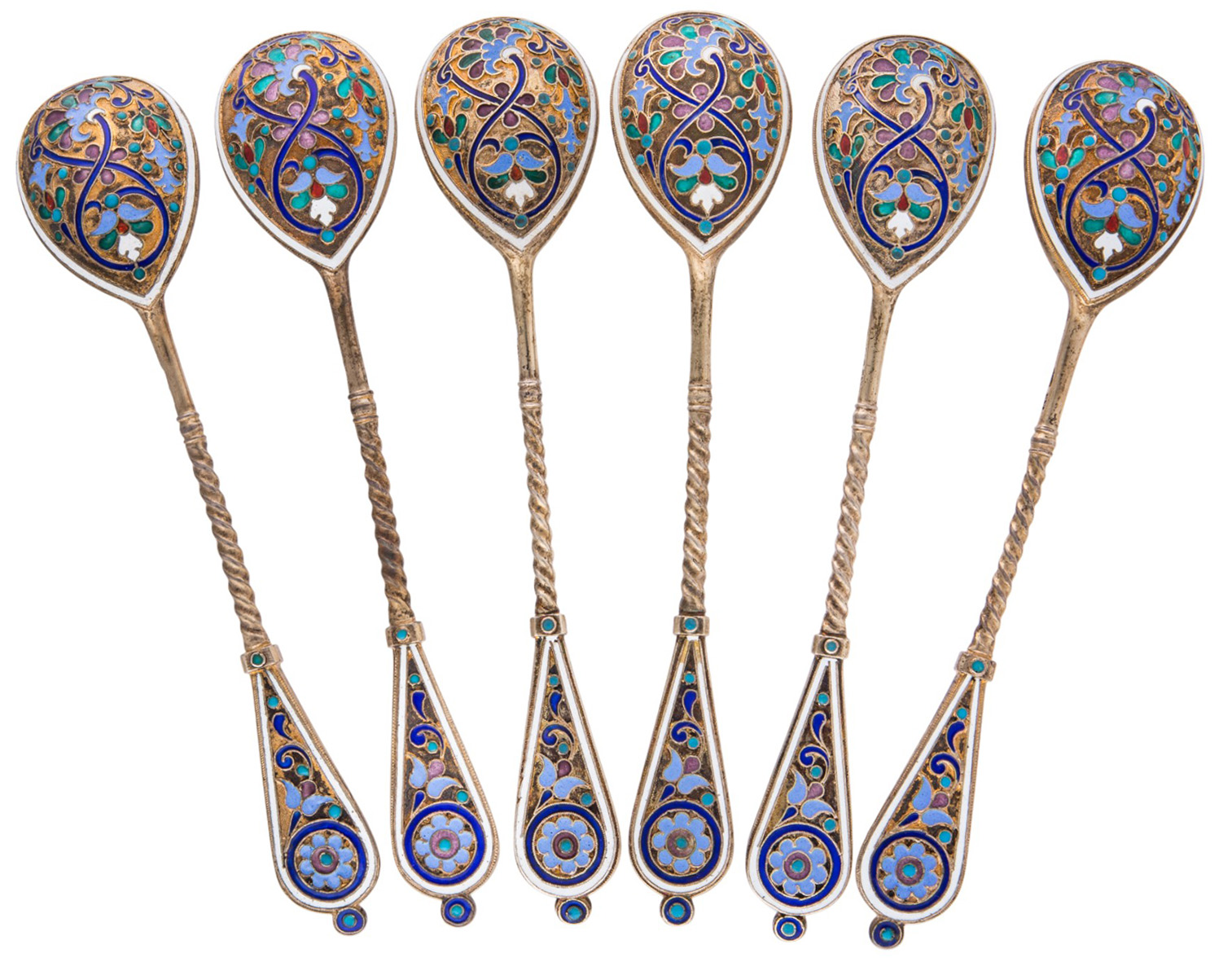 Серебро, гравировка, перегородчатая эмаль, золочение. Клейма: «Георгий Победоносец на коне, поражающий копьем дракона» - городовое клеймо Москвы (1880-е); «88» - проба серебра; «АК» - владелец фабрики золотых, серебряных и бронзовых изделий Кузмичев Антип Ив., основанной в 1856 году. Футляр фирмы Tiffany&Co. в подборе.