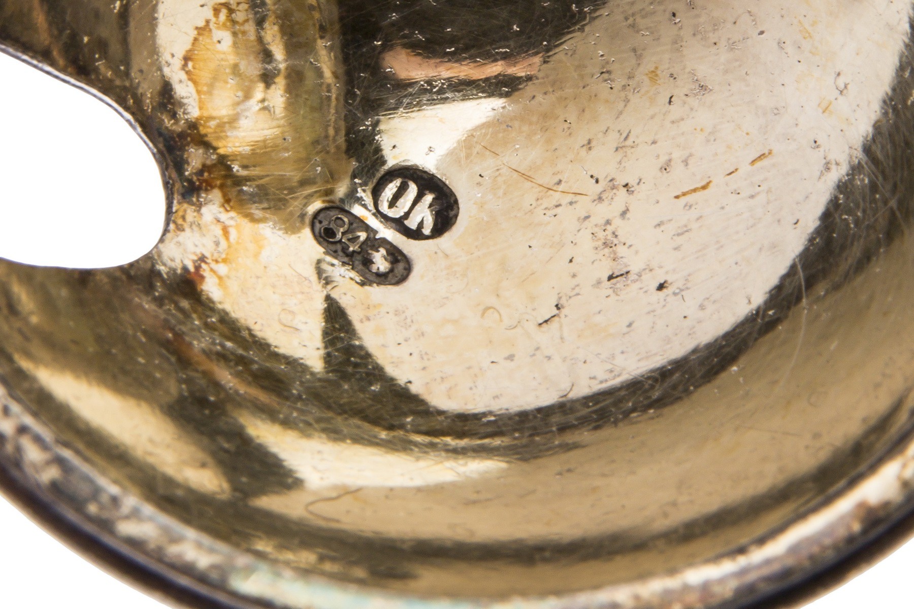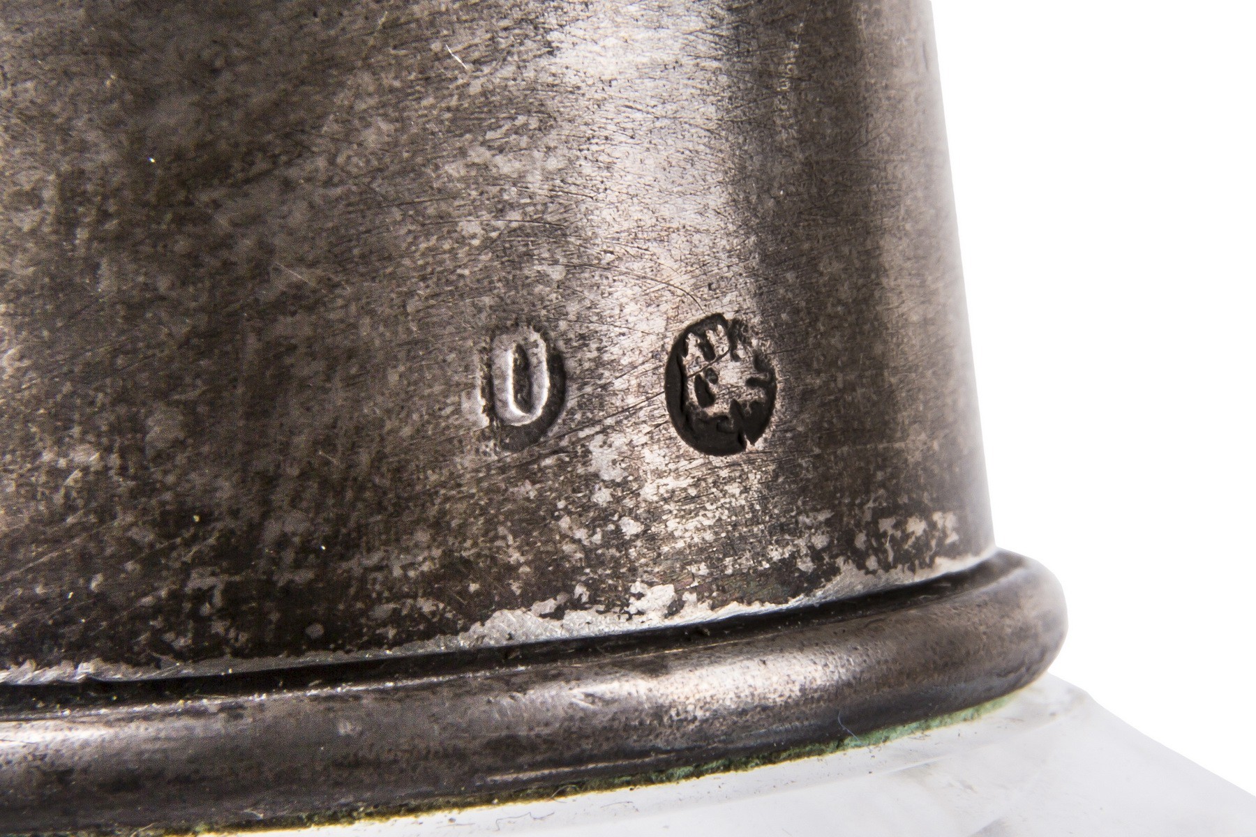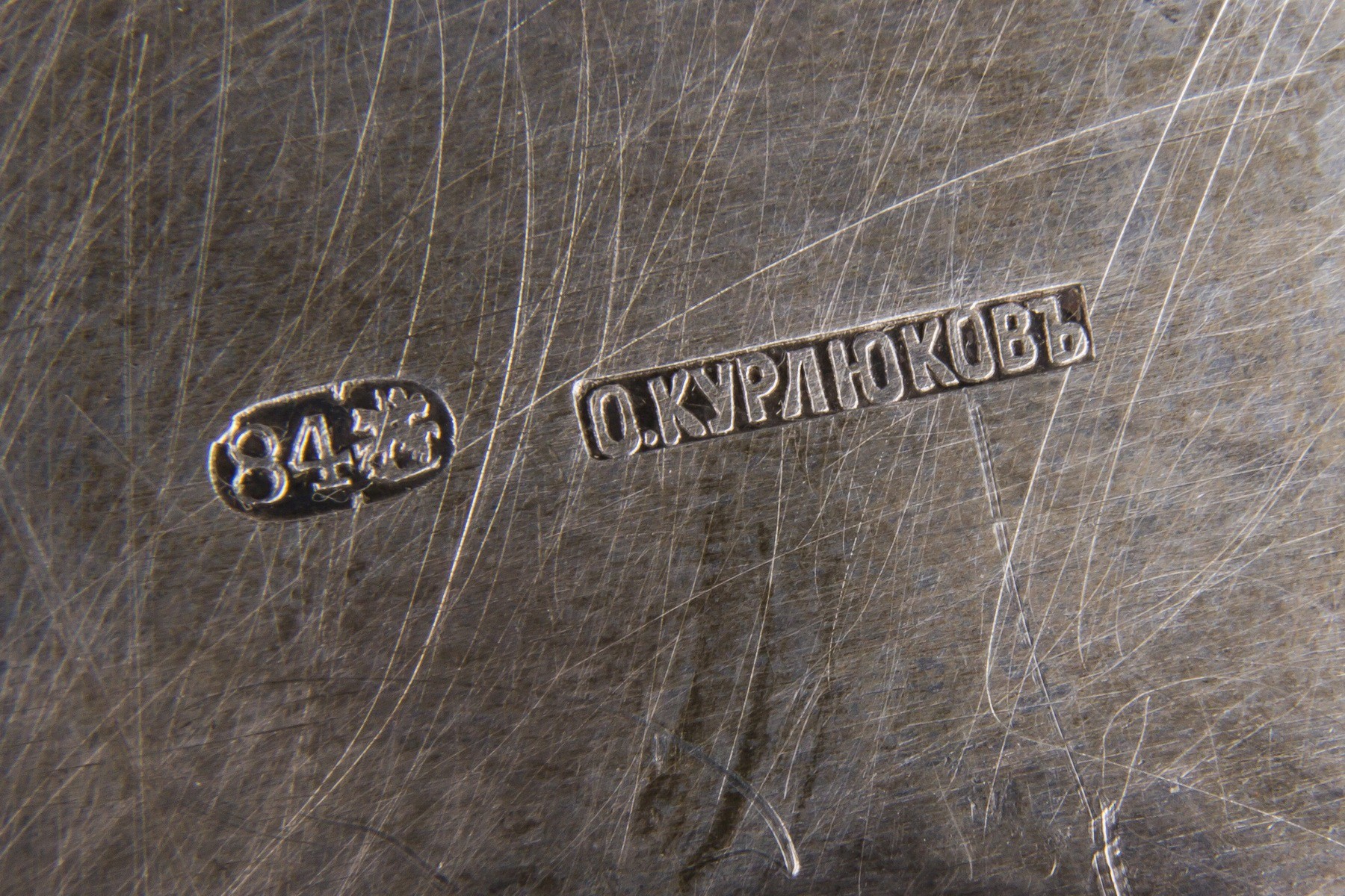 Серебро, чеканка, просечка, золочение; стекло, резьба, шлифовка. Клейма: «Георгий Победоносец на коне, поражающий копьем дракона» - городовое клеймо Москвы (1880-е); «84» - проба серебра; - «О.КУРЛЮКОВ» - фабрика серебряных изделий Ореста Федоровича Курлюкова (1884-1916) - владелец фабрики серебряных изделий (1884-1916).
