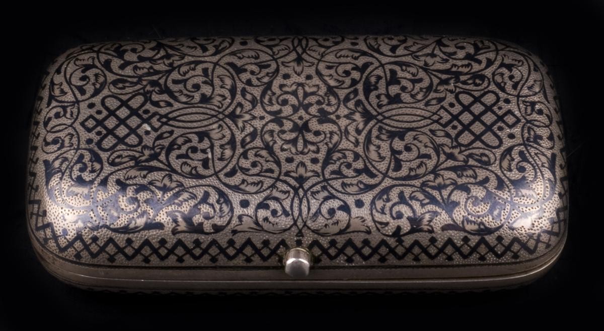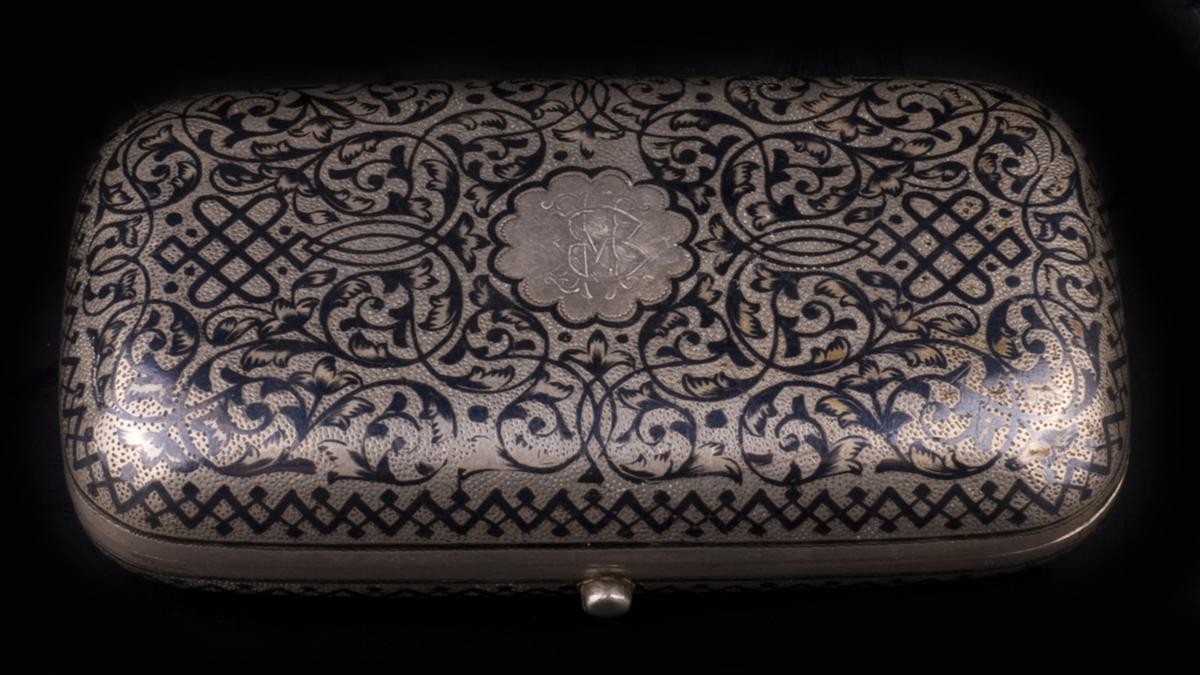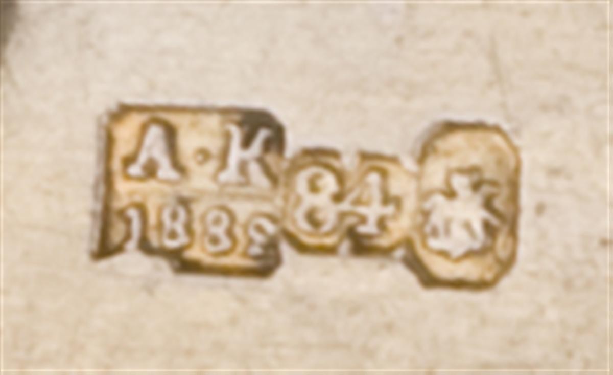 Серебро, чернь, канфарение, золочение. Клейма: «Георгий Победоносец на коне, поражающий копьем дракона» - городовое клеймо Москвы; «84» - проба серебра; «А.К» над годом «1882» - неизвестный мастер.