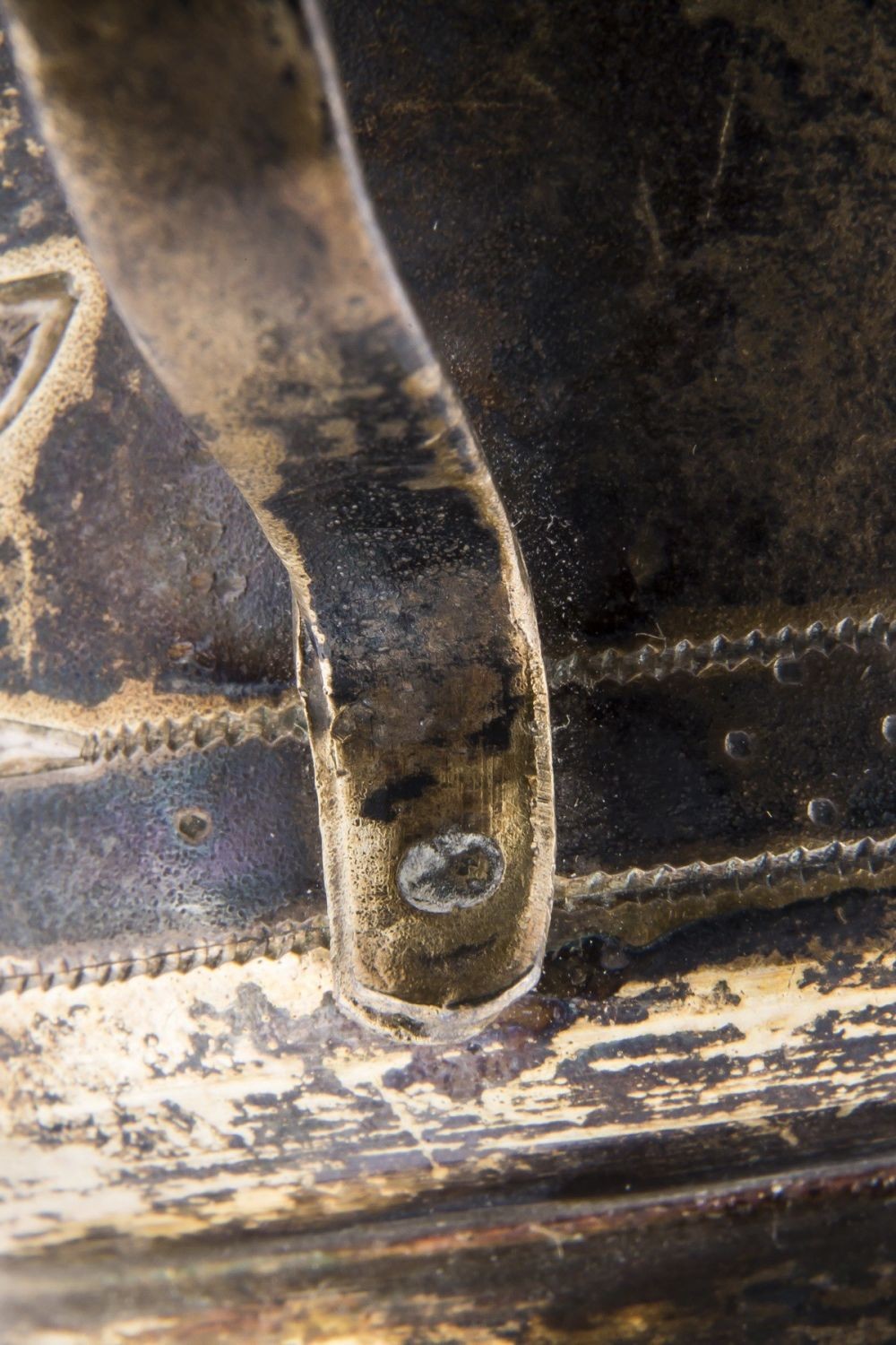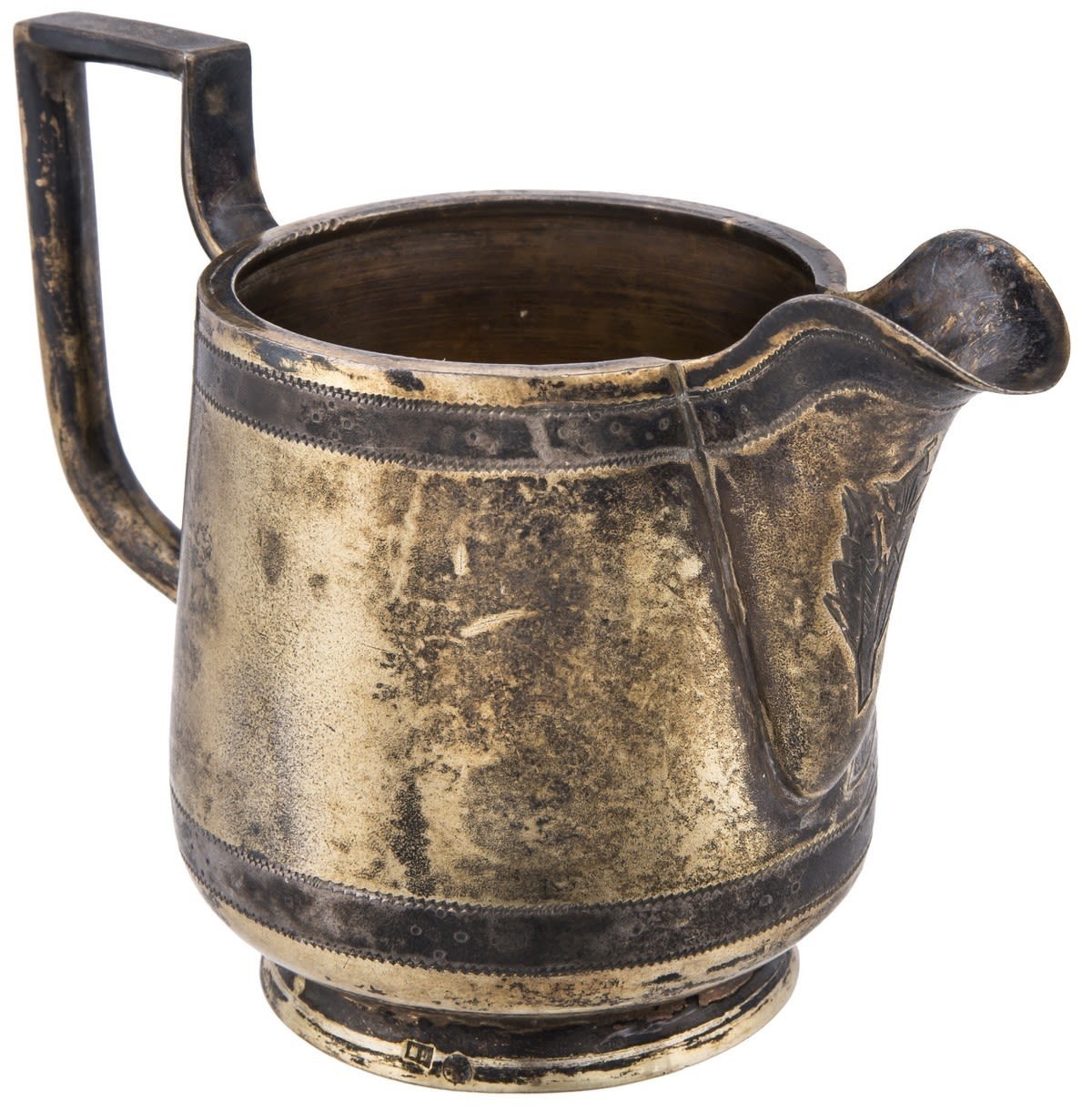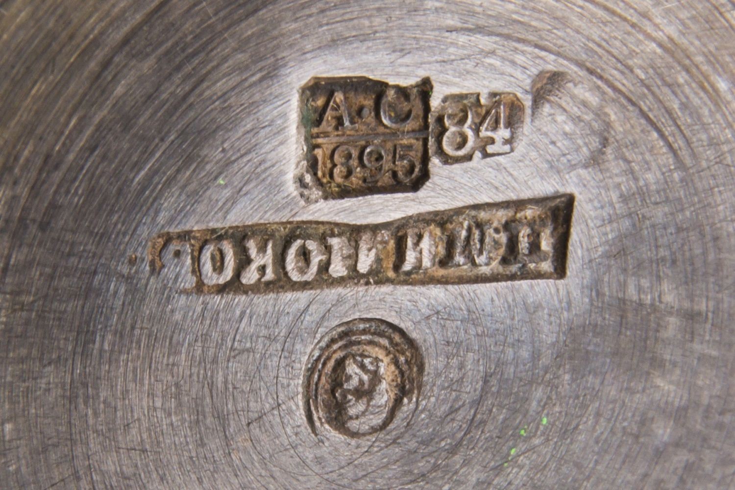 Серебро, гравировка, патинирование, золочение. Клейма: «84» - проба серебра, «П.Милюков» - владелец фабрики серебряных изделий Милюков Петр Павлович (1877-1912), «АС» - неизвестный пробирер, с годом 1895. Серебряные изделия фабрики П.П. Милюкова находятся в коллекции Государственного Исторического музея.