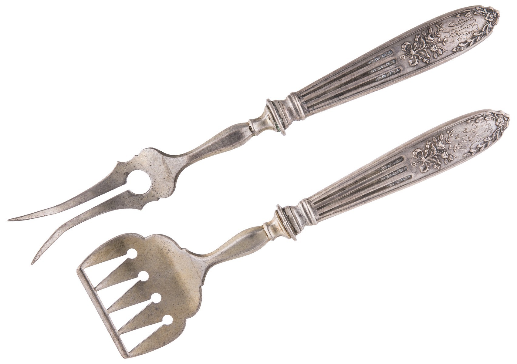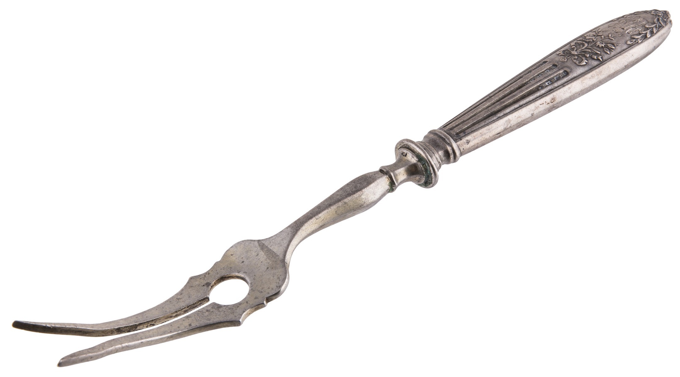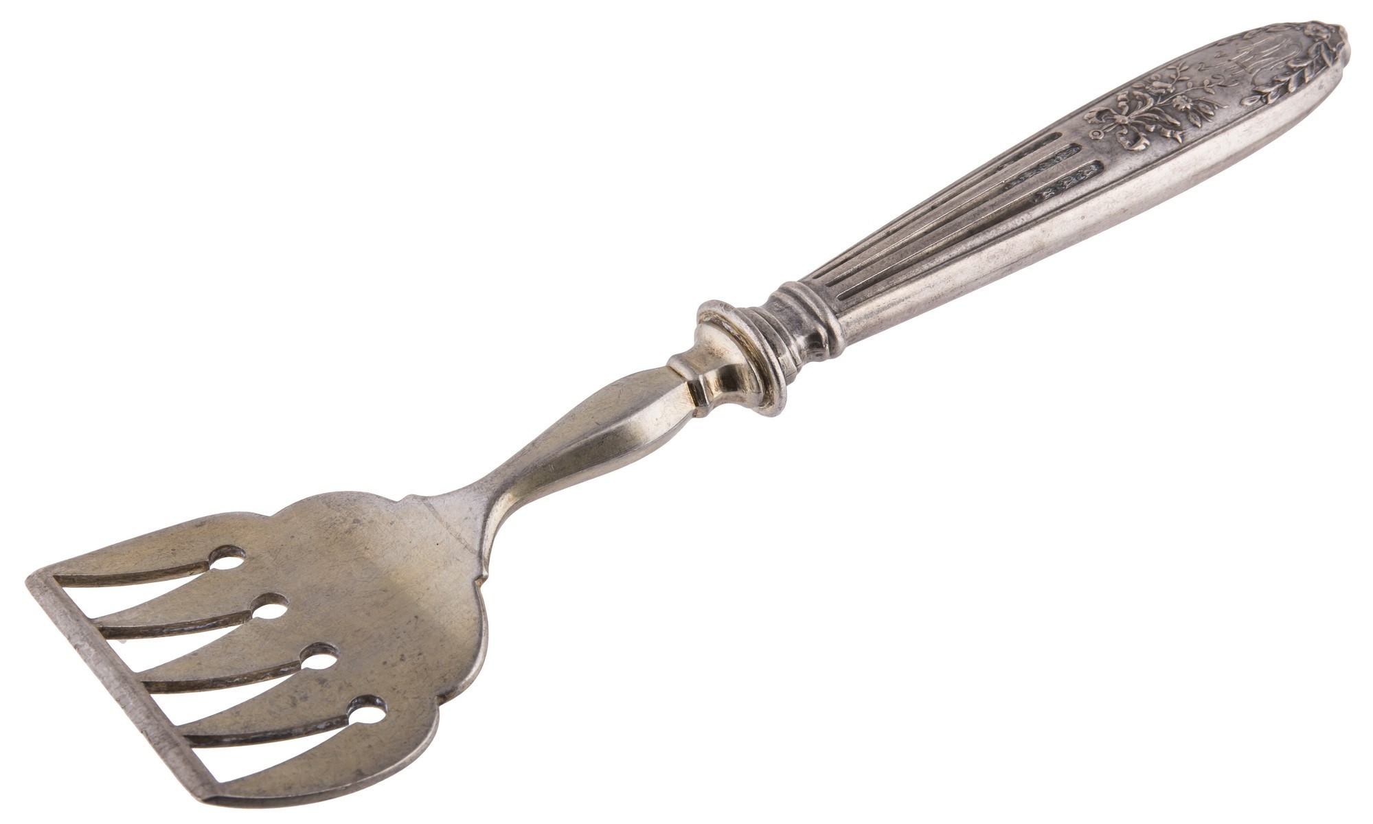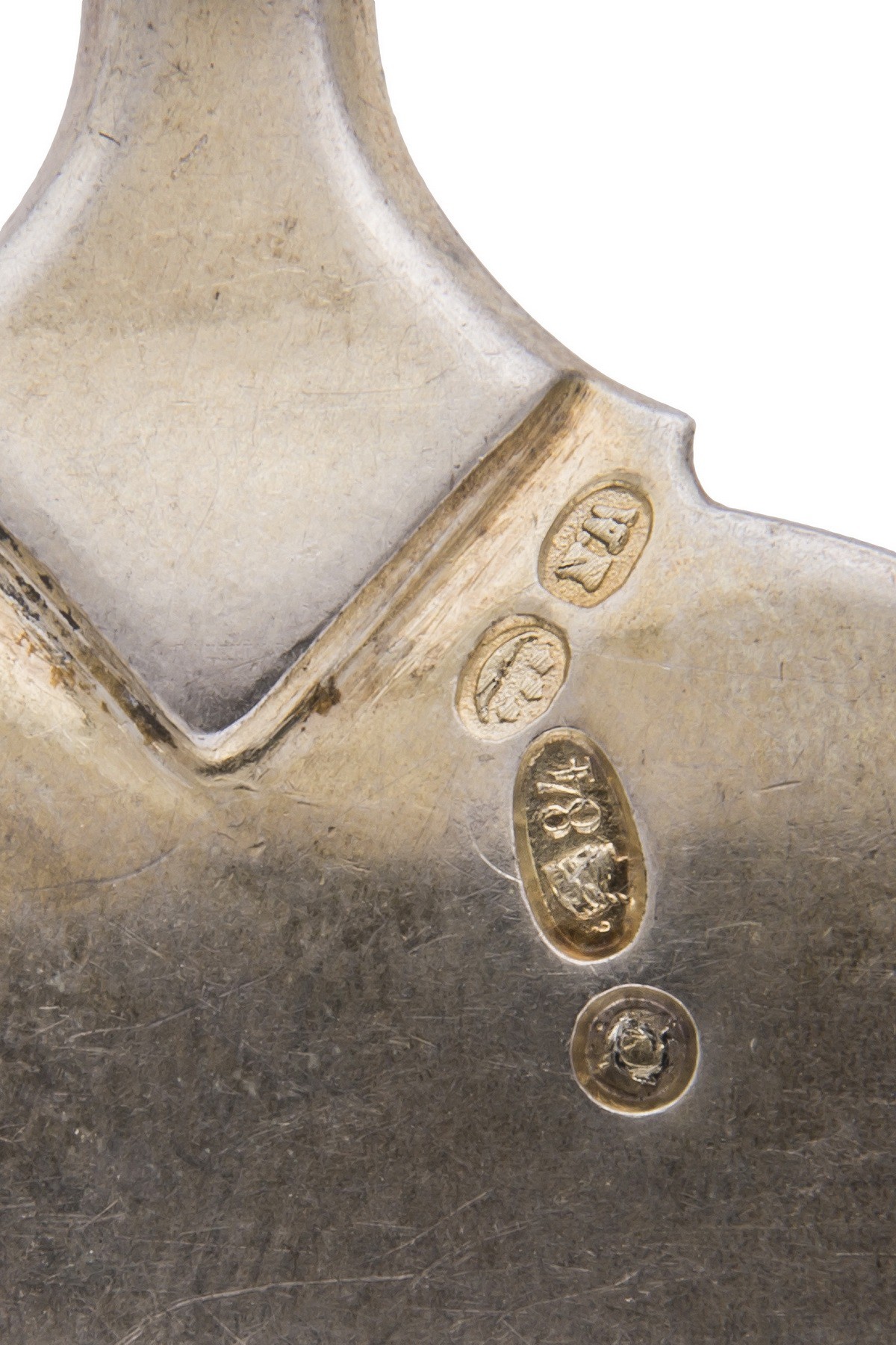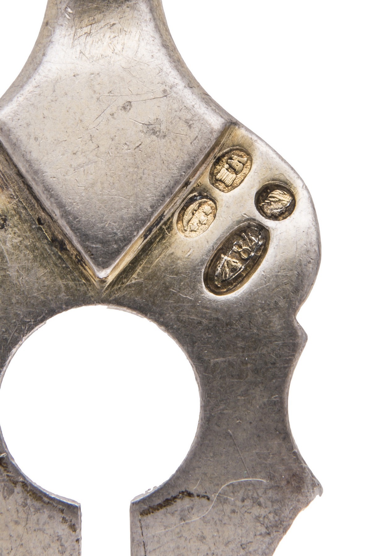 Серебро, просечка, гравировка матирование. Клейма: «женская голова в кокошнике, обращенная вправо» с литерой «О» и пробой «84» - закавказское пробирное управление и бакинский губернский пробирер (1908-1917), «женская голова в кокошнике, обращенная вправо» - клеймо окружного пробирного управления для второстепенных частей изделий (1908-1917), «W.N» - неизвестный мастер.