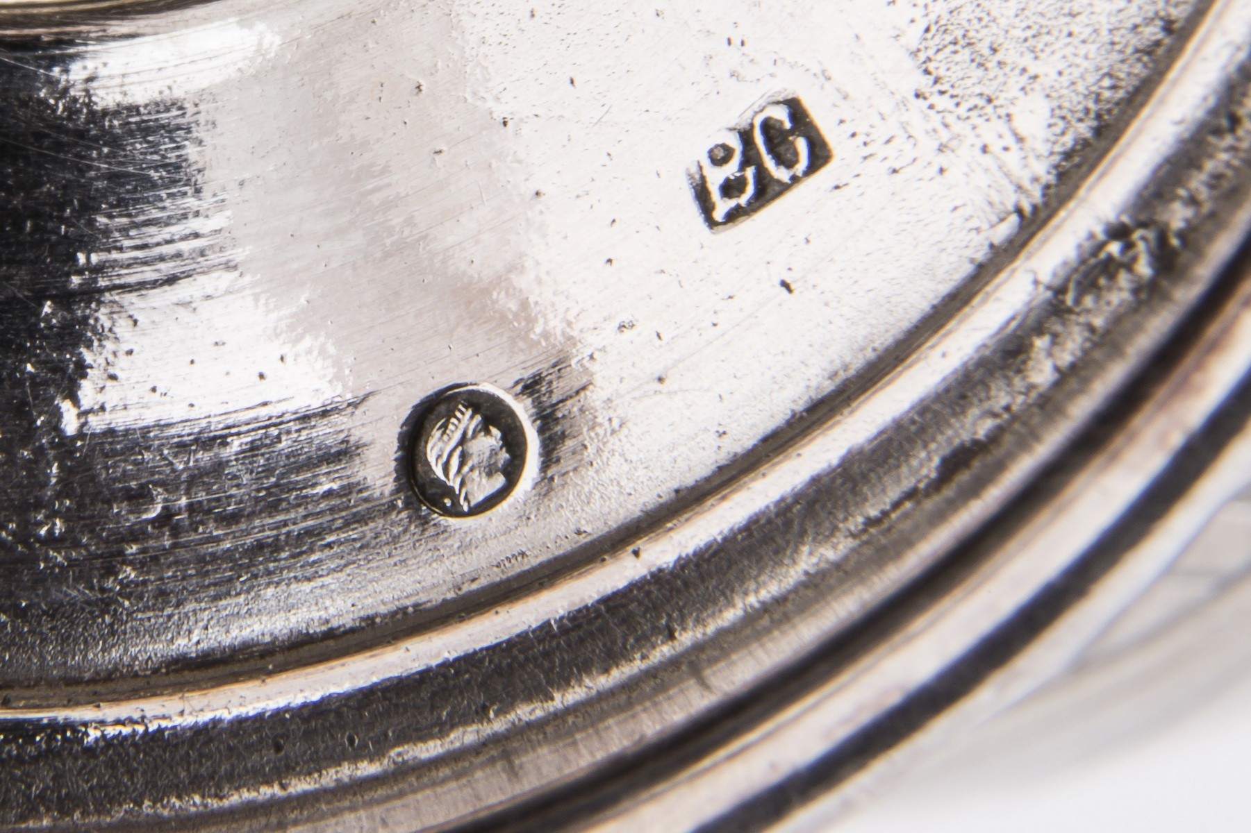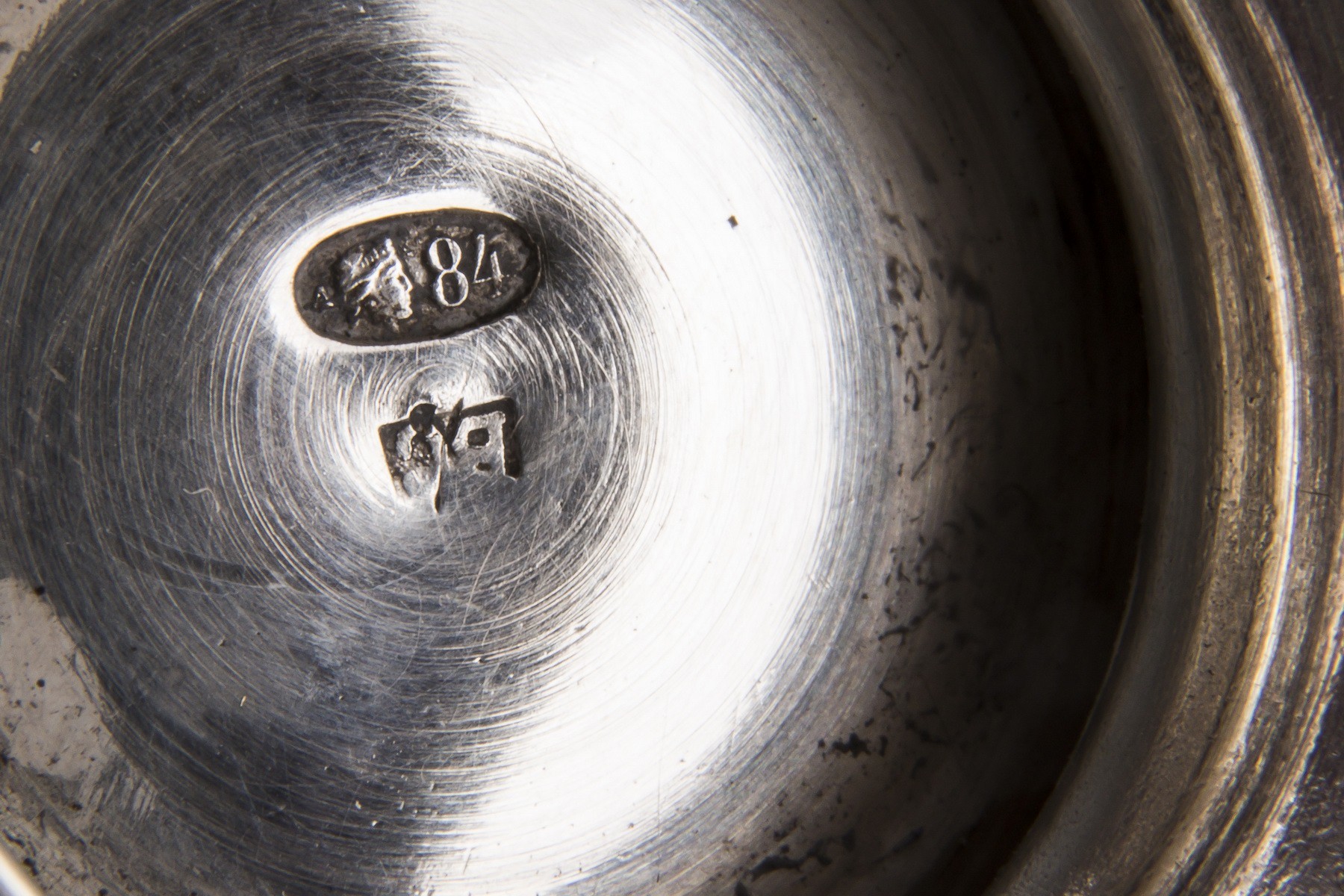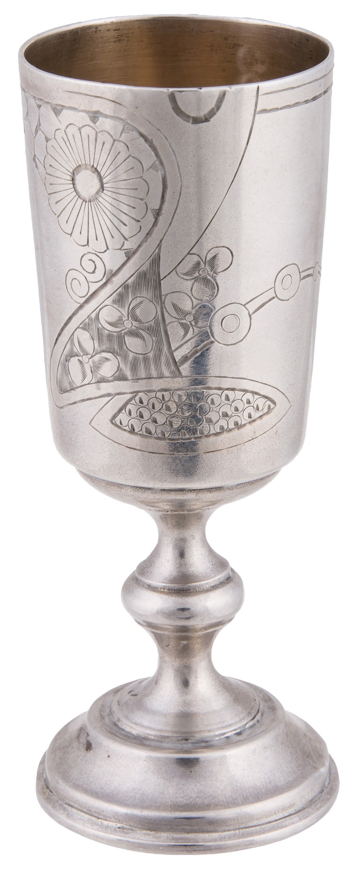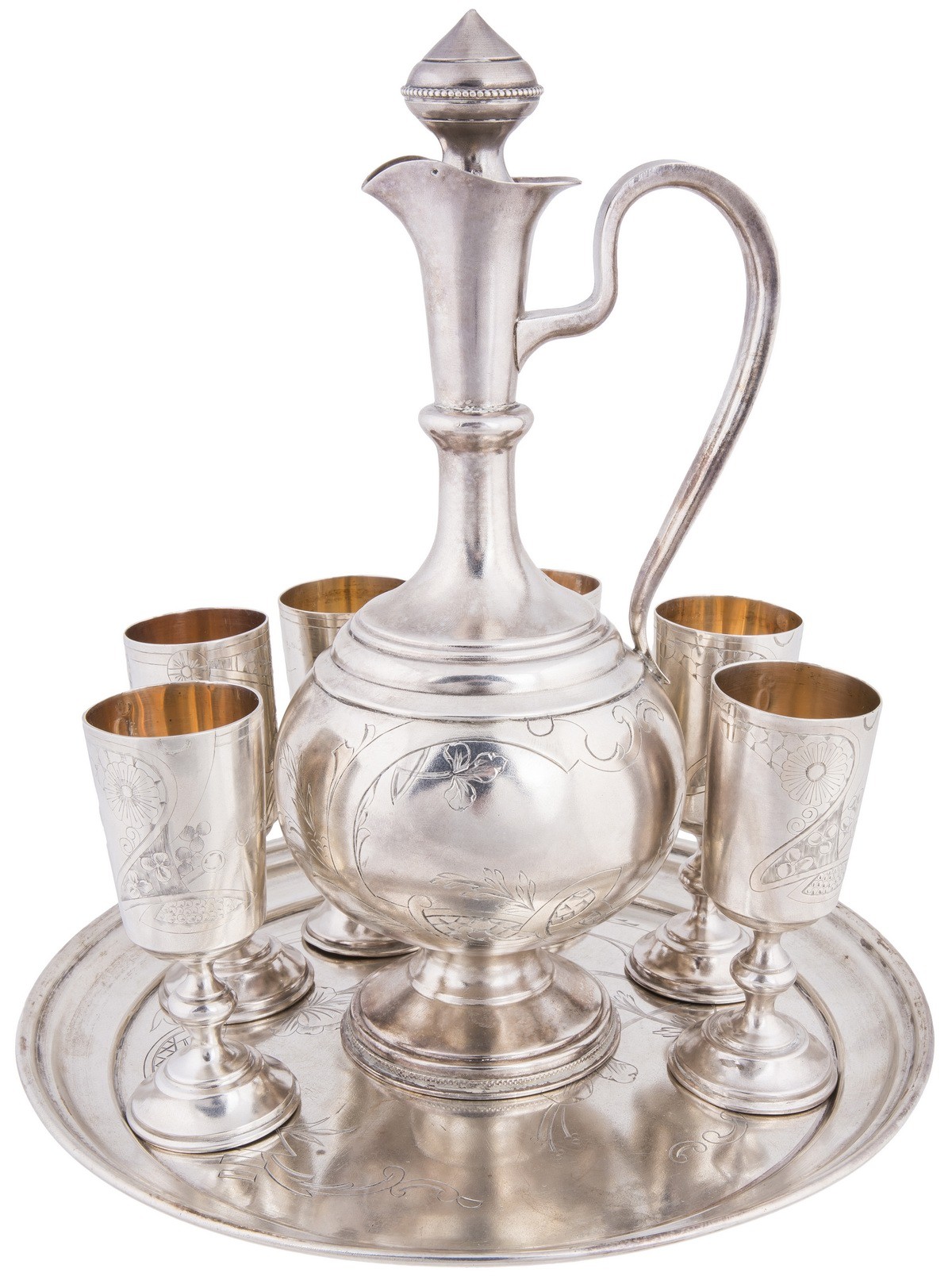 Серебро, чеканка, гравировка, золочение. Рюмки. Клейма: «женская головка в кокошнике, обращенная вправо» с «Δ и пробой «84» в овальном щитке пробирное клеймо московского окружного управления (1908-1917); «ЕС» - неизвестный мастер. Высота: 7,7 см. Поднос. Клейма: «женская головка в кокошнике, обращенная вправо» с «Δ и пробой «84" в овальном щитке пробирное клеймо московского окружного управления (1908-1917); «ВС» - мастер Семенов Василий С.; Диаметр: 7,6 см. Графин. Клейма: «женская головка в кокошнике, обращенная вправо» с Δ пробой «84» в овальном щитке пробирное клеймо московского окружного управления (1908-1917); «ВС» - мастер Семенов Василий С.; «женская головка в кокошнике, обращенная вправо» в круглом щитке - клеймо для второстепенных деталей (1908-1917). Высота: 18,7 см (с крышкой).
