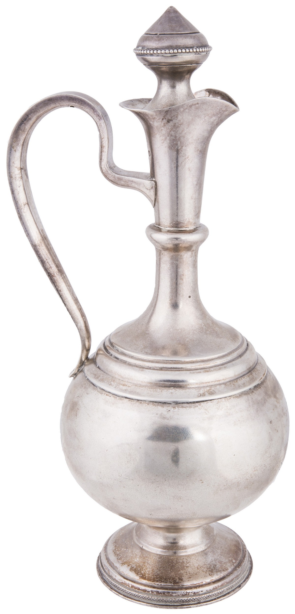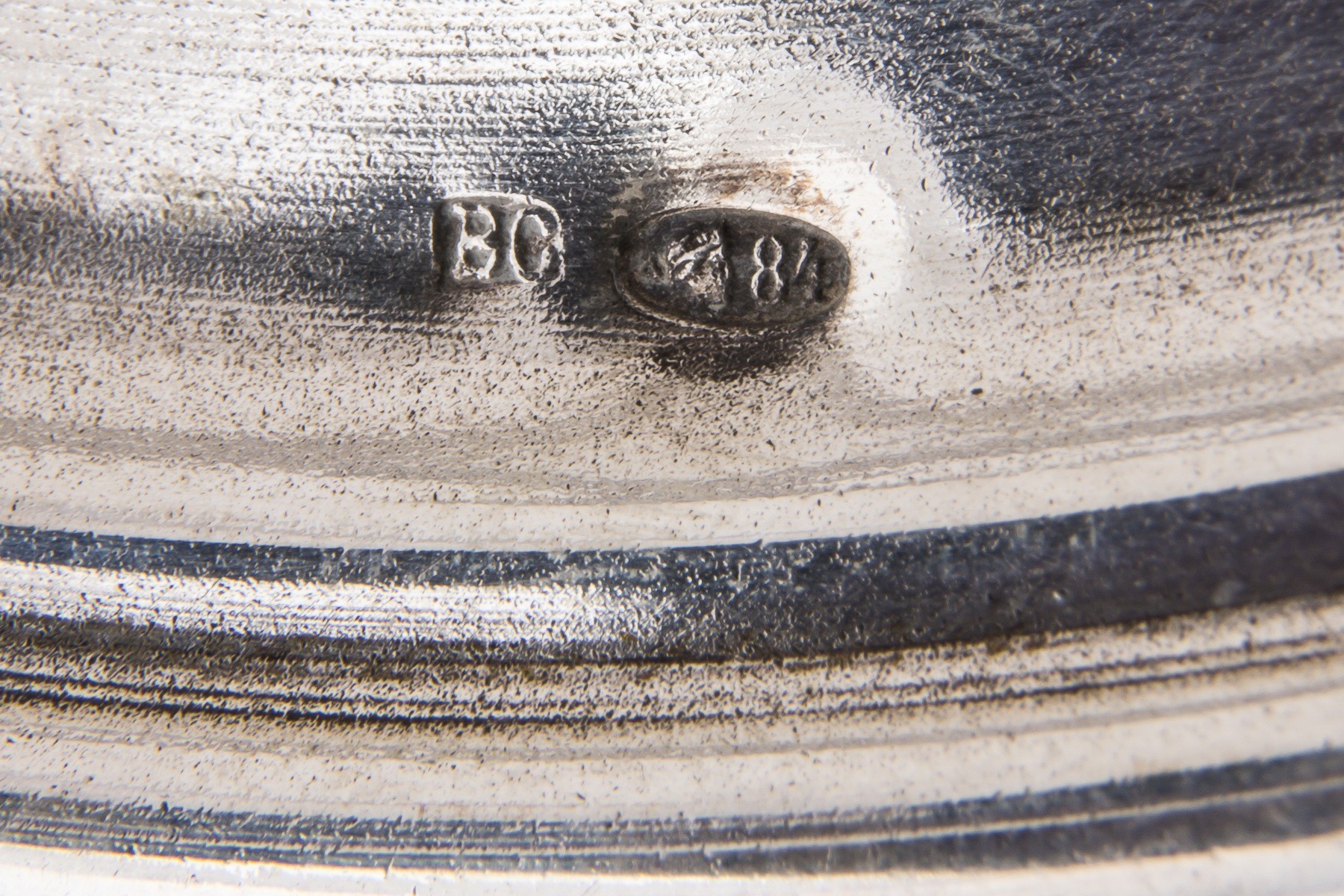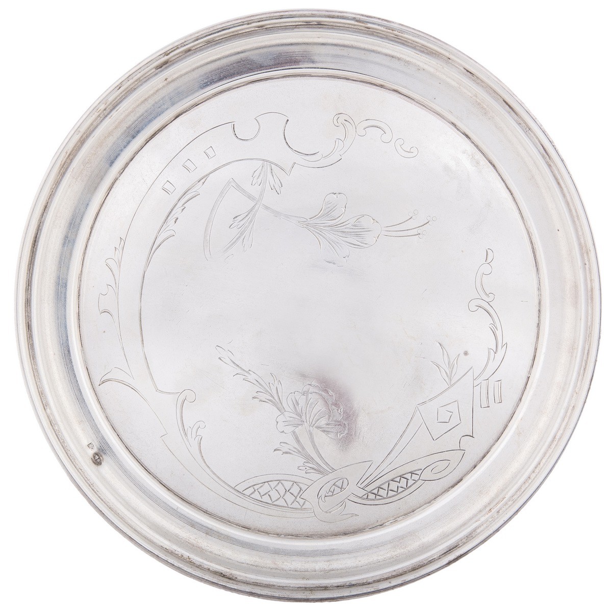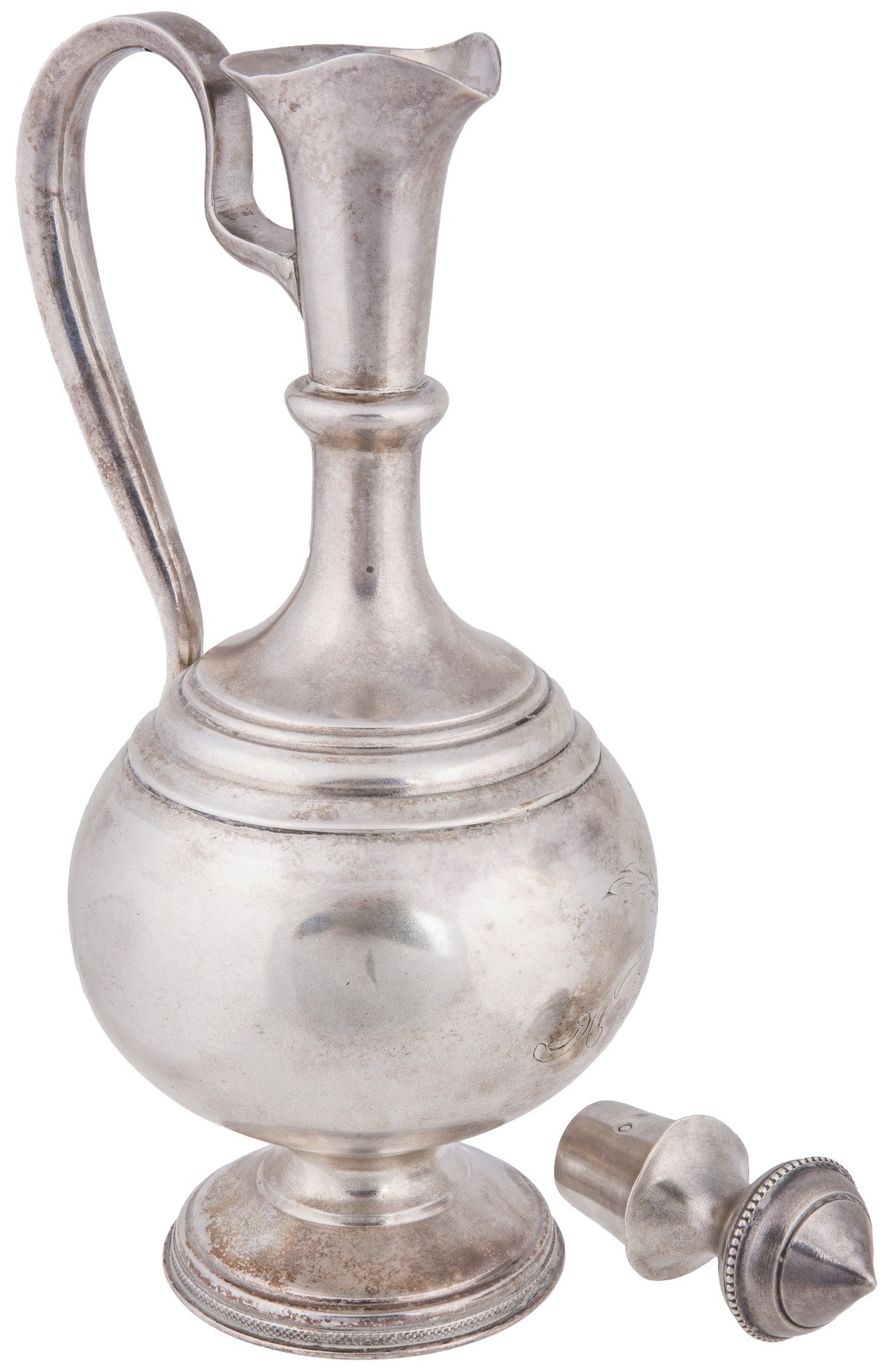 Серебро, чеканка, гравировка, золочение. Рюмки. Клейма: «женская головка в кокошнике, обращенная вправо» с «Δ и пробой «84» в овальном щитке пробирное клеймо московского окружного управления (1908-1917); «ЕС» - неизвестный мастер. Высота: 7,7 см. Поднос. Клейма: «женская головка в кокошнике, обращенная вправо» с «Δ и пробой «84" в овальном щитке пробирное клеймо московского окружного управления (1908-1917); «ВС» - мастер Семенов Василий С.; Диаметр: 7,6 см. Графин. Клейма: «женская головка в кокошнике, обращенная вправо» с Δ пробой «84» в овальном щитке пробирное клеймо московского окружного управления (1908-1917); «ВС» - мастер Семенов Василий С.; «женская головка в кокошнике, обращенная вправо» в круглом щитке - клеймо для второстепенных деталей (1908-1917). Высота: 18,7 см (с крышкой).
