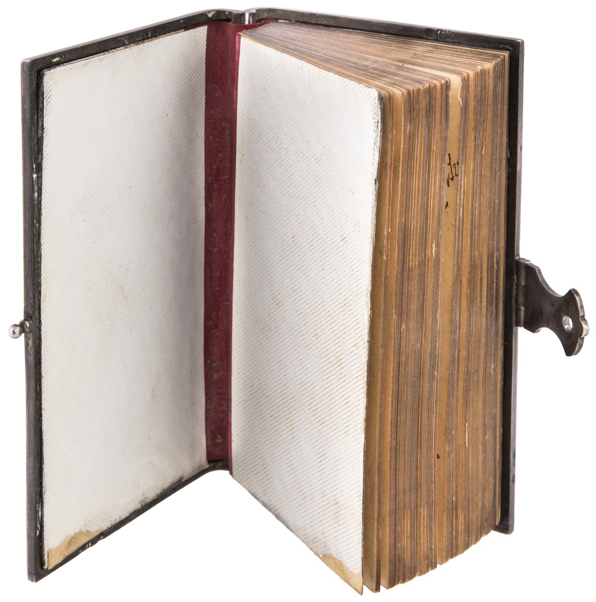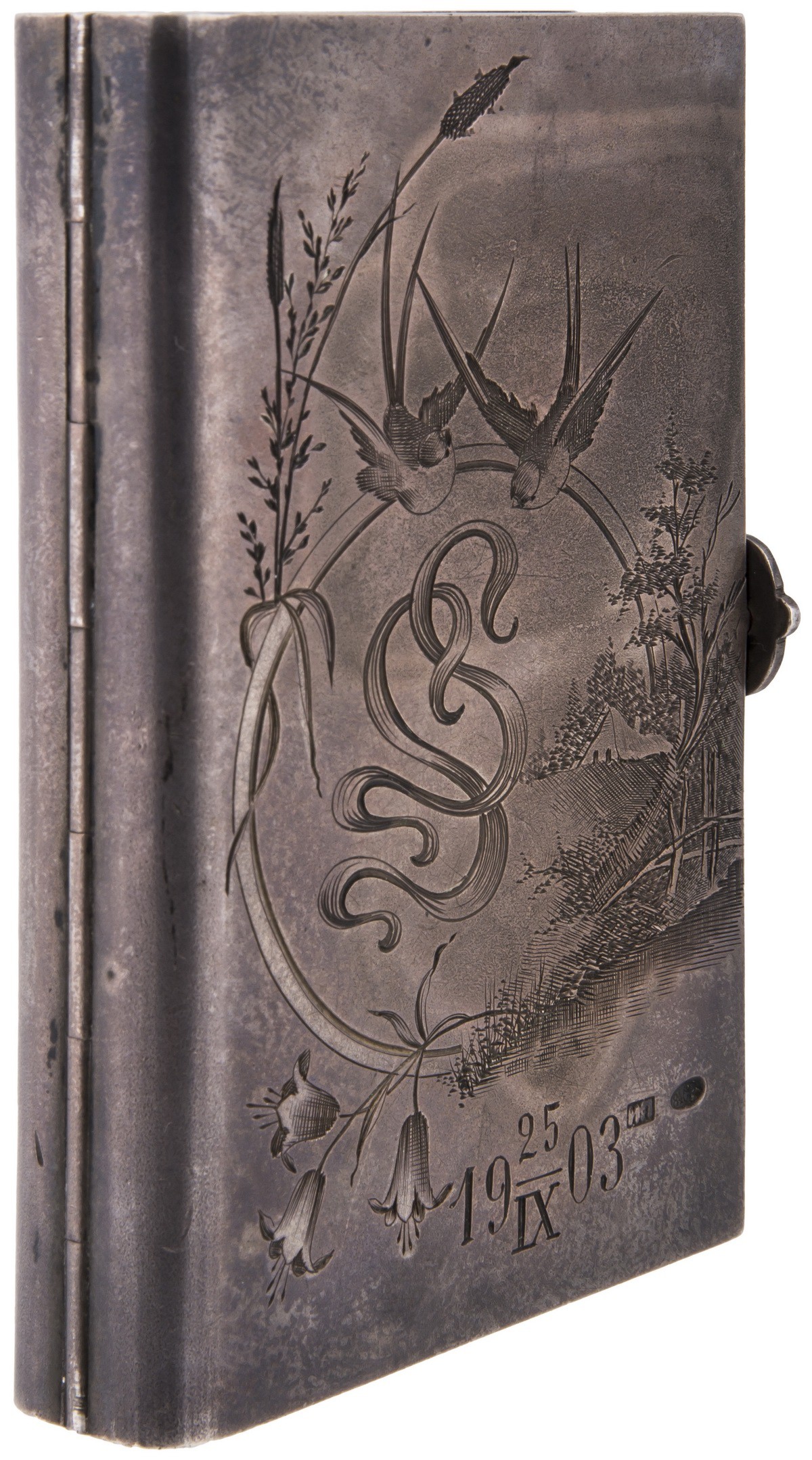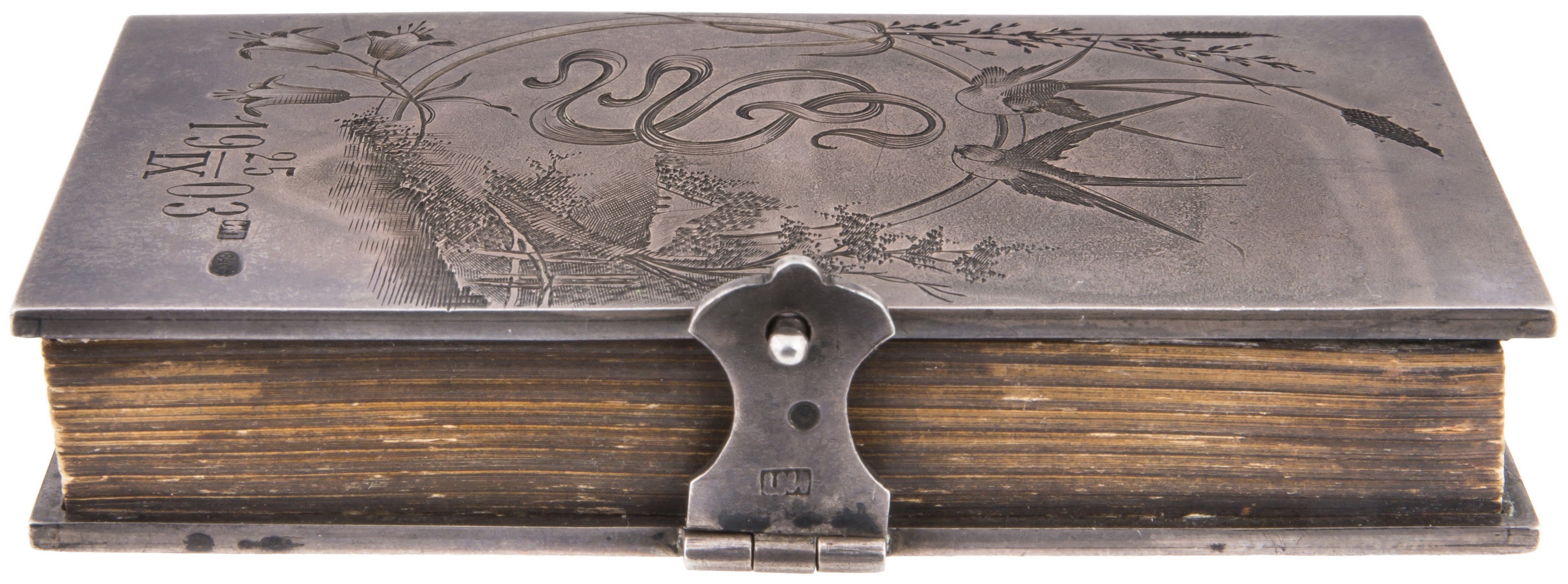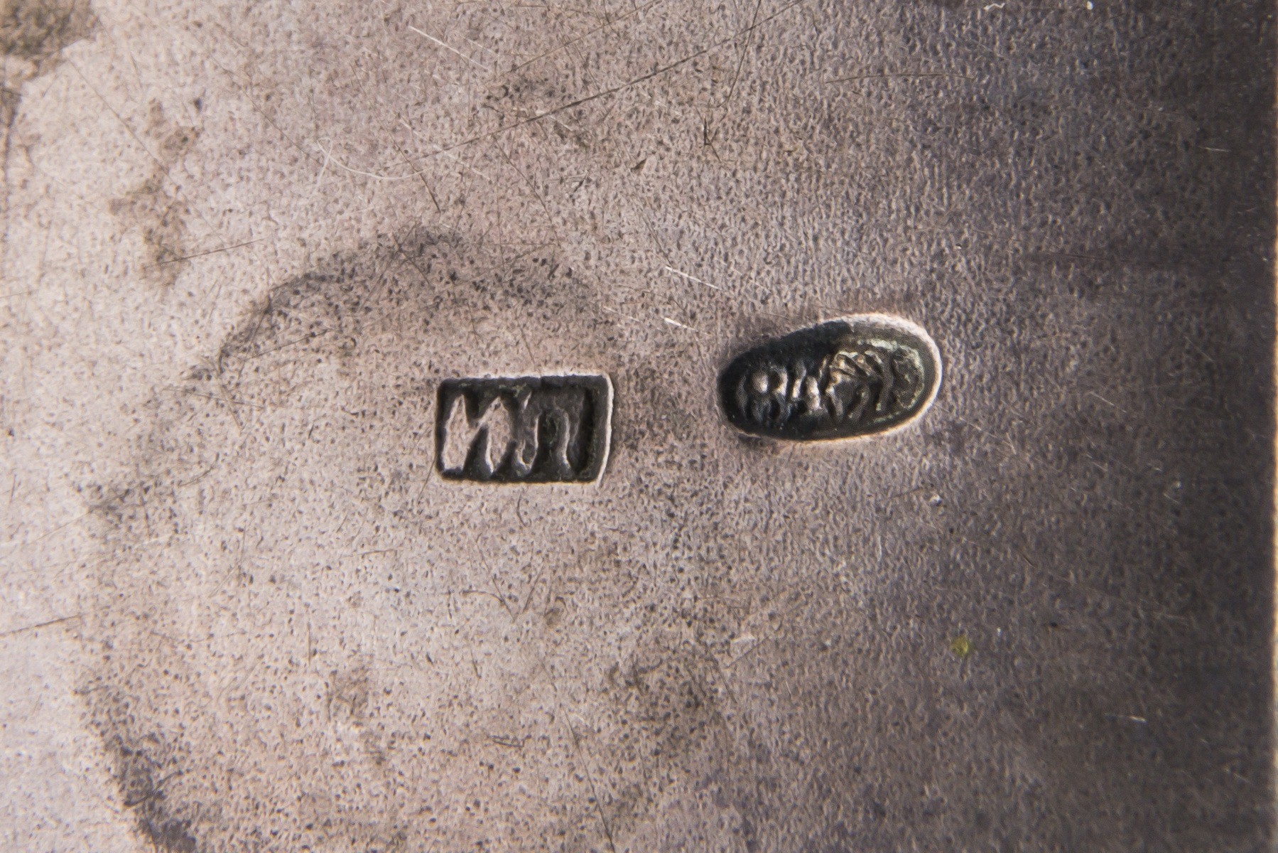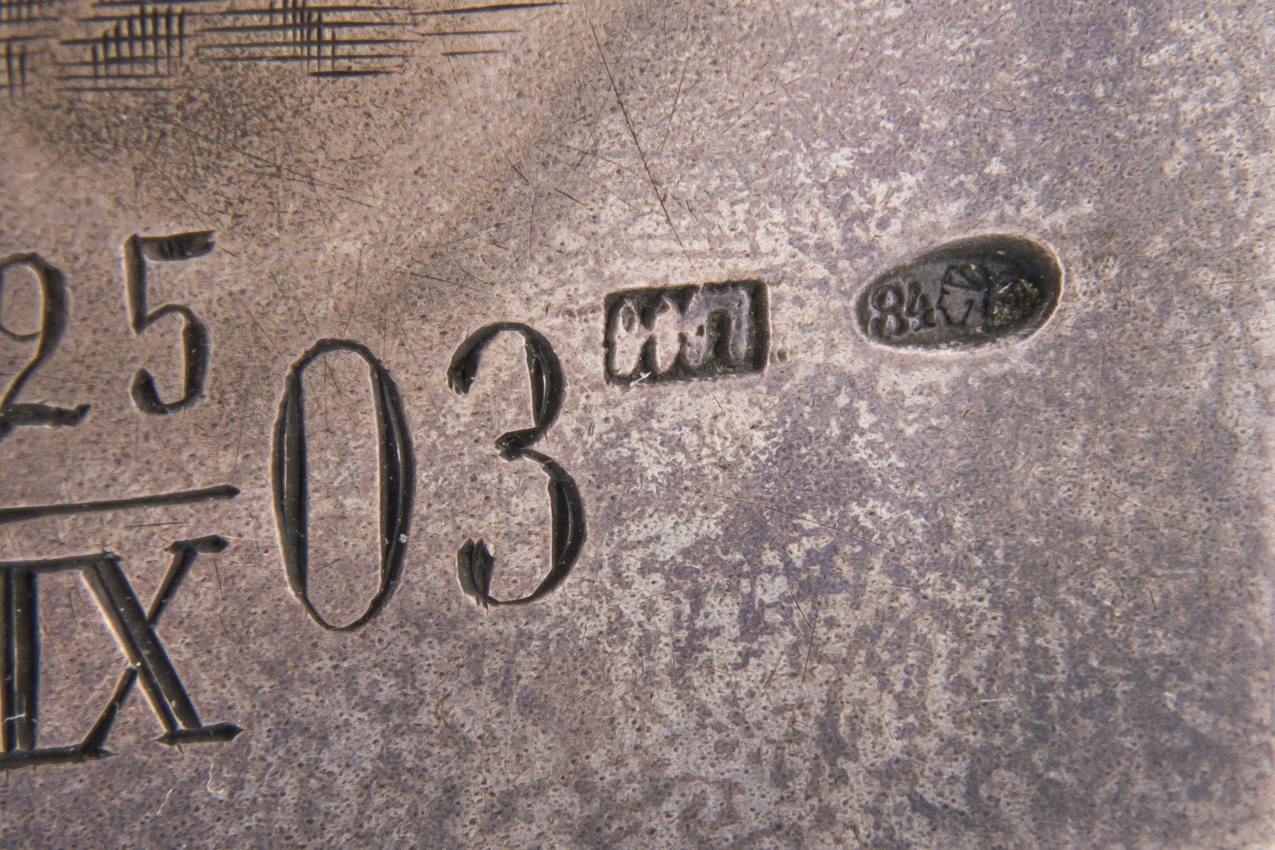 Серебро, чеканка, гравировка; бумага. Клейма: «женская голова в кокошнике, повернутая влево» - клеймо для серебряных изделий (1899-1908), «84» - проба серебра, «ИП» - мастер Прокофьев И.Л. (работал в последней четверти XIX века). Серебряный стакан мастера Прокофьева И.Л. находится в коллекции Государственного Исторического музея (инв. № ОК 18879).