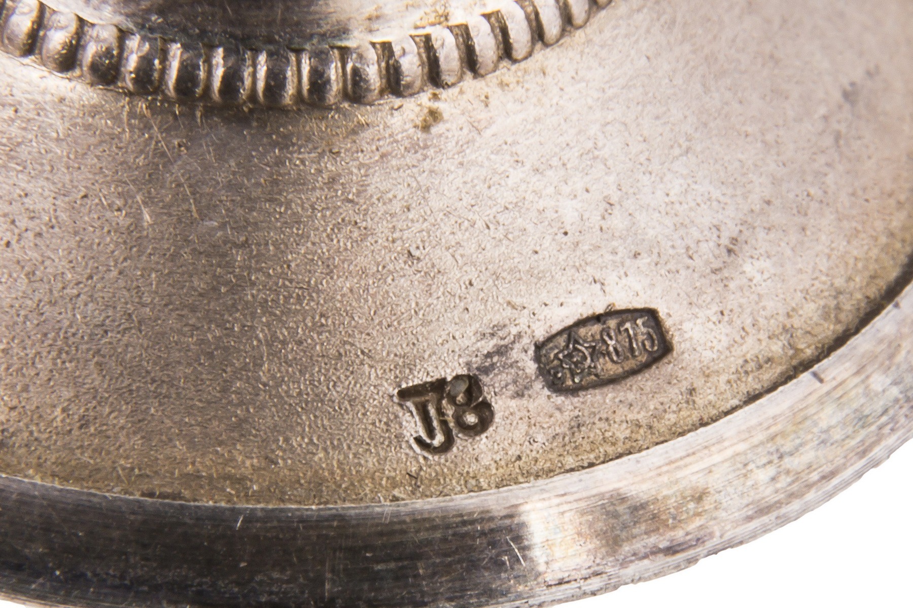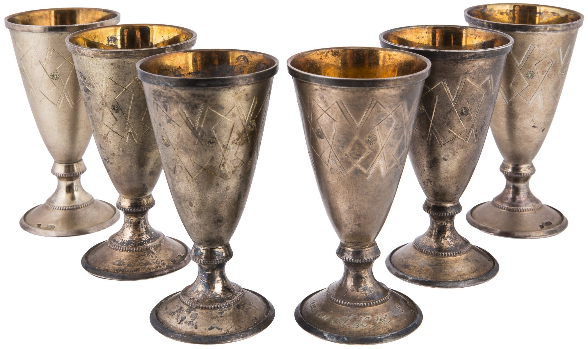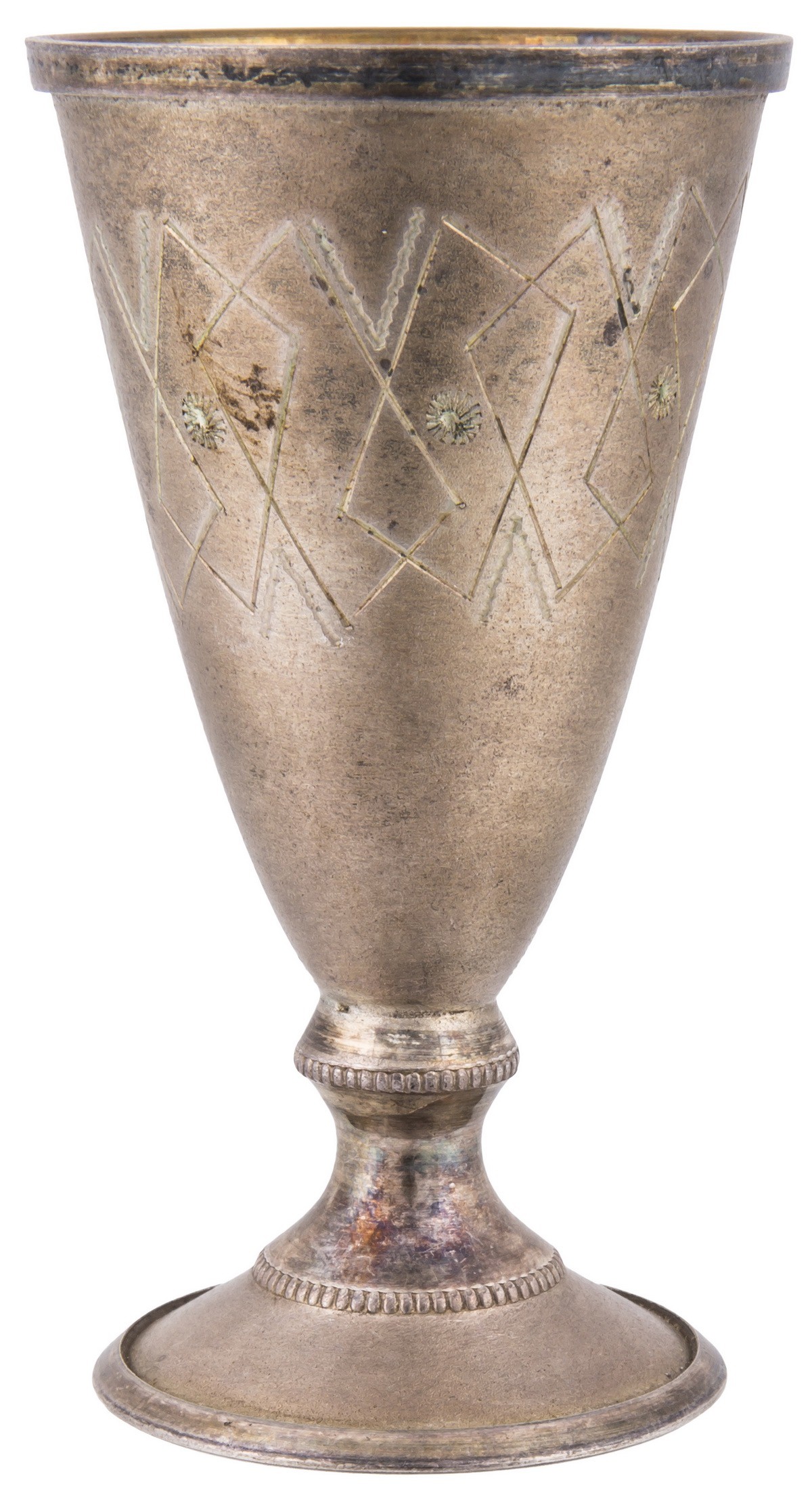 Серебро, чеканка, матирование, золочение. Клейма: проба «875» с эмблемой серпа и молота на фоне пятиконечной звезды - советское пробирное клеймо, шифр фабрики неразбор., «JC» - неизвестный мастер.