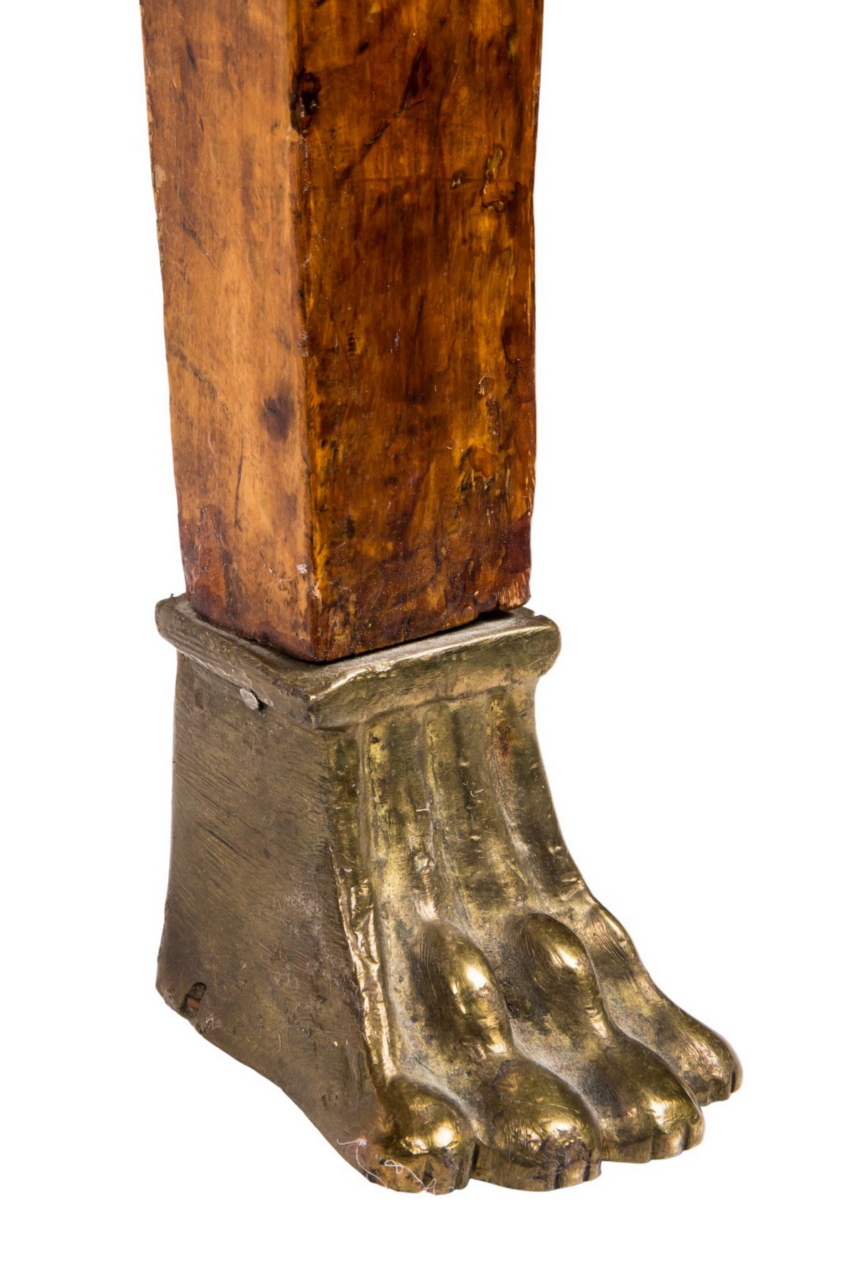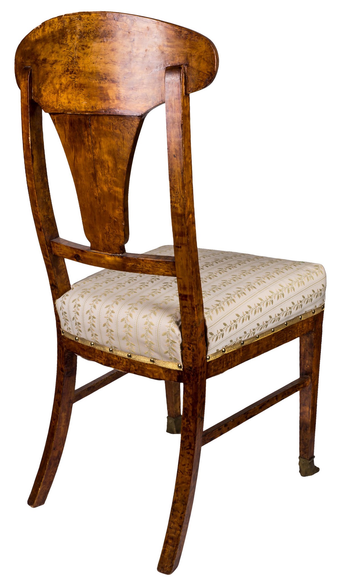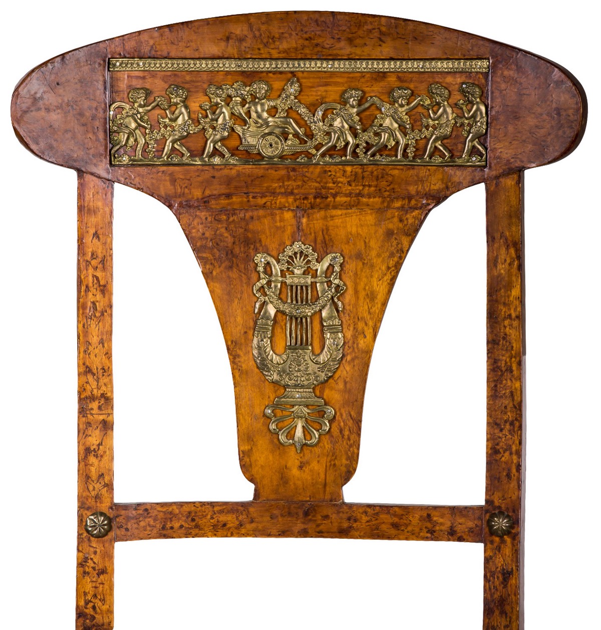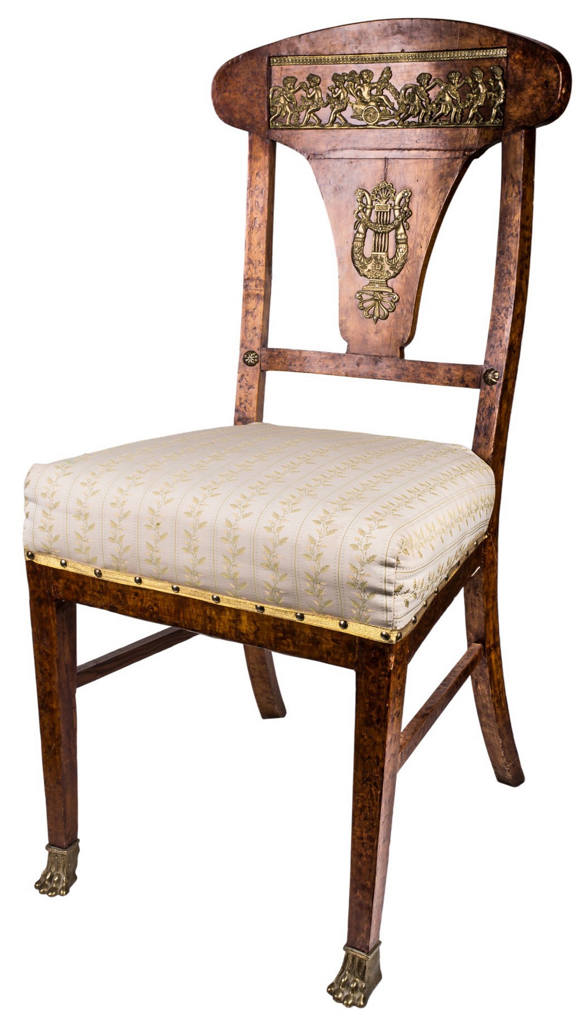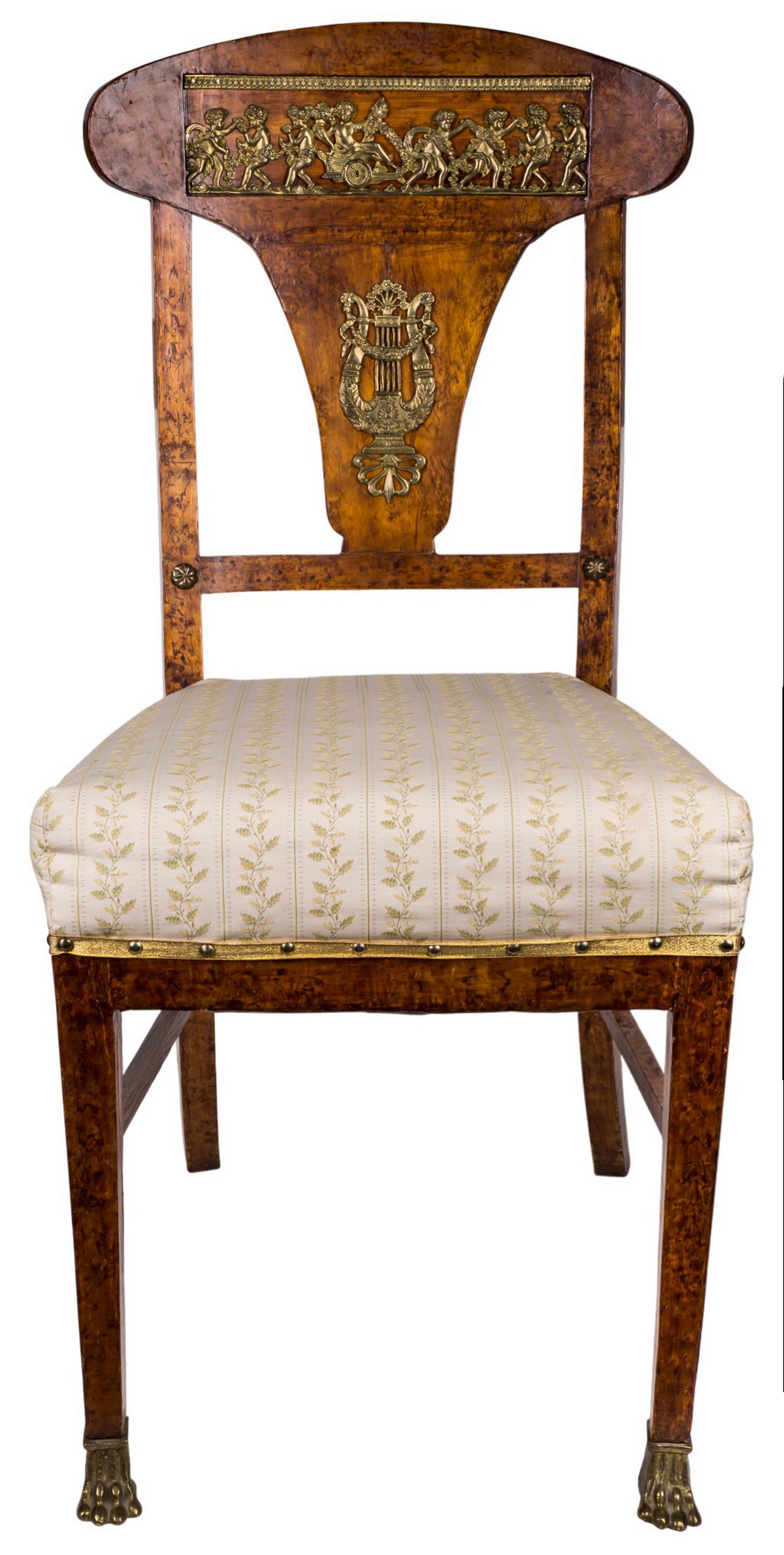 Карельская береза. Спинка украшена в верхней части бронзовыми накладками, изображающими мифологическую сцену, в нижней части — изображающими лиру. Передние ножки выполнены в виде лап. Обивка - ткань.