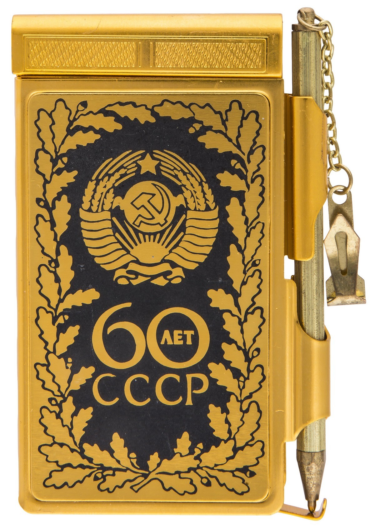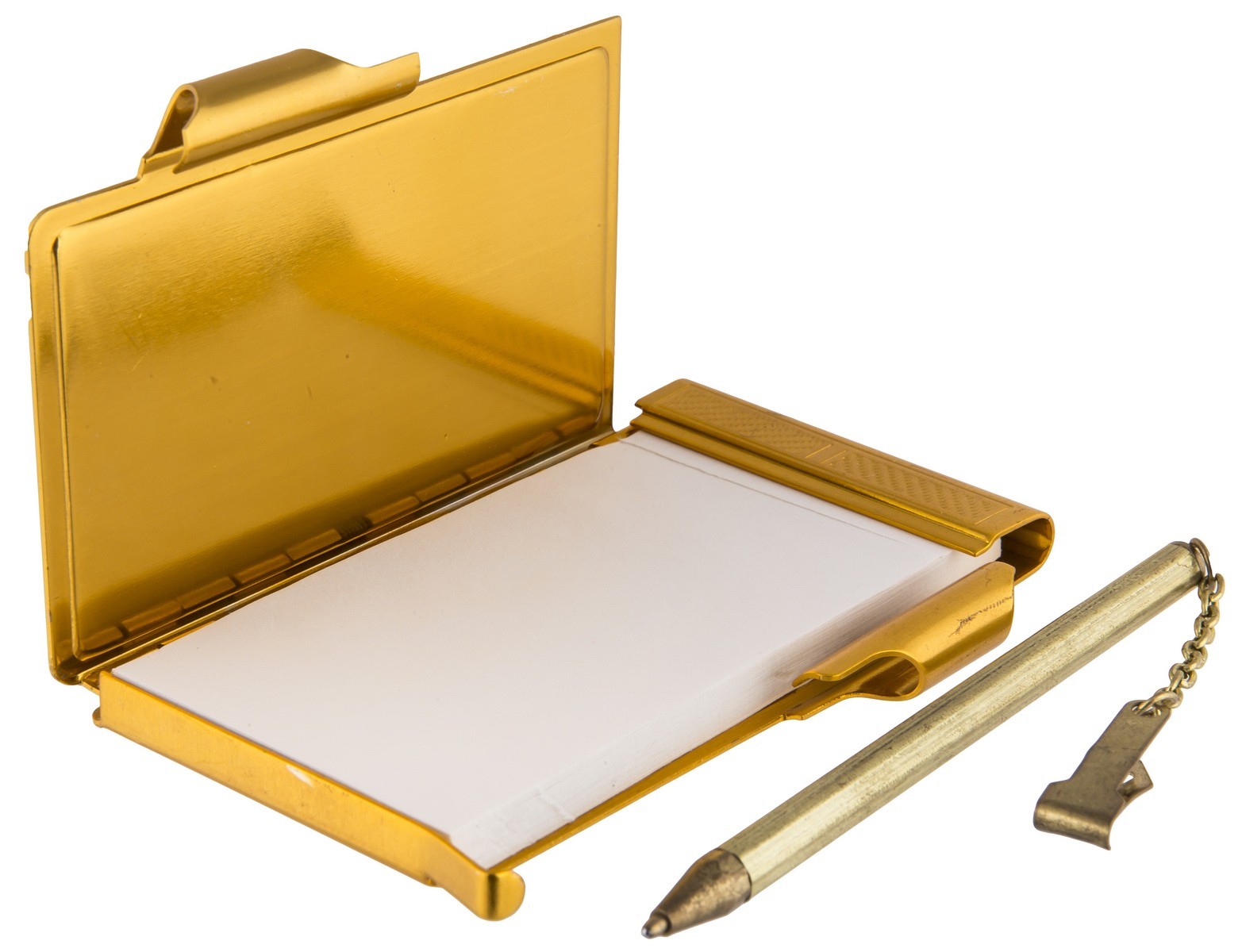 Желтый металл, бумага. Штамповка. В оригинальном футляре. С ручкой и дополнительными листами.