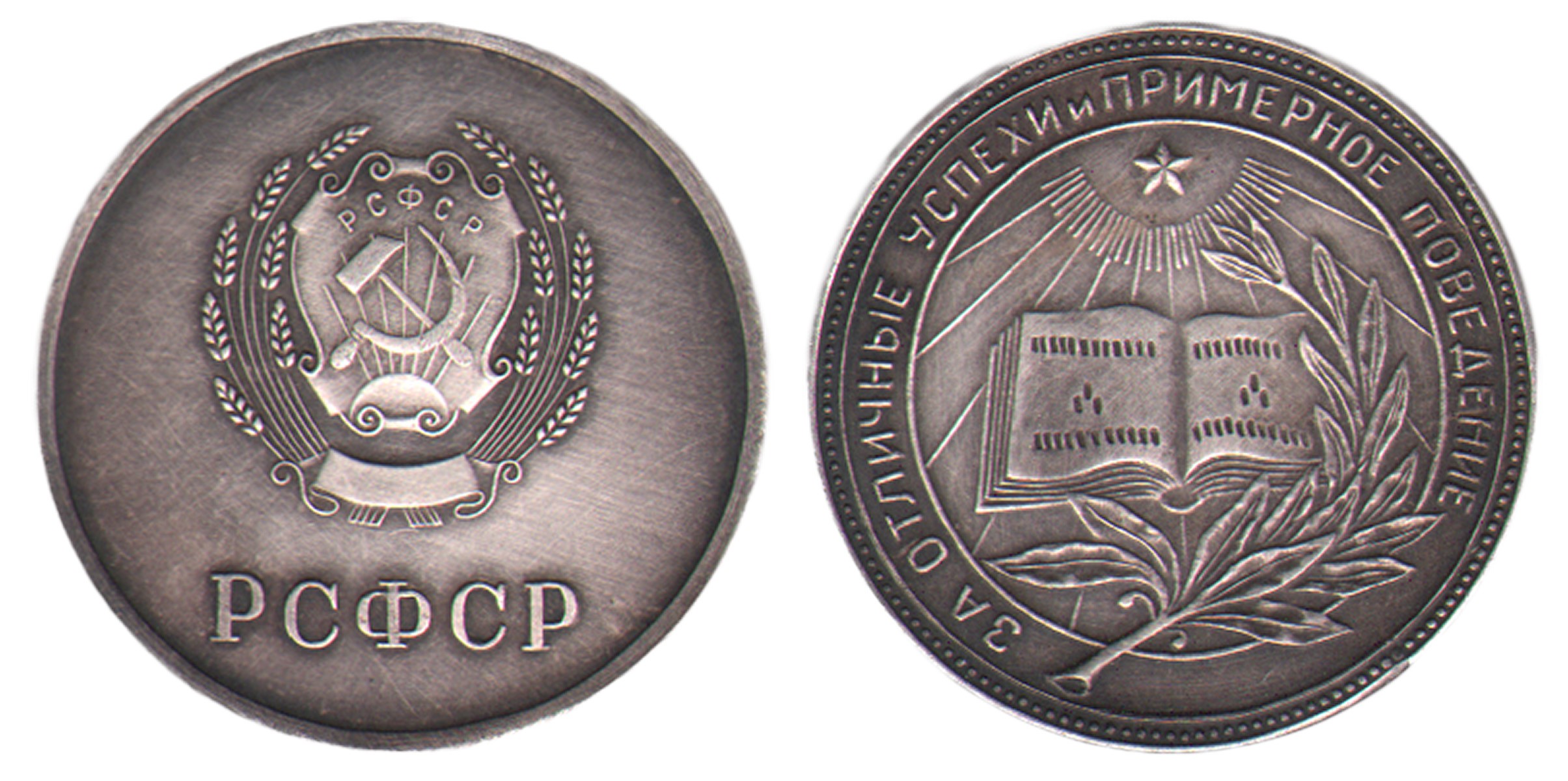 Диаметр 32 мм. В.Н. Веселов, В.А. Головнёв. Школьные медали и документы РСФСР и СССР (1918-1991 гг) № 1.10б. 1947-1953 гг. Верхний луч звезды на (Р/И).