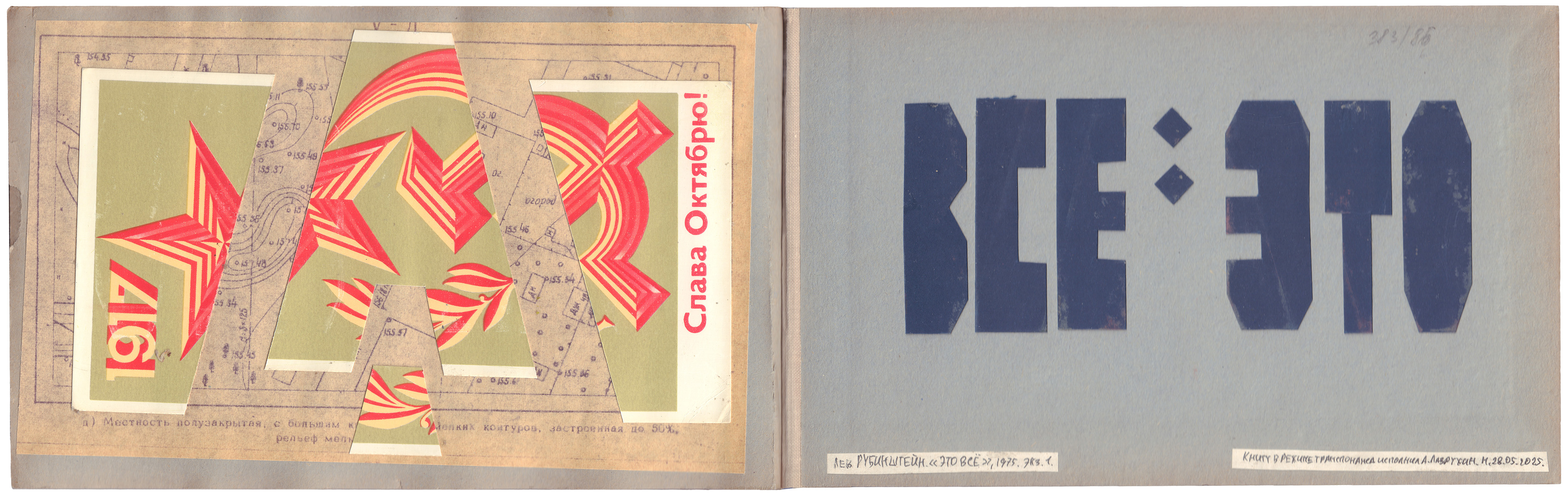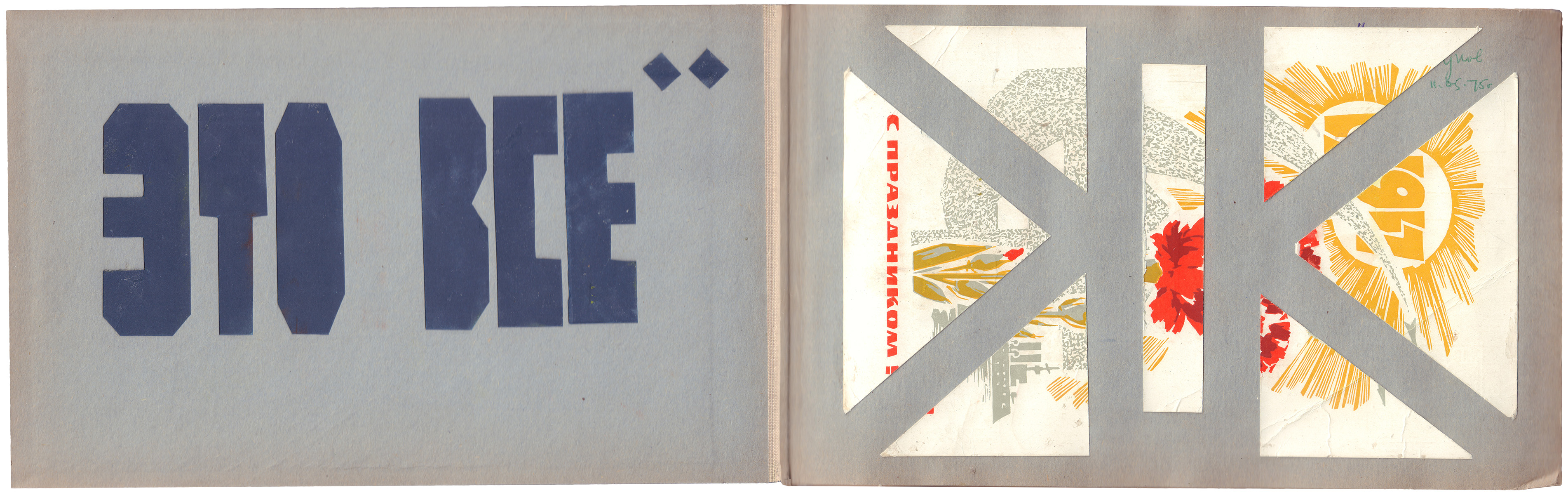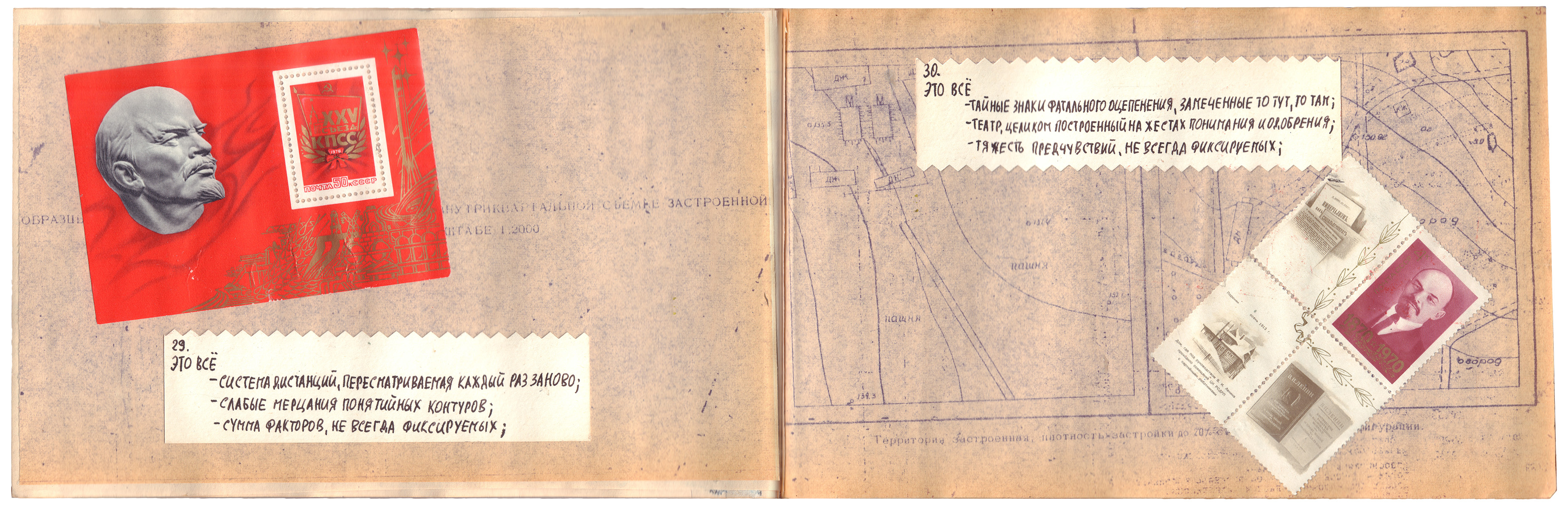 Концептуальный арт-объект, определяемый самим автором как «книга художника». Рукописный текст на вклейках. В оформлении использованы марки, открытки, фрагменты журналов и газет, а также фрагменты альбома «Образцы для определения категорий трудности при мензульной и тахеометрической съёмке...» с топографическими картами типов местностей.