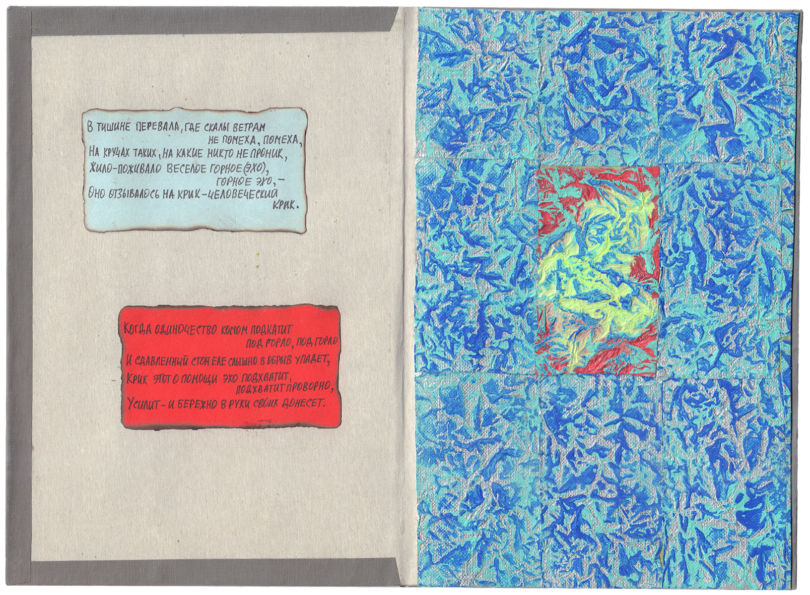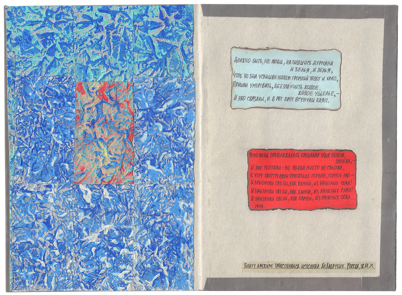 Концептуальный арт-объект, определяемый самим автором как «книга художника». Рукописный текст на вклейках.