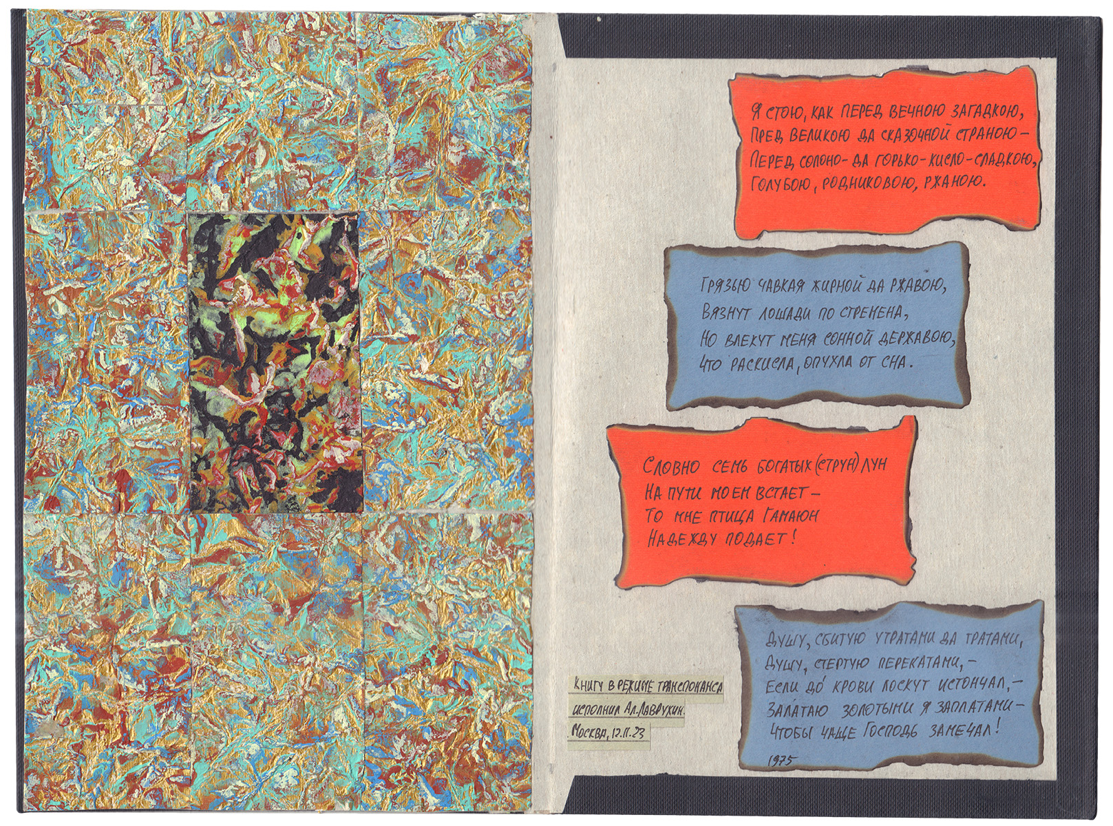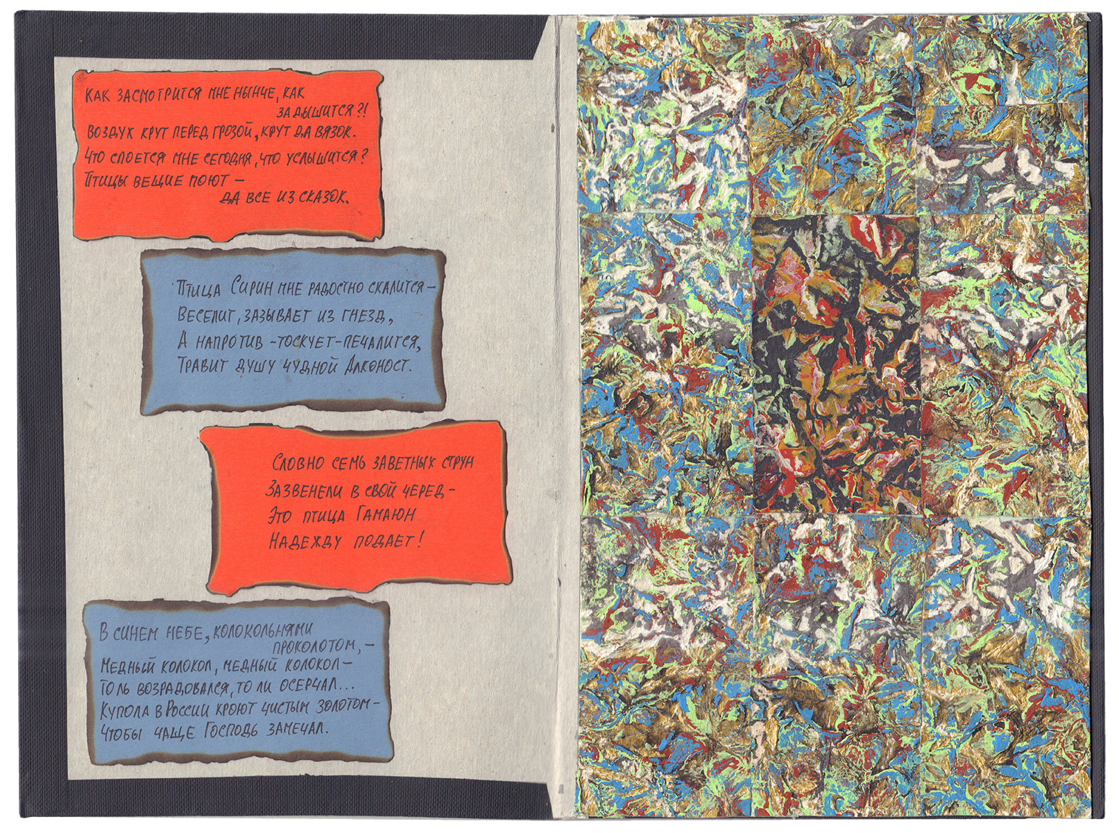 Концептуальный арт-объект, определяемый самим автором как «книга художника». Рукописный текст на вклейках.