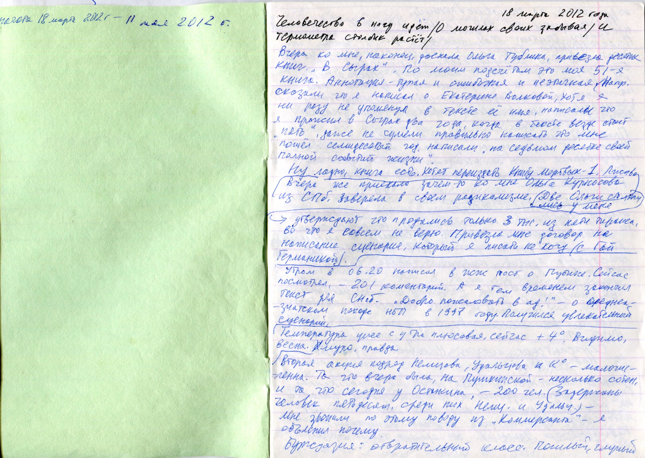 В тетради - черновики 21 стихотворения и набросков, записанные в строчку через слэш. 12 из них не опубликованы, в частности - "Я азиат, крепленое вино... / И я горжусь породой азиата. / Я внук и сын обычного солдата, / российского солдата все равно". Лимонов делает записи почти каждый день. Размышления о политической ситуации, оценки действий представителей оппозиции - Немцов, Удальцов, Навальный и др. - и верховной власти - Путин, Медведев, - перемежаются стихотворными строчками и черновиками прозы, которая будет опубликована в книге "Illuminationes". Записывает впечатления от общения с детьми, журналистами, обозначает темы статей, интервью для радио и ТВ. Фиксирует каждое появление своей возлюбленной Фифи и интимные подробности общения с ней. В целом, дневниковые записи имеют исповедальный характер, присущий его прозе. Представляют историко-культурную ценность.