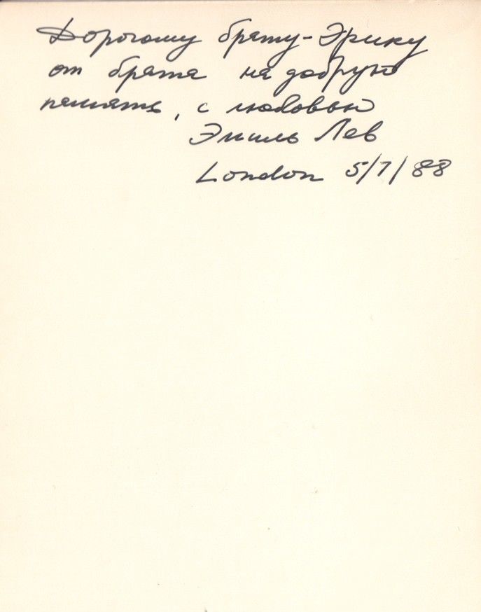 Дарственная надпись художника книги на 2 стр. обложке: «Дорогому брату- Эрику / от брата на добрую / память, с любовью / Эмиль Лев / London / 5/7/88».