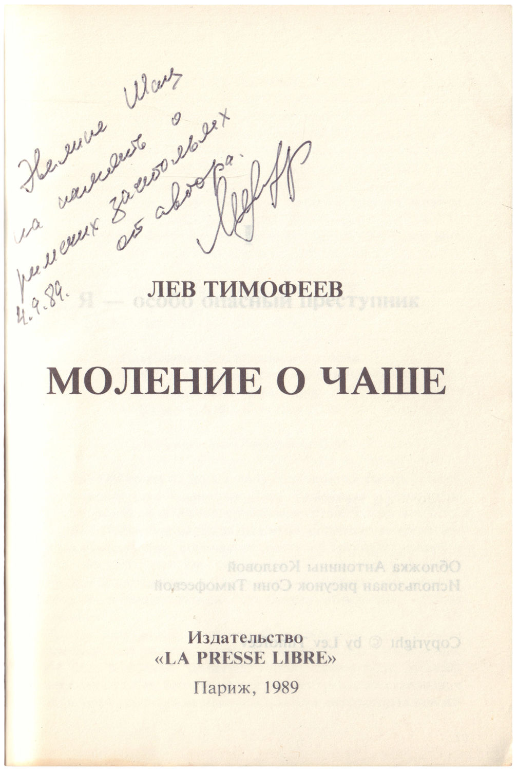 На тит. л. дарственная надпись автора: "Эвелине Шац / на память о римских застольях / 4.9.89. / от автора / [Подпись Лев Тимофеев]
