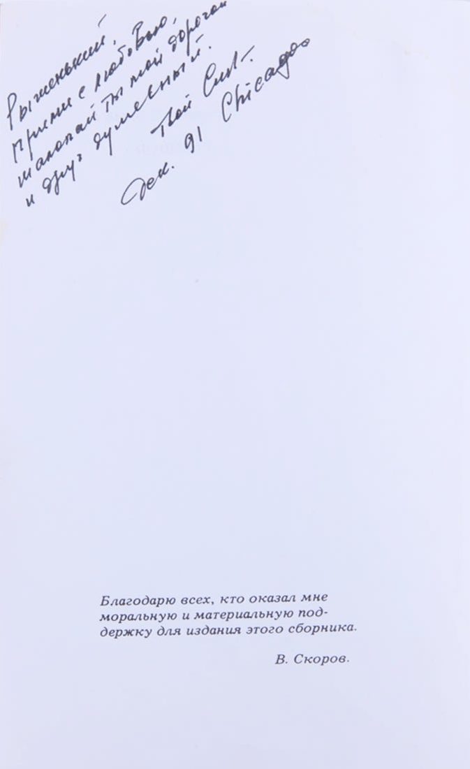 На с. 2 дарственная надпись автора: «Рыженький, / прими с любовью, / шалопай ты мой дорогой / и друг душевный. / Твой [подпись] / дек. 91 Chicago».