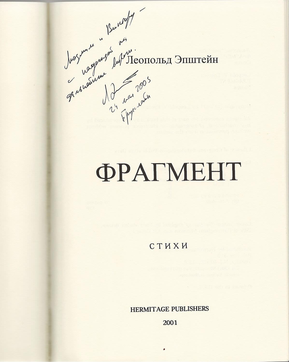 На тит. л. дарственная надпись автора: «Людмиле и Виктору / с надеждой / на дальнейшие встречи / Л Эпш[тейн] / 24 мая 2003 / Бруклайн».
