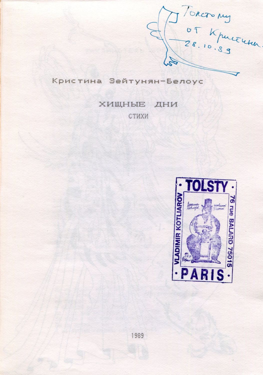 1. На форзаце каталога дарственная надпись автора: "Славе Лену от Кристины / 19.08.2008". 2. На тит. л. дарственная надпись автора "Толстому от Кристины. 28.10.89" и личный штамп Владимира Котлярова Толстого