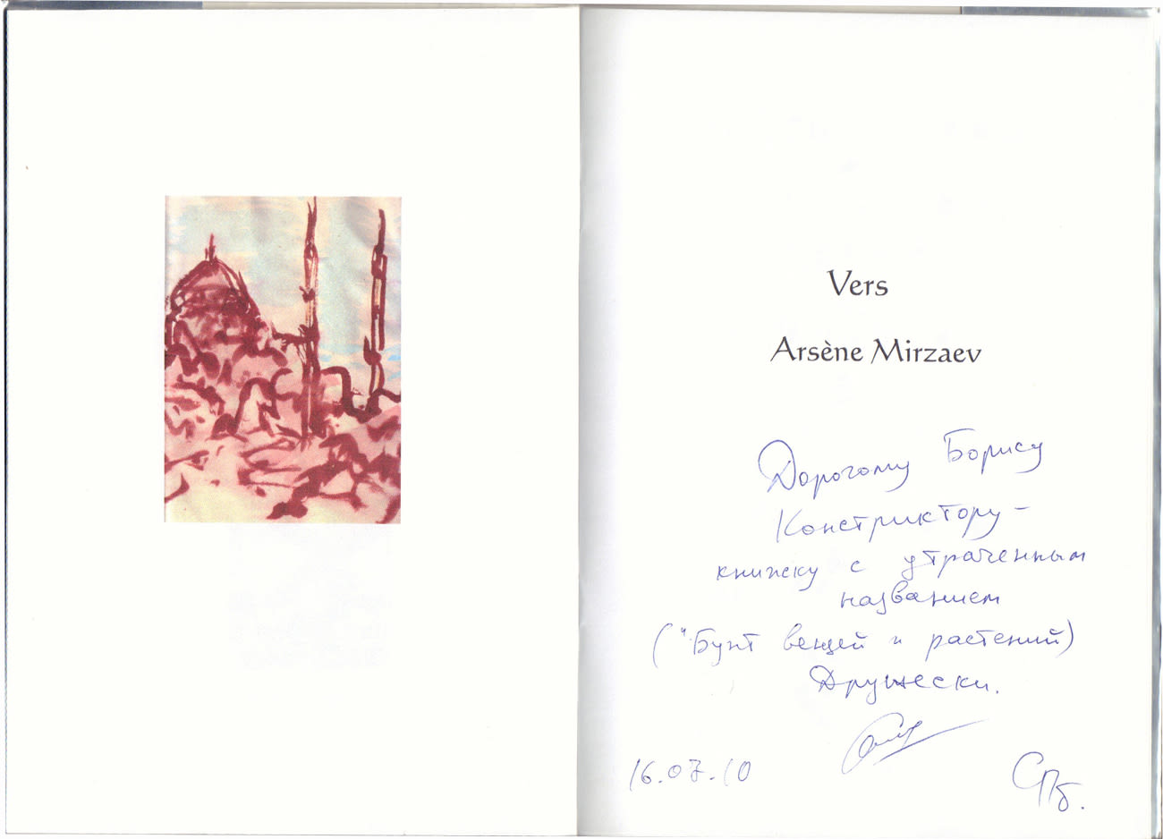 На стр. 5 дарственная надпись автора, адресованная Борису Констриктору: «Дорогому Борису Констриктору - / книжку с утраченным / названием / (“Бунт вещей и растений”) / дружески / [подпись] / 16.07.10 / СПб.».