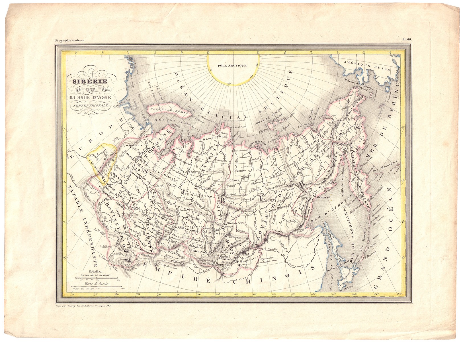 [Аляска еще русская] Тьери Карта «Сибирь или Азиатская часть России». [Siberie ou Russie d'Asie septentrionale] - Франция: 1840-е. - 27х38 см.