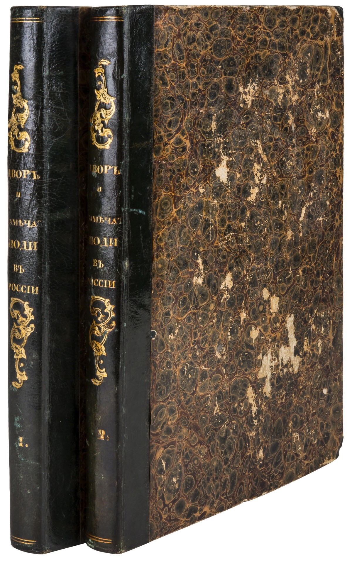 В двух полукожаных переплетах эпохи с тиснением золотом по корешкам. Тройные крапчатые обрезы.