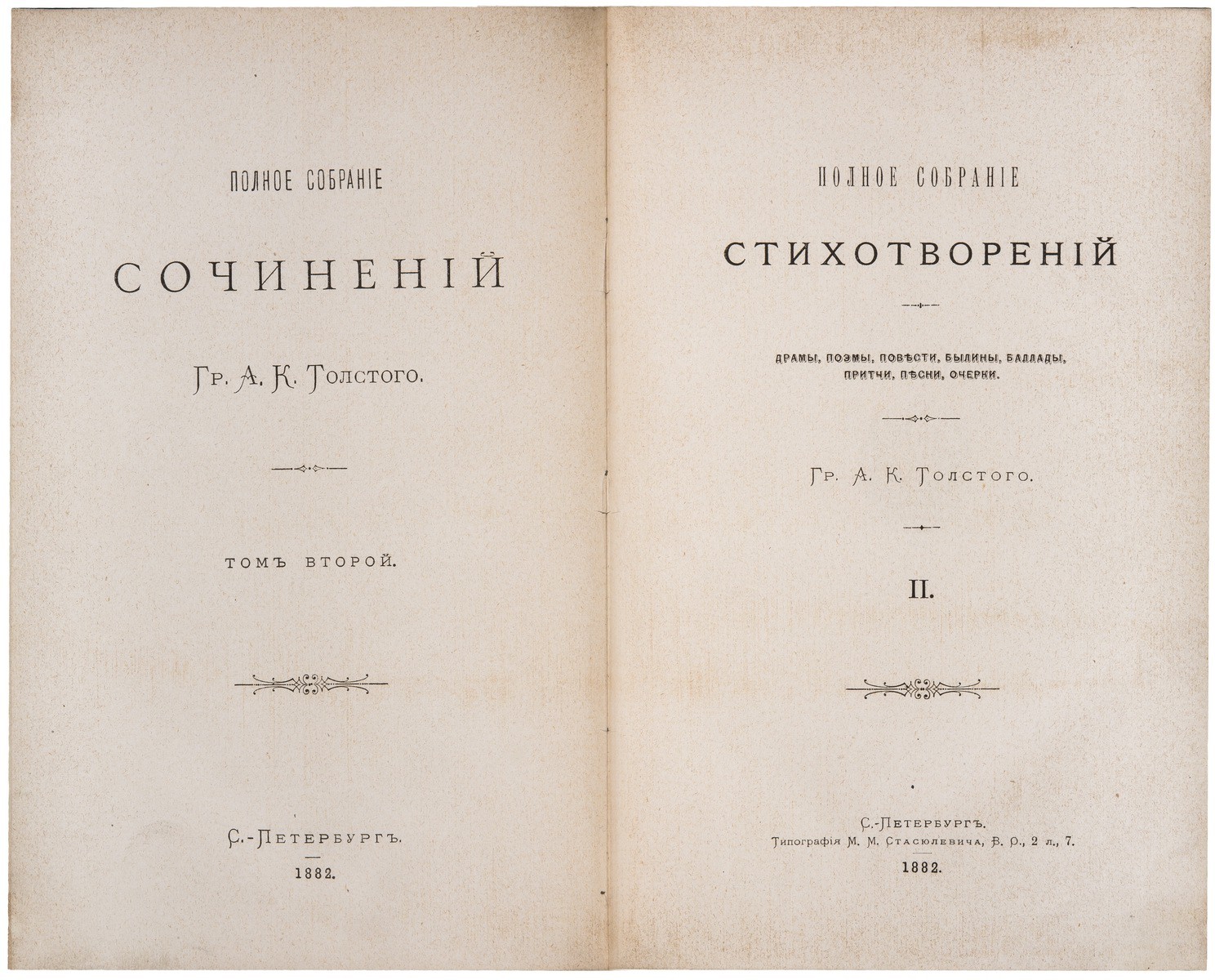 Т.1: Полное собрание стихотворений : Драмы, поэмы, повести, былины, баллады, притчи, песни, очерки : С портретом : 1855-1865. - 1882. - IV, XVI, 368 с., 1 л. фронт. (портр.); Т.2: Полное собрание стихотворений : Драмы, поэмы, повести, былины, баллады, притчи, песни, очерки : 1866-1875. - 1882. - [4], 330 с.