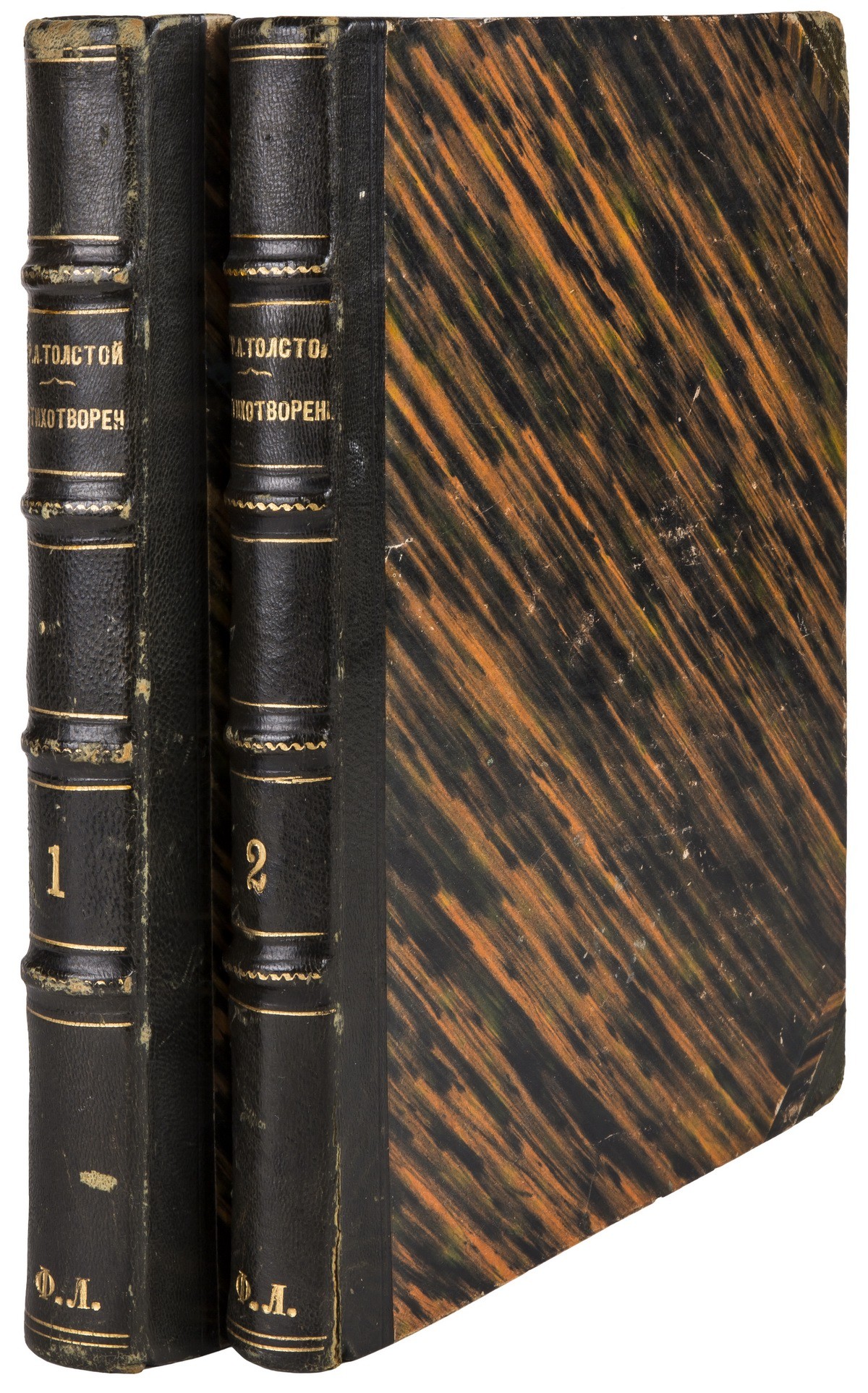 В двух полукожаных переплетах эпохи с тиснением золотом по корешкам с объемными бинтами. Суперэкслибрис «ФЛ» на корешках.