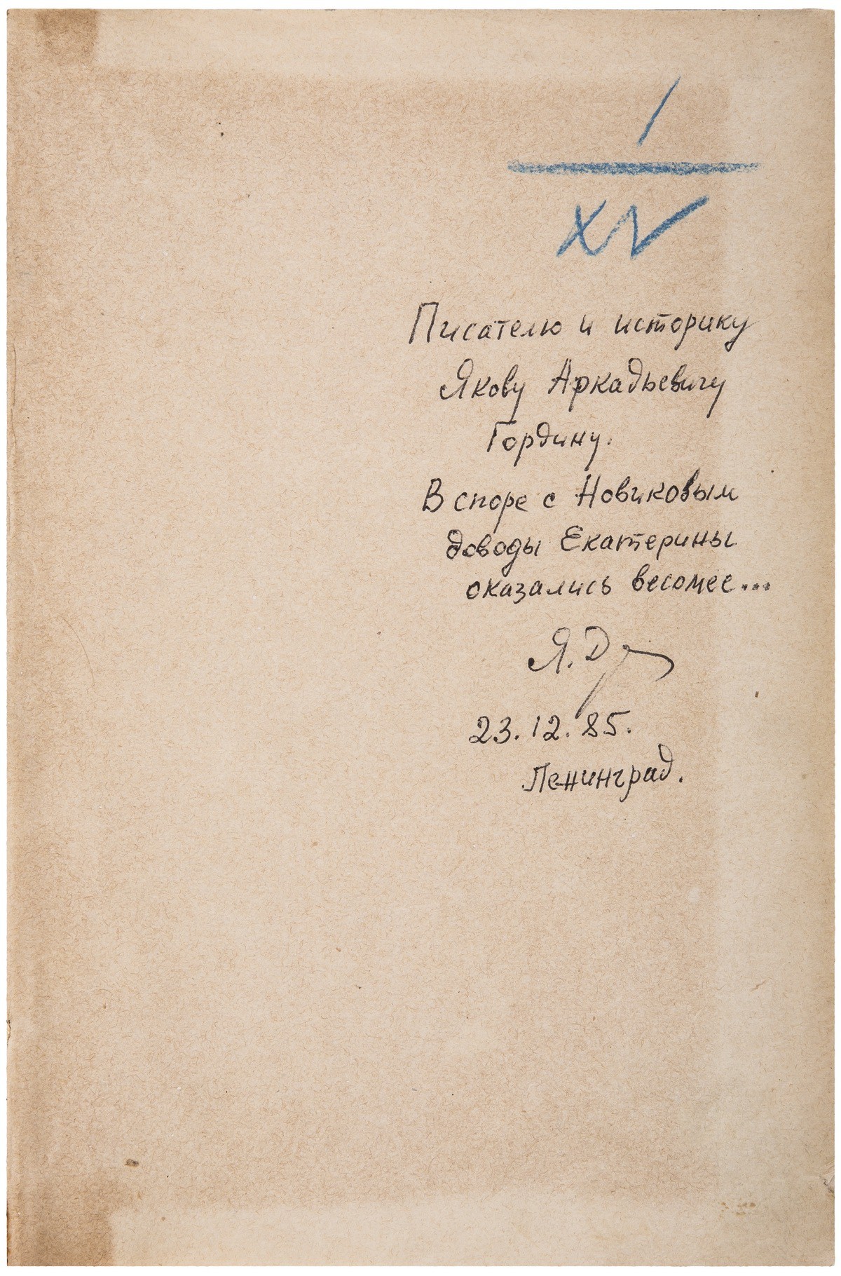 Дарств. надпись на своб. л. форз.: «Писателю и историку / Якову Аркадьевичу / Гордину. / В споре с Новиковым / доводы Екатерины / оказались весомее... / Я.Д. / 23.12.85. / Ленинград».
