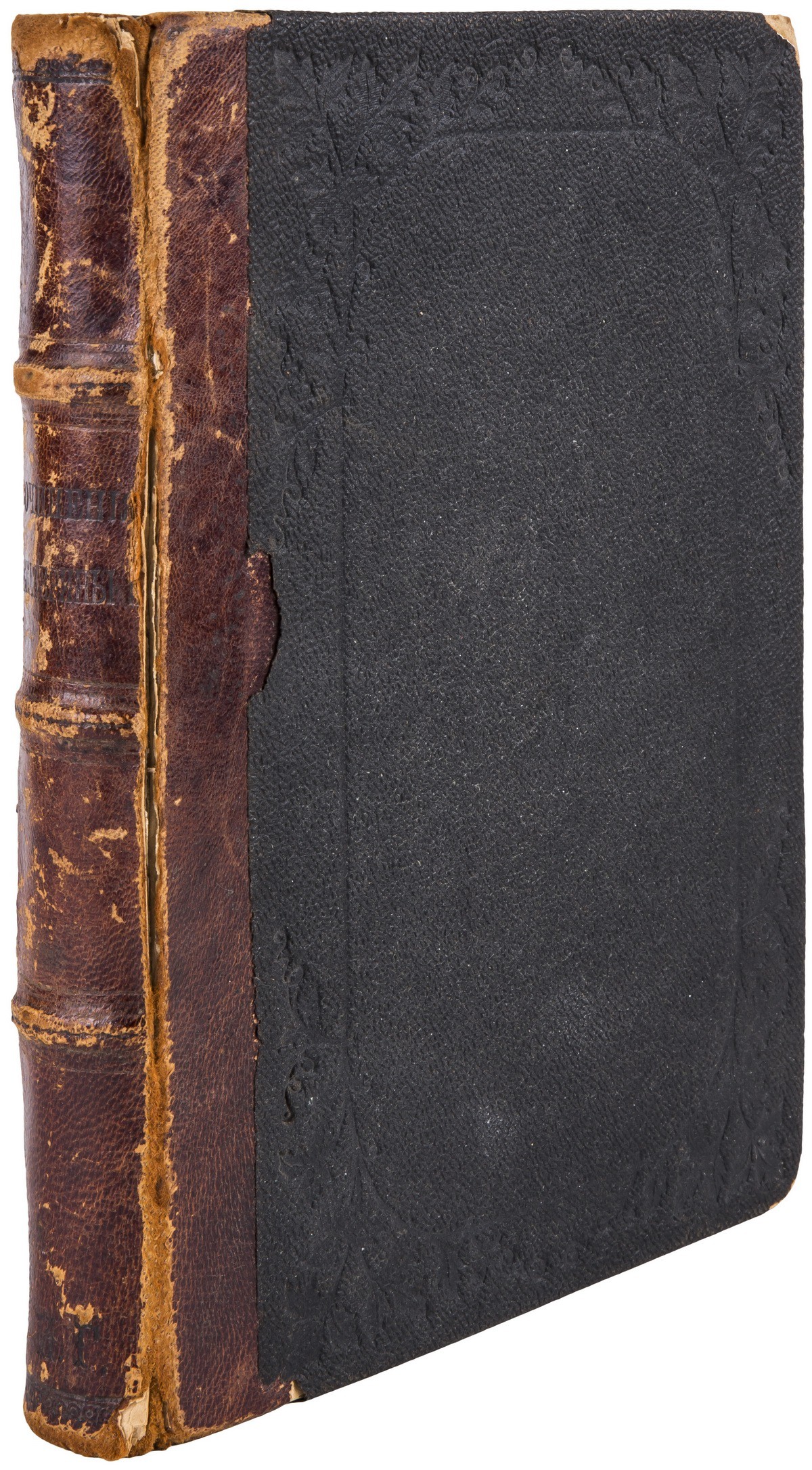 В полукожаном переплете эпохи, корешок с объемными бинтами. На крышках тисненные орнаментальные рамки с виноградными лозами. Тройной крапчатый обрез.