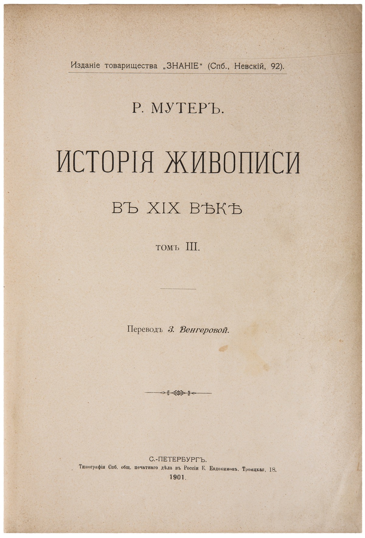 В трех полукожаных переплетах эпохи с тиснением золотом по корешку и передней крышке. Дарств. надпись на своб. л. форз. (ч.1): «Будущему искусства / об / его прошлом. / [неразб. ("четыре луча звездочки?")] / 29/XI-47 г.».