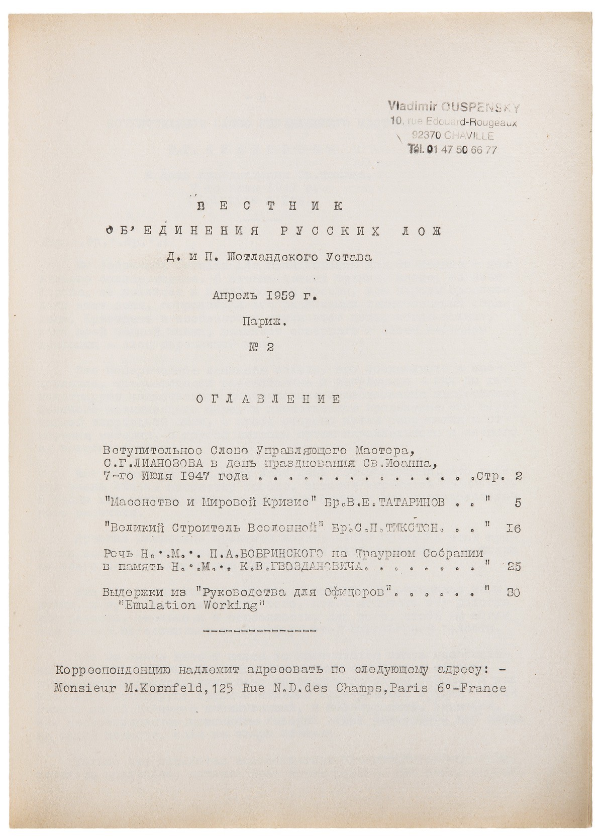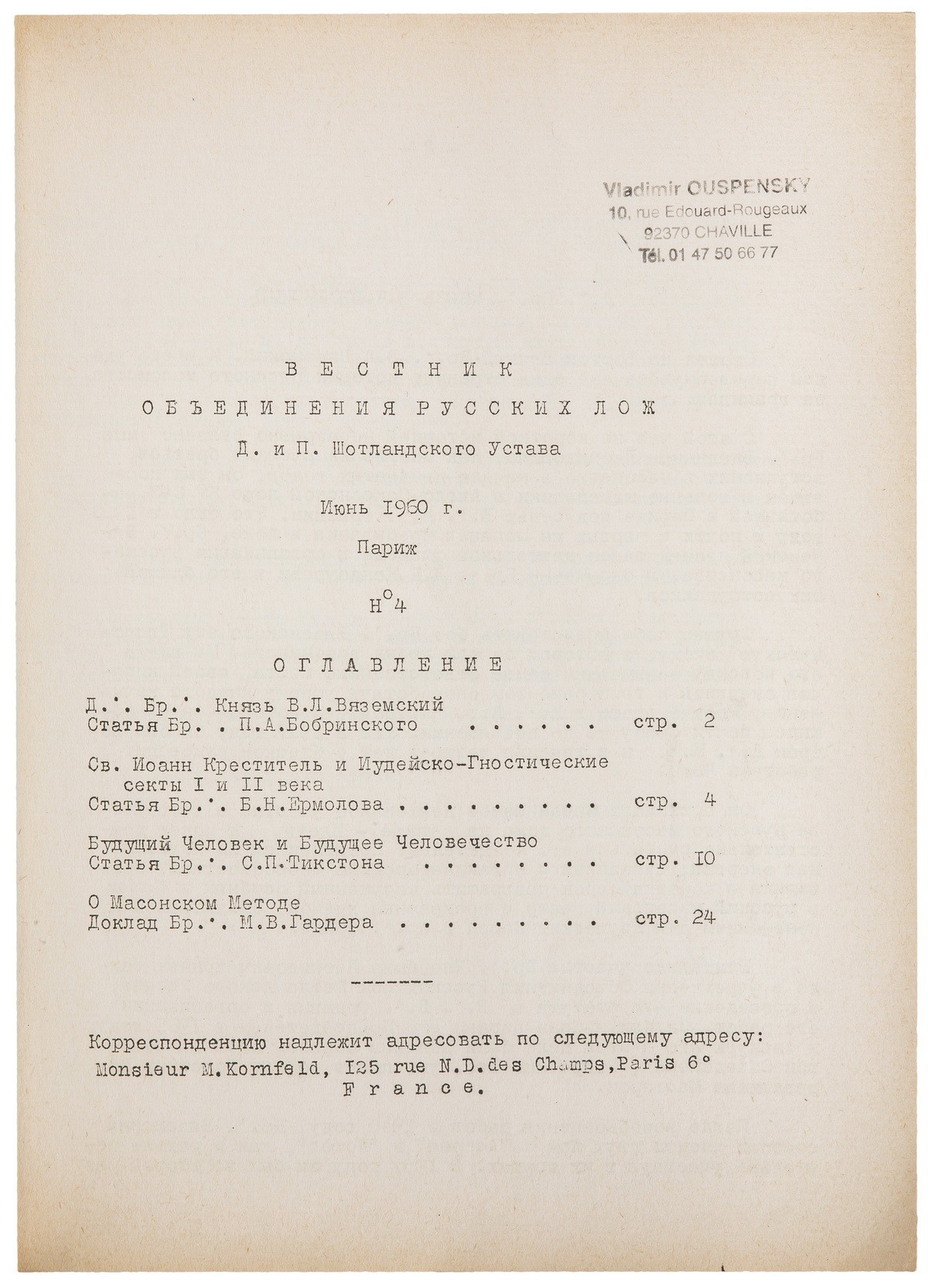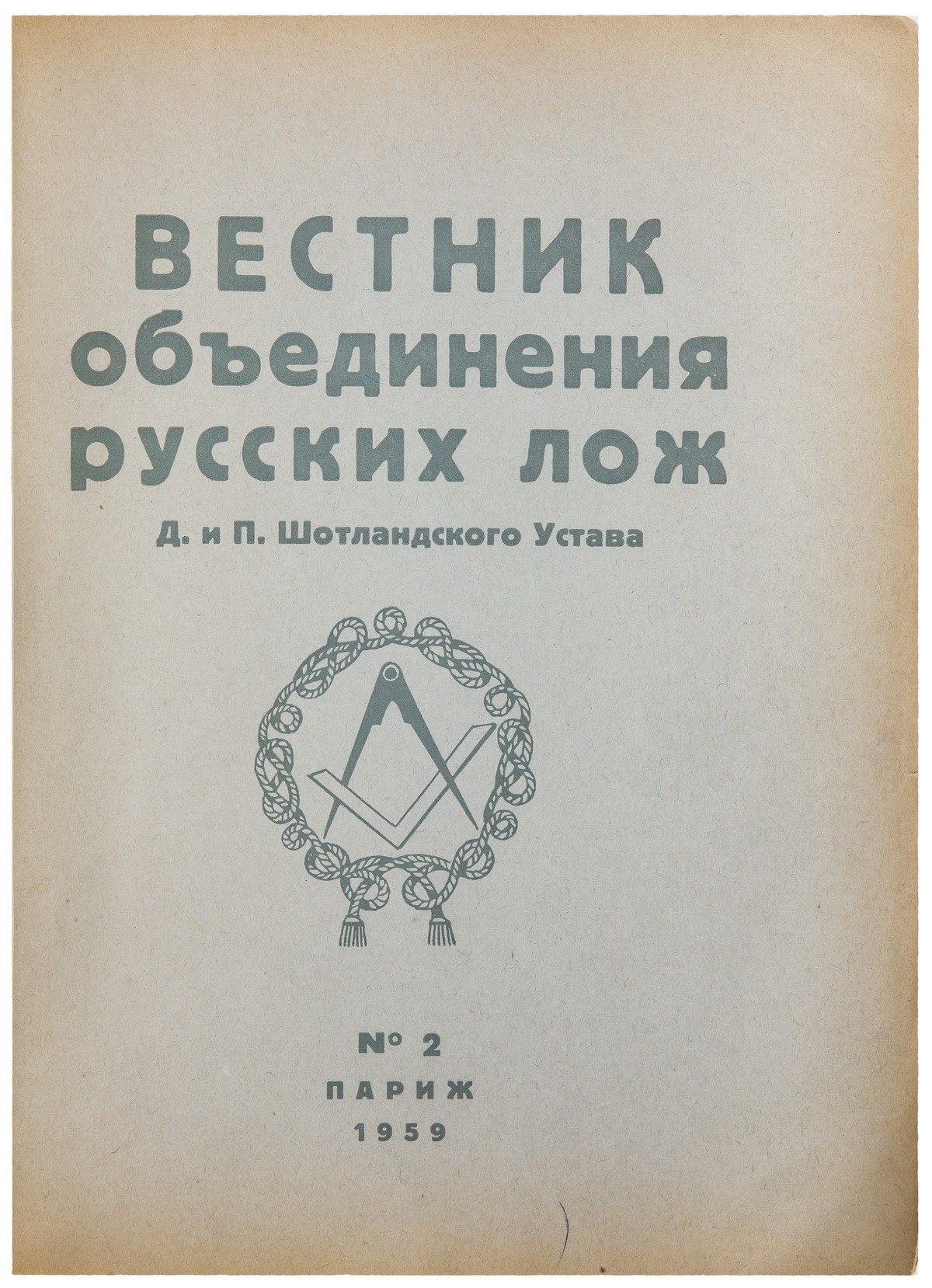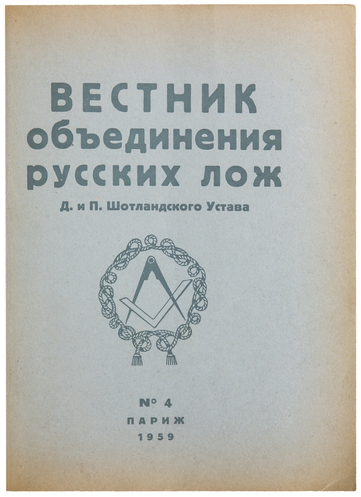 Редкое масонское периодическое издание, выходившее в Париже в 1959-1964 гг. Издателем и редактором журнала был издатель «Сатирикона» Михаил Германович Корнфельд (1884-1973). Всего вышло 14 номеров журнала малыми тиражами. Большая редкость. Комплект выпусков в продаже не встречался.