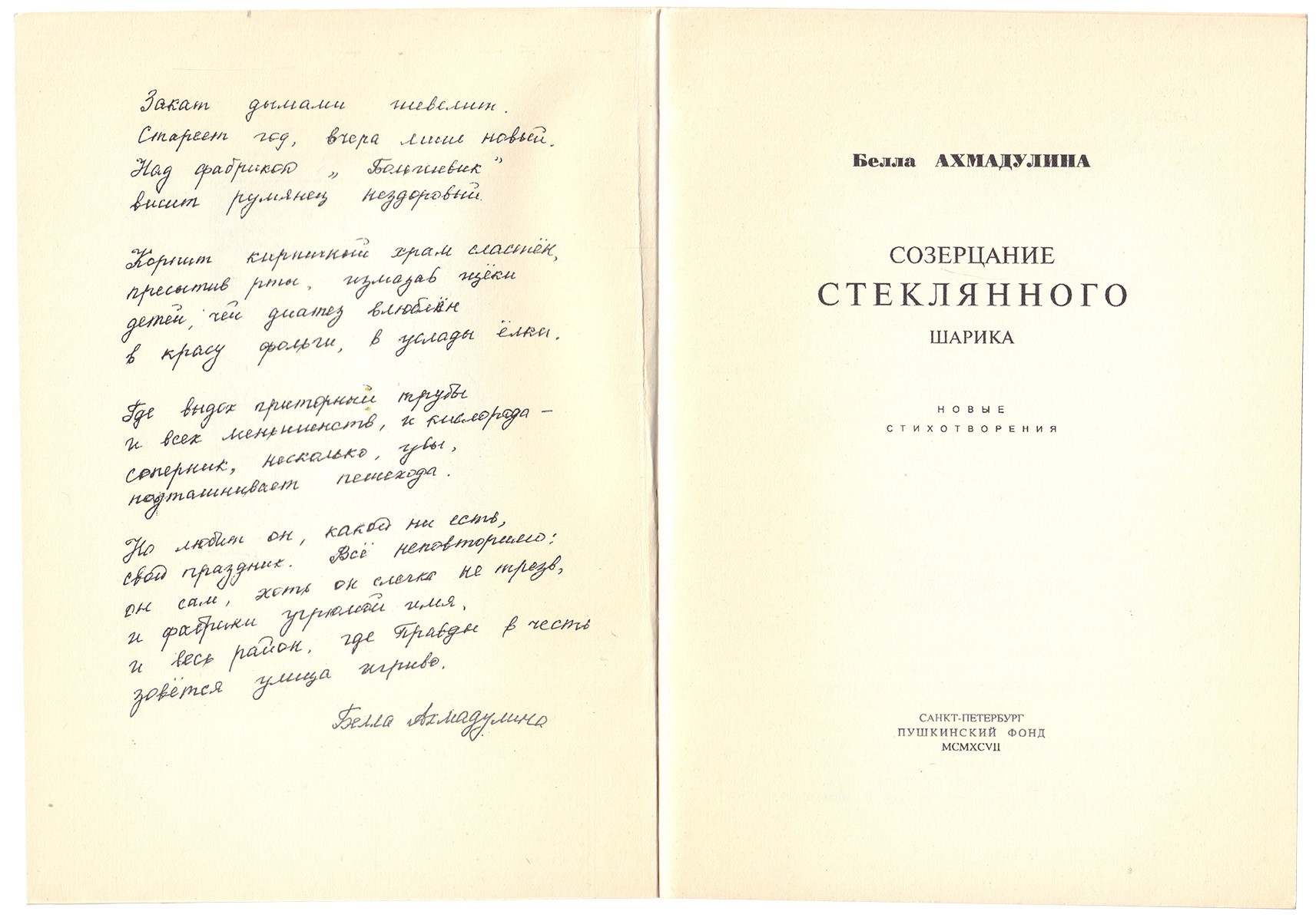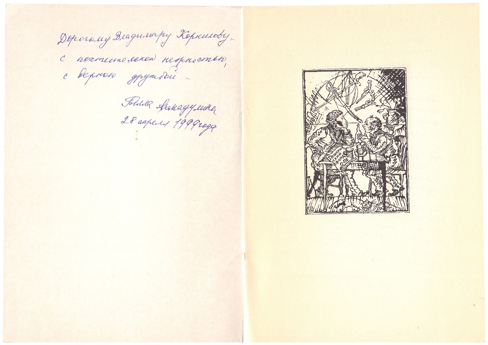 Собственноручная дарственная надпись Беллы Ахмадулиной на с. 2 обл.: «Дорогому Владимиру Корнилову / с почтительной нежностью, / с верною дружбой — / Белла Ахмадулина / 28 апреля 1999 года».