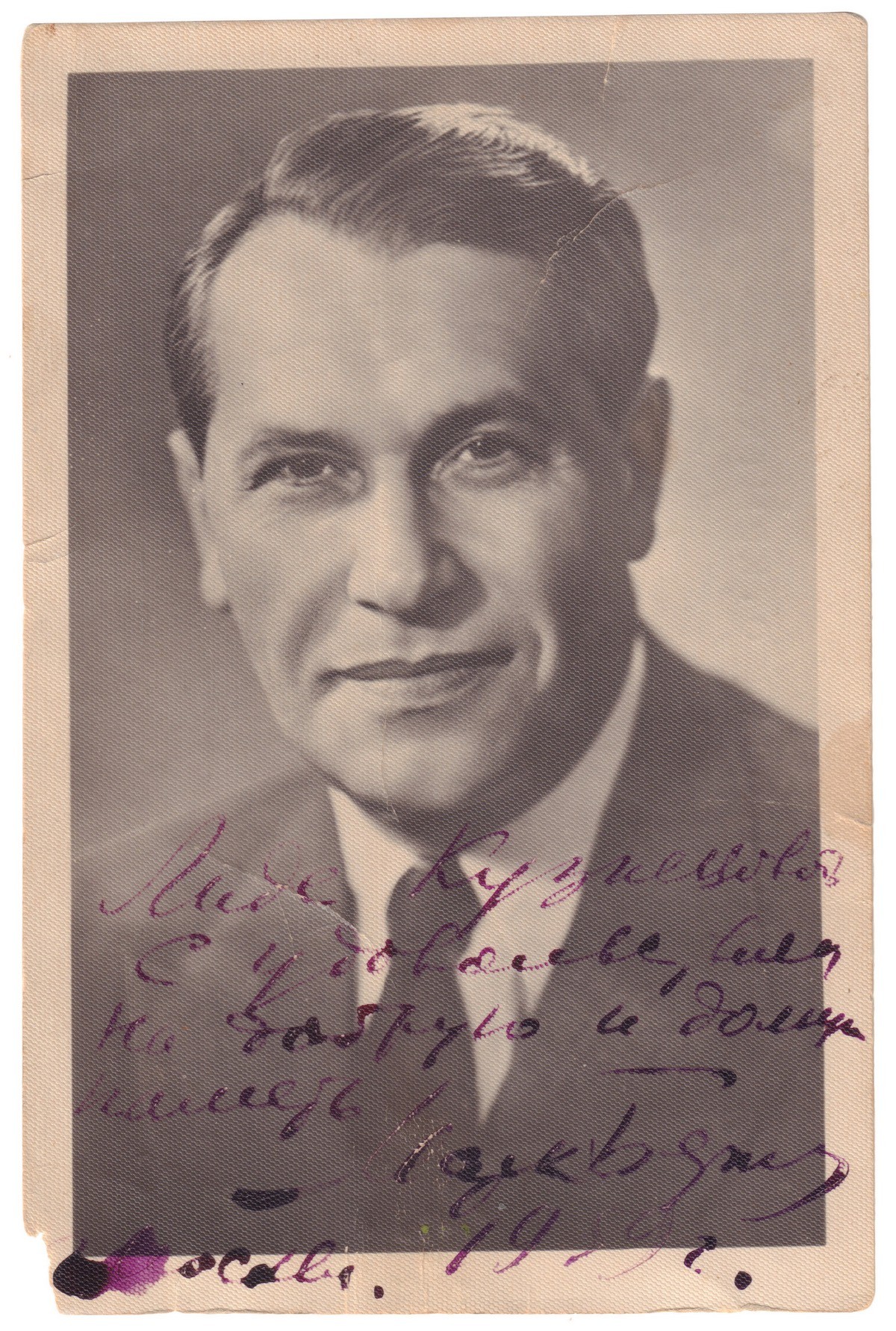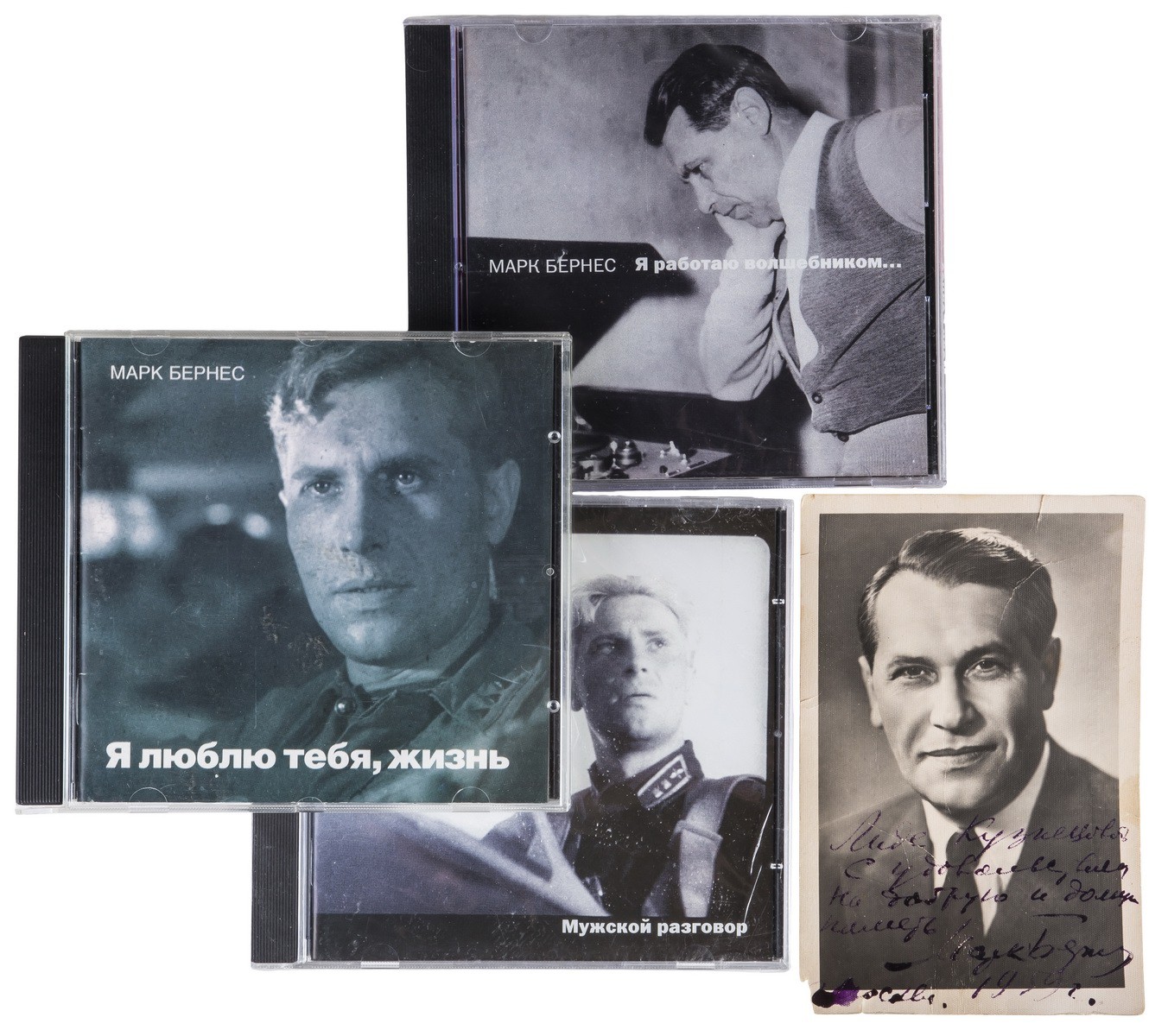 На лицевой стороне открытки дарственная надпись: «Лиде Кузнецовой / С удовольствием / На добрую и долгую [неразбор] / память / [Подпись] / Москва. / 1959». К открытке прилагаются три компакт диска с песнями Марка Бернеса.