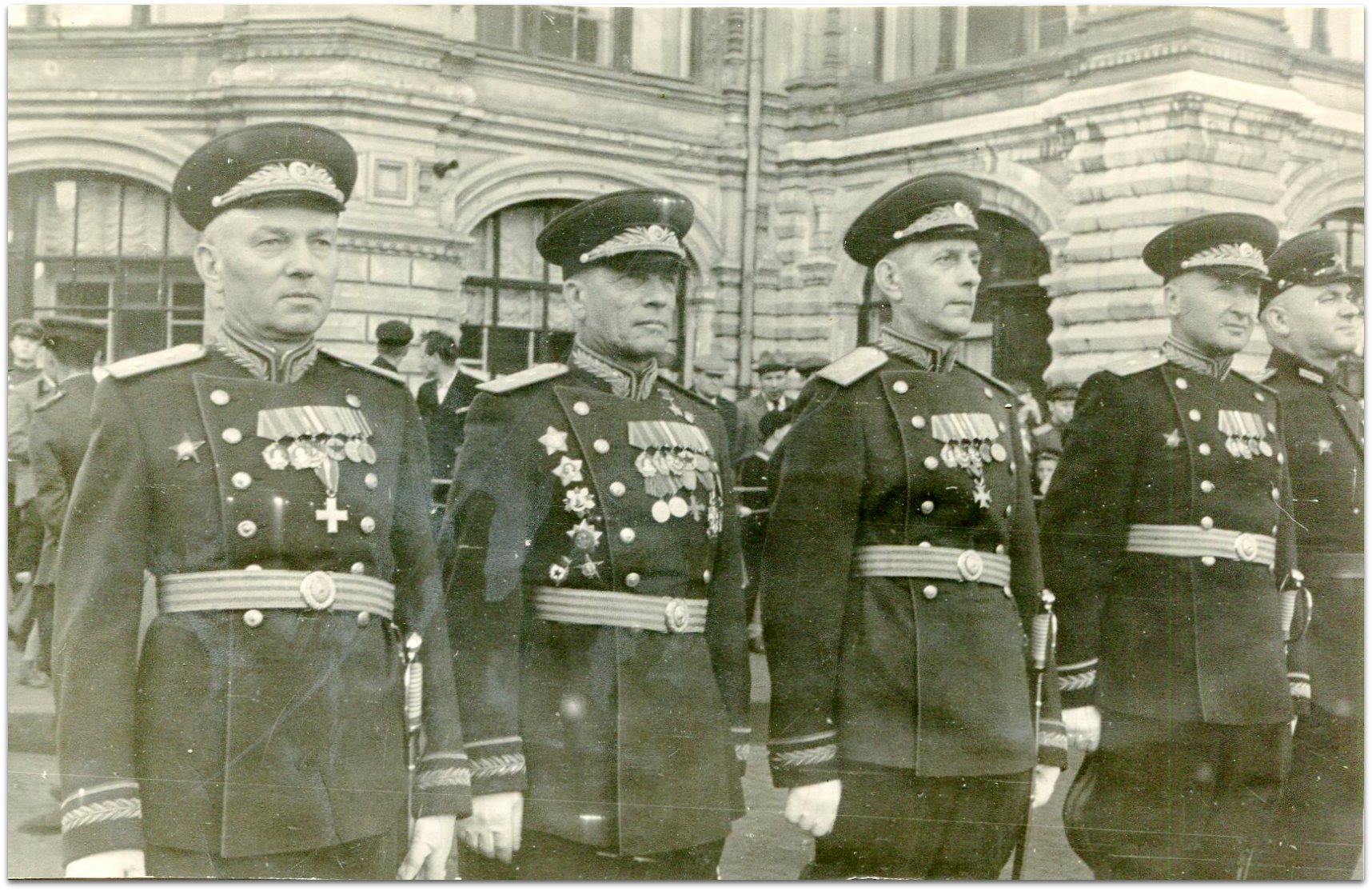Строй сводного полка 2-го Украинского фронта на Красной площади на Параде Победы. В первой шеренге в фуражках слева направо: командующий 2-м Украинским фронтом Маршал Советского Союза Родион Яковлевич Малиновский, командующий 53-й армией Герой Советского Союза генерал-лейтенант Иван Мефодьевич Манагаров, командующий 6-й гвардейской танковой армией Герой Советского Союза гвардии генерал-лейтенант танковых войск Андрей Григорьевич Кравченко, командующий 1-й гвардейской конно-механизированной группой Герой Советского Союза генерал-полковник Исса Александрович Плиев, командир сводного полка командир 18-го гвардейского стрелкового корпуса Герой Советского Союза гвардии генерал-лейтенант Иван Михайлович Афонин, командир сводного батальона командир 49-й гвардейской стрелковой дивизии Герой Советского Союза гвардии генерал-майор Василий Филиппович Маргелов.
