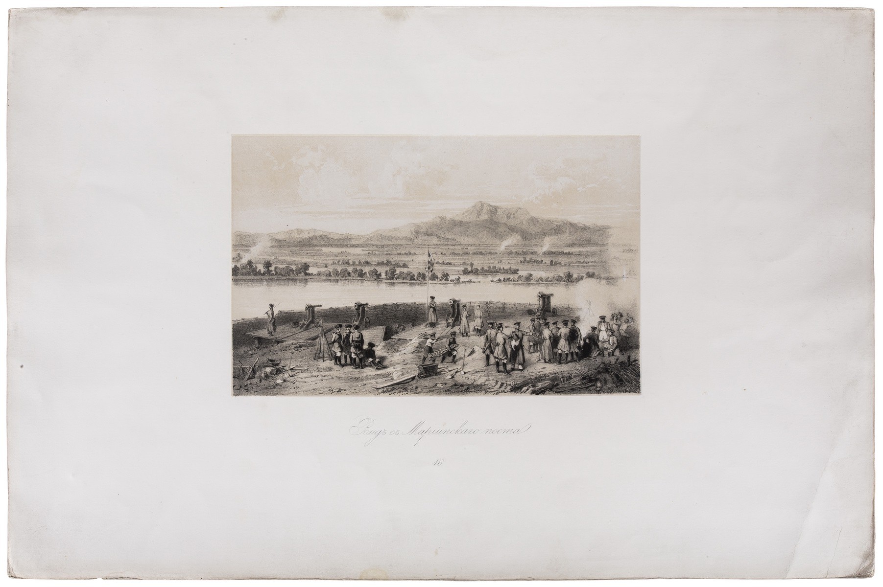Богомолов-Романович, А.С. Гравюра «Вид с Мариинского поста». Лист № 16 из издания "К путешествию на Амур, совершенному от Сибирского Отдела Императорского Русского Географического Общества". - 1859. - 35х55 см.