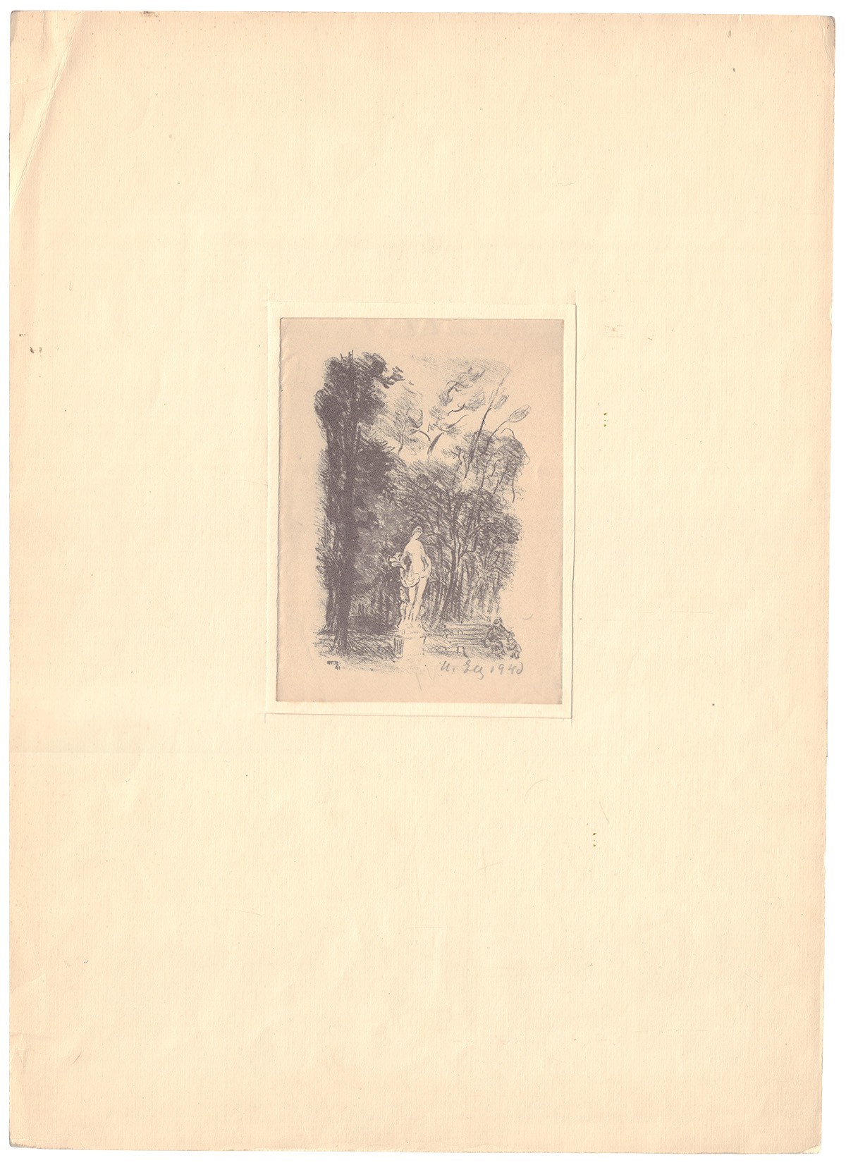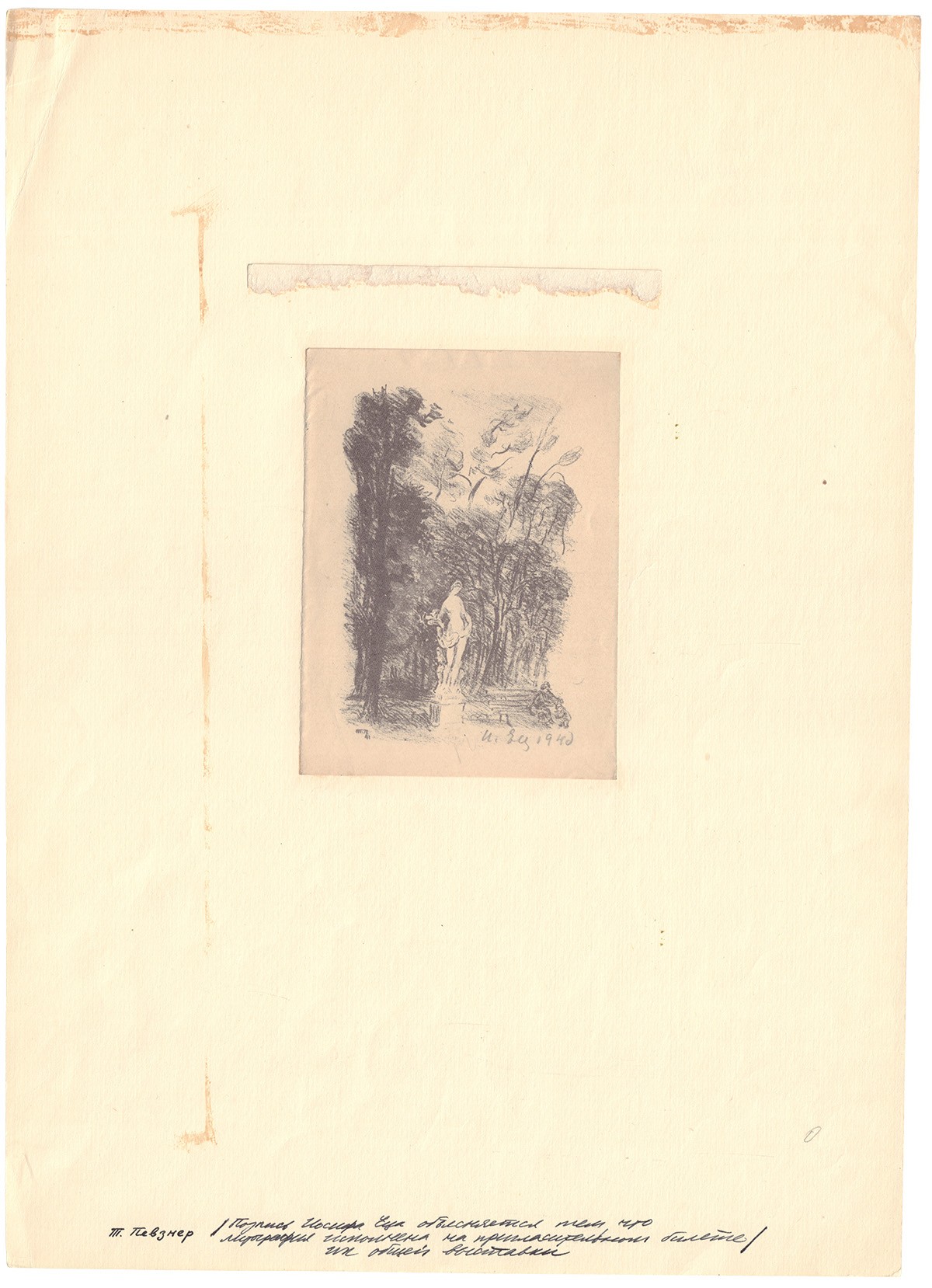 Обложка пригласительного билета на открытие выставки автолитографий, офортов и ксилографий членов ЛССХа. В нижнем углу литографии автограф художника и участника выставки Иосифа Михайловича Еца (1907-1941).
