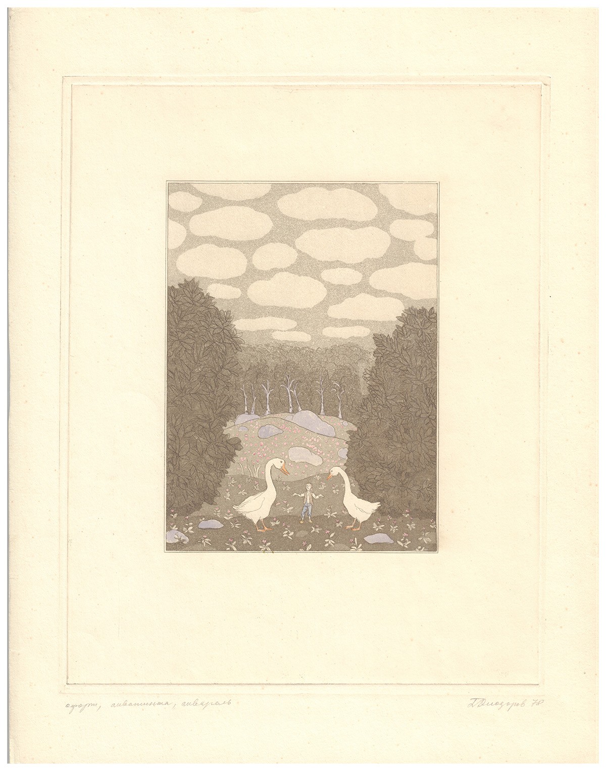 Офорт, акватинта, авторская раскраска. Авторская подпись в правом нижнем углу. Иллюстрация к книге Сельмы Лагерлёф «Чудесное путешествие Нильса с дикими гусями».