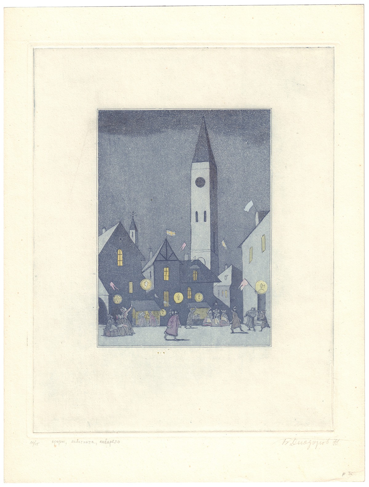 Офорт, акватинта, авторская раскраска. Авторская подпись в правом нижнем углу. Иллюстрация к книге Сельмы Лагерлёф «Чудесное путешествие Нильса с дикими гусями».
