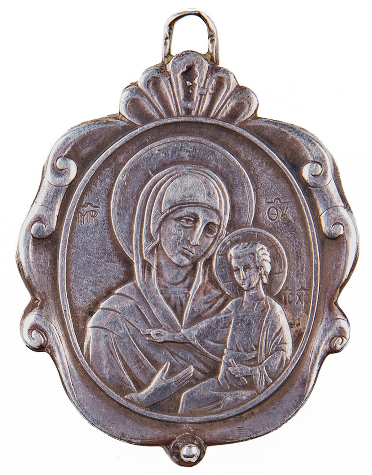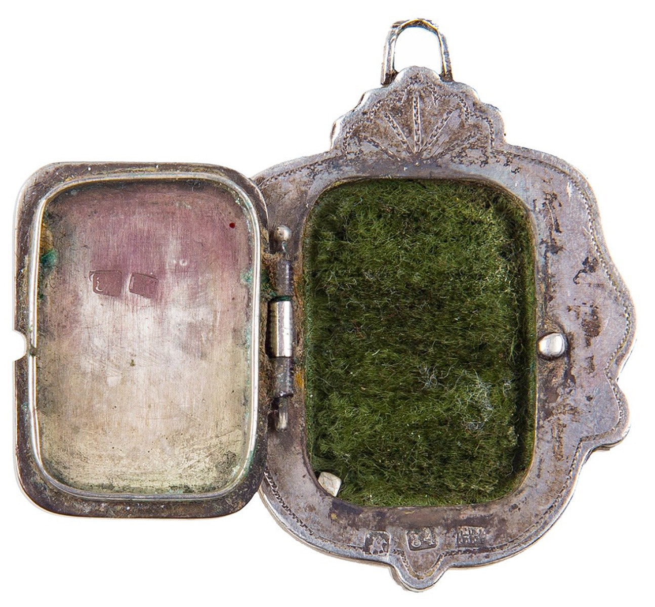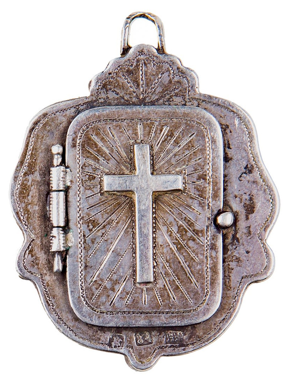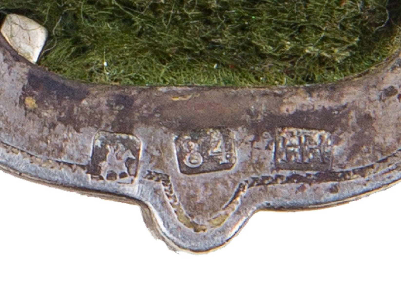 Серебро. Бархат. Литье, монтировка, резьба. Клейма: «Георгий Победоносец», проба «84», инициалы мастера «НК».