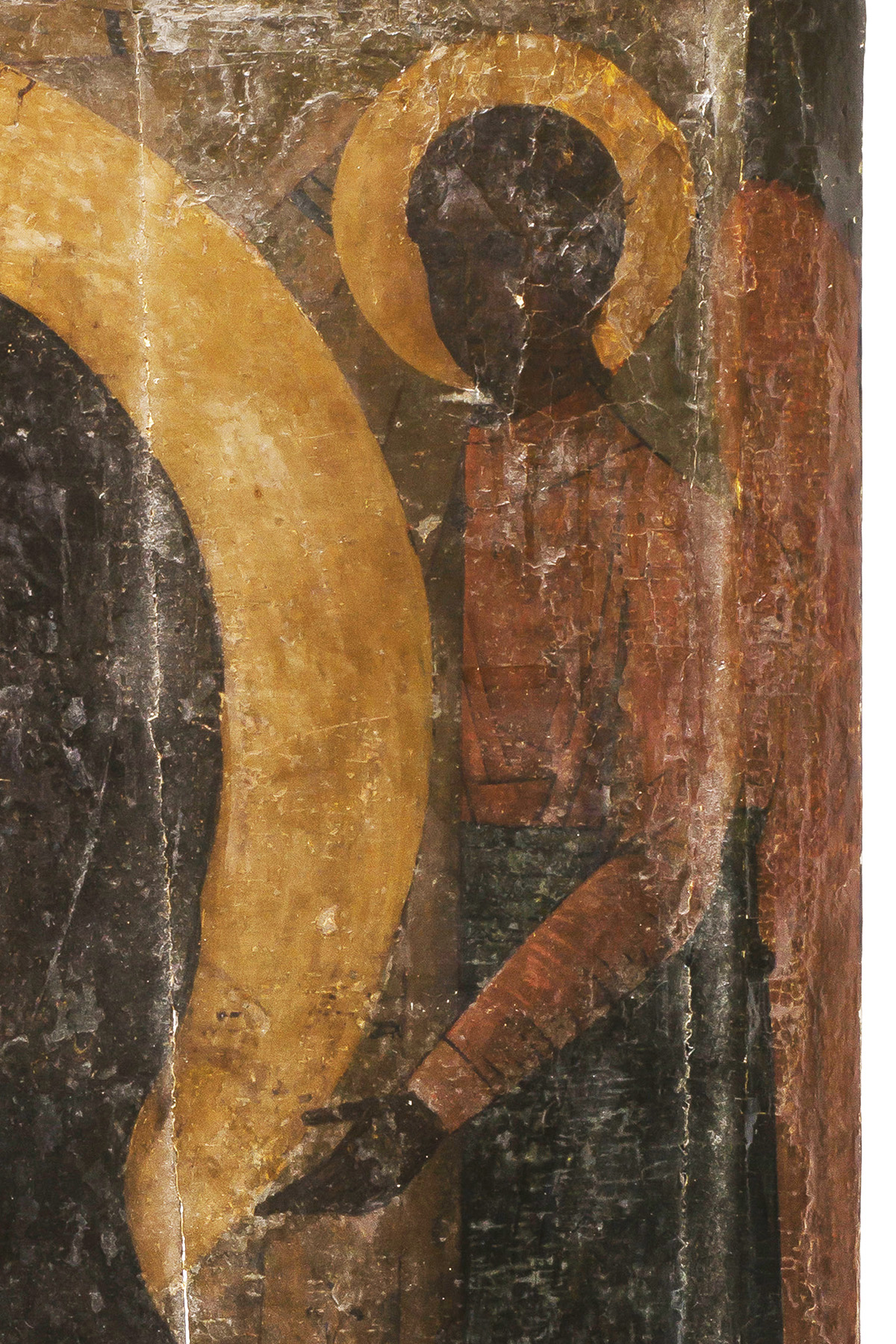 Трещины, осыпи, местами вспучивание красочного слоя. Следы реставрации.