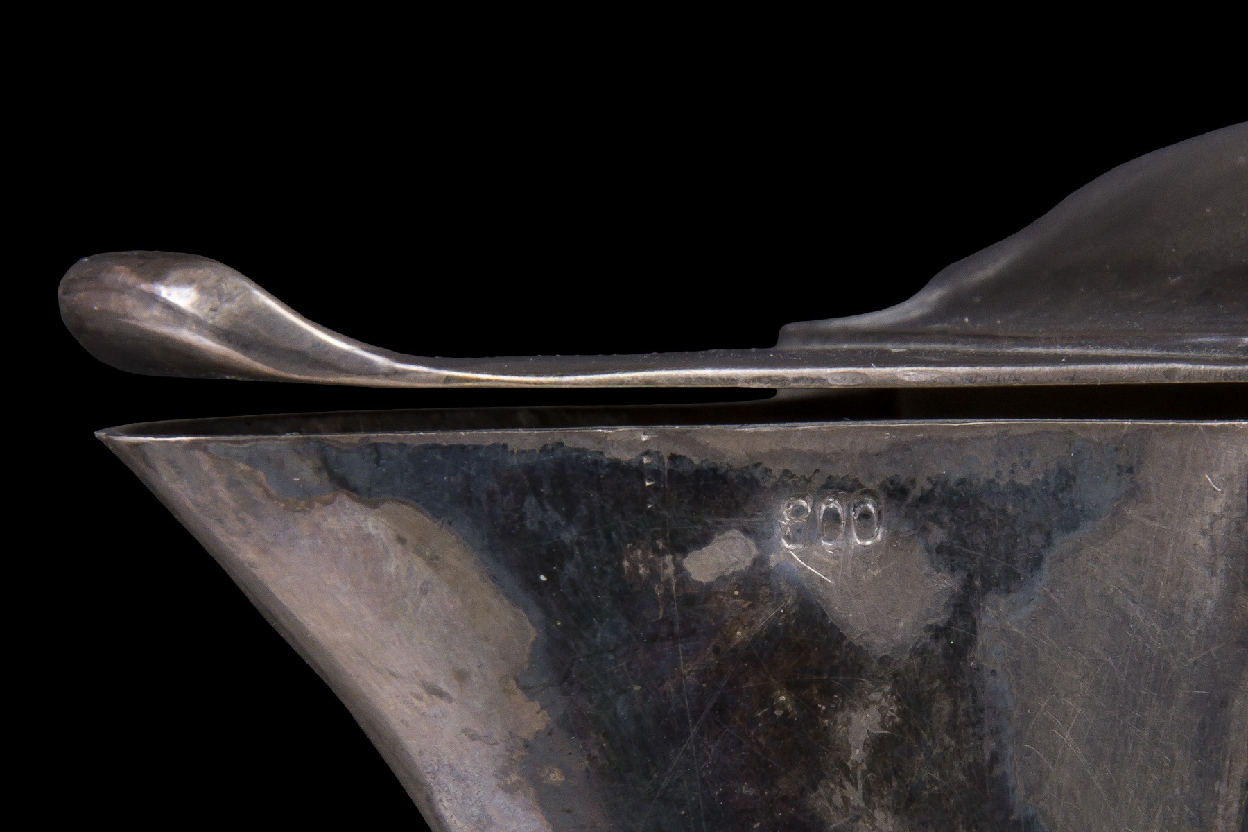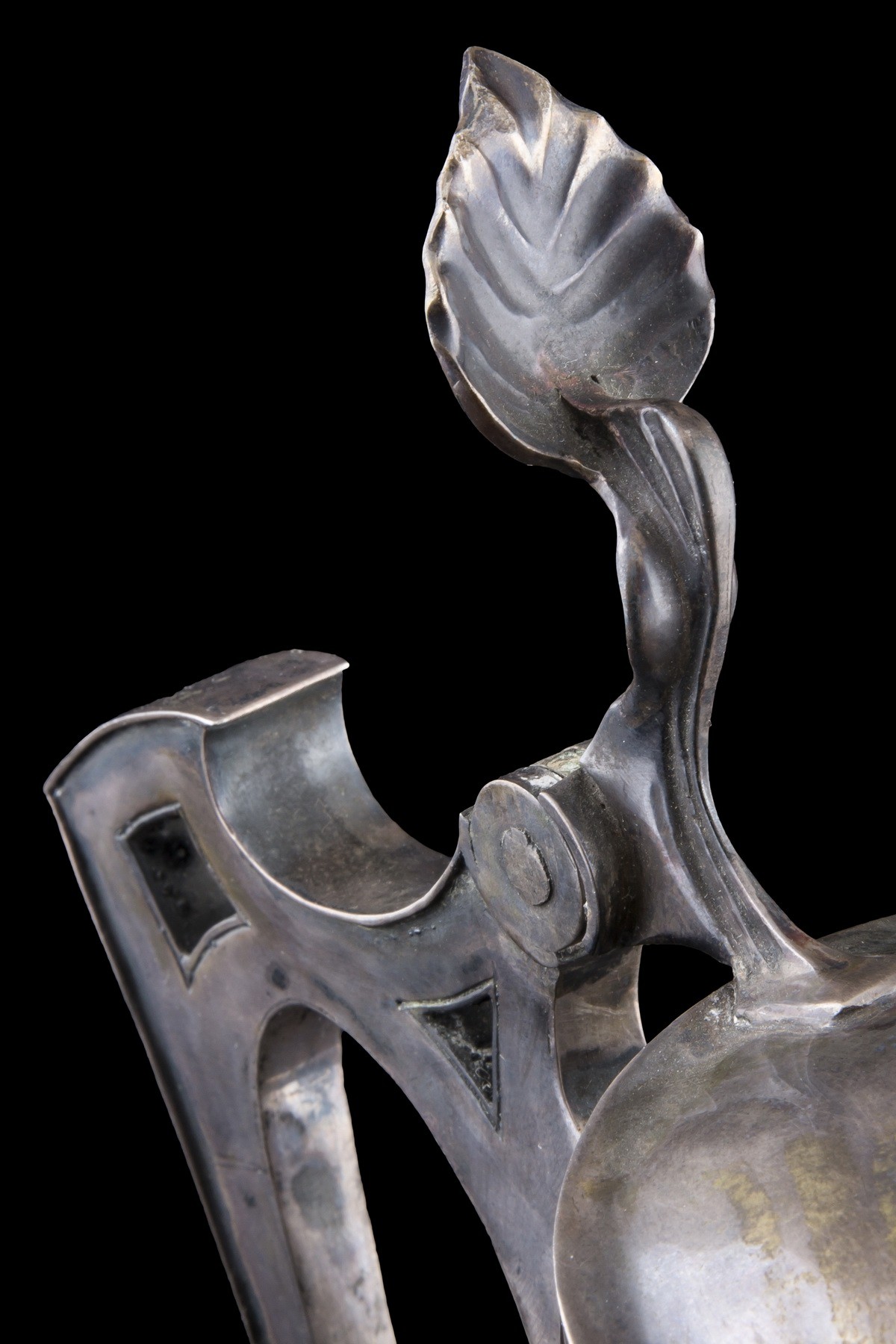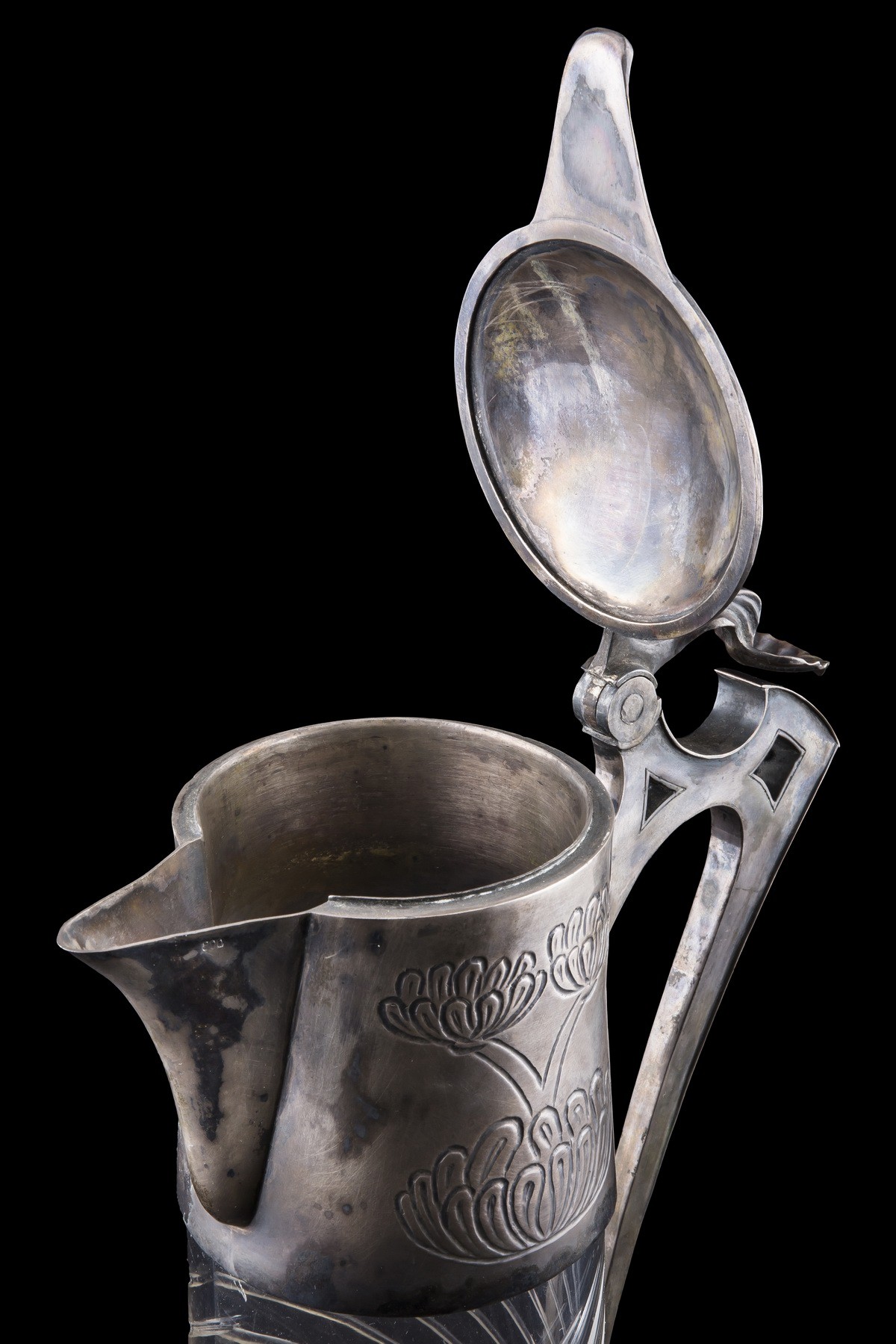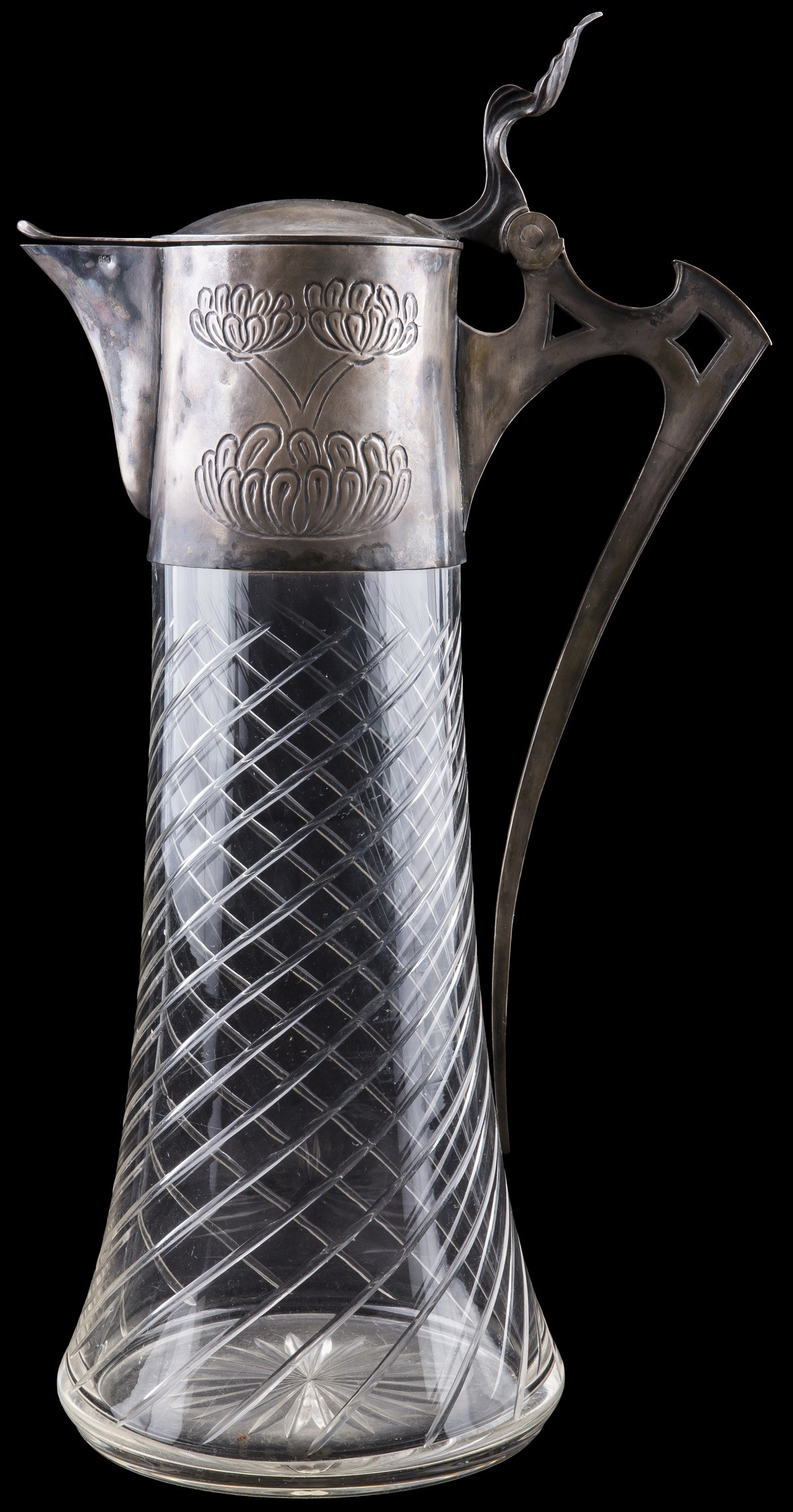Серебро. Стекло. Литье, резьба. Клейма: проба «800». Горлышко и ручка украшены растительным орнаментом.