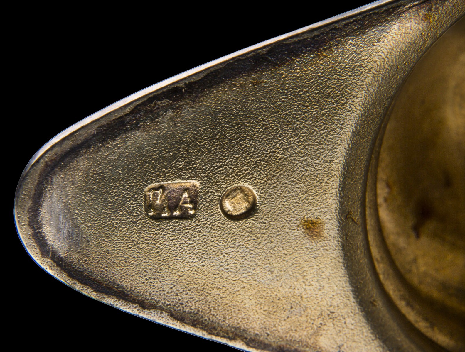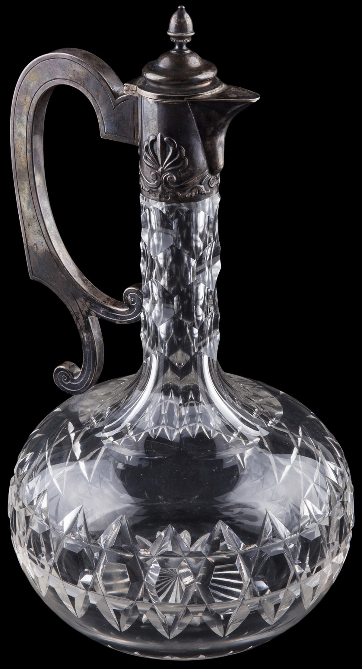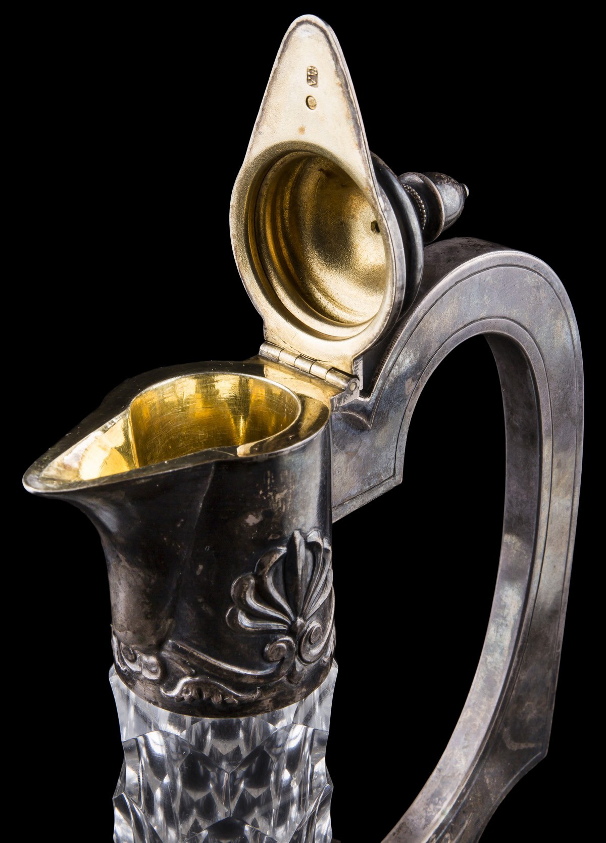 Серебро. Хрусталь. Литье, резьба. Клейма: проба «84», «голова в кокошнике вправо», клейма мастера [неразбор]. Горлышко и ручка украшены растительным орнаментом.