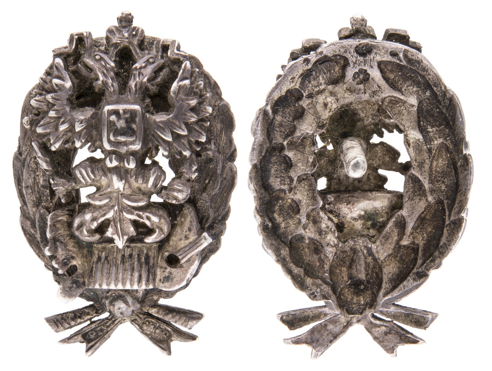 Клейма на знаке: клеймо пробирное Санкт-Петербурга последней четверти XIX в. с обозначением пробы "84", "Ф.Г." С.В.Патрикеев и А.Д. Бойнович. Нагрудные знаки России. I том № 2.8.