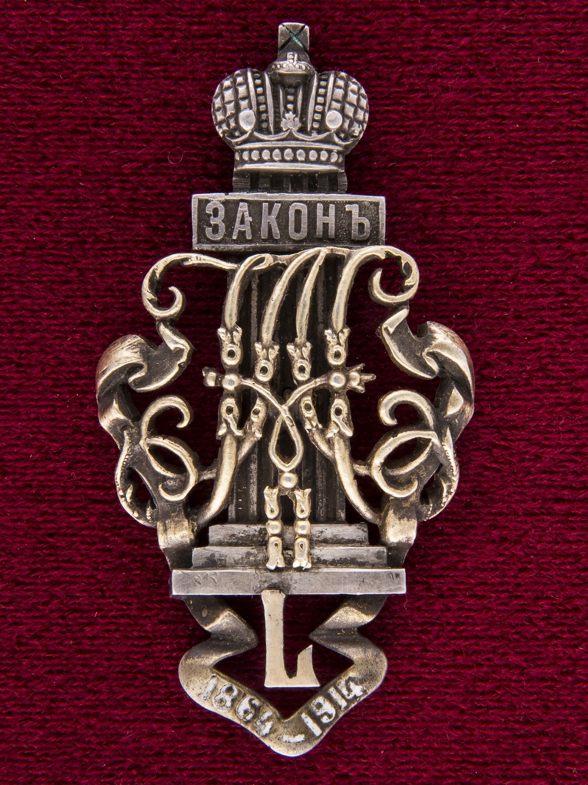 С оригинальными мутором и прижимной шайбой. Вес без мутора и прижимной шайбы - 18,98 г. Вес с мутором и прижимной шайбой - 23.89 г. Клейма на знаке - клеймо Московского пробирного управления образца 1908 г. "Голова в кокошнике" вправо с буквой "Δ" и обозначением пробы "84", "ИВ". Клейма на муторе и прижимной шайбе - знак удостоверения "Голова в кокошнике", "ИВ", "84". С.В.Патрикеев и А.Д. Бойнович. Нагрудные знаки России. I том № 4.31. Утвержден в 1914 г.