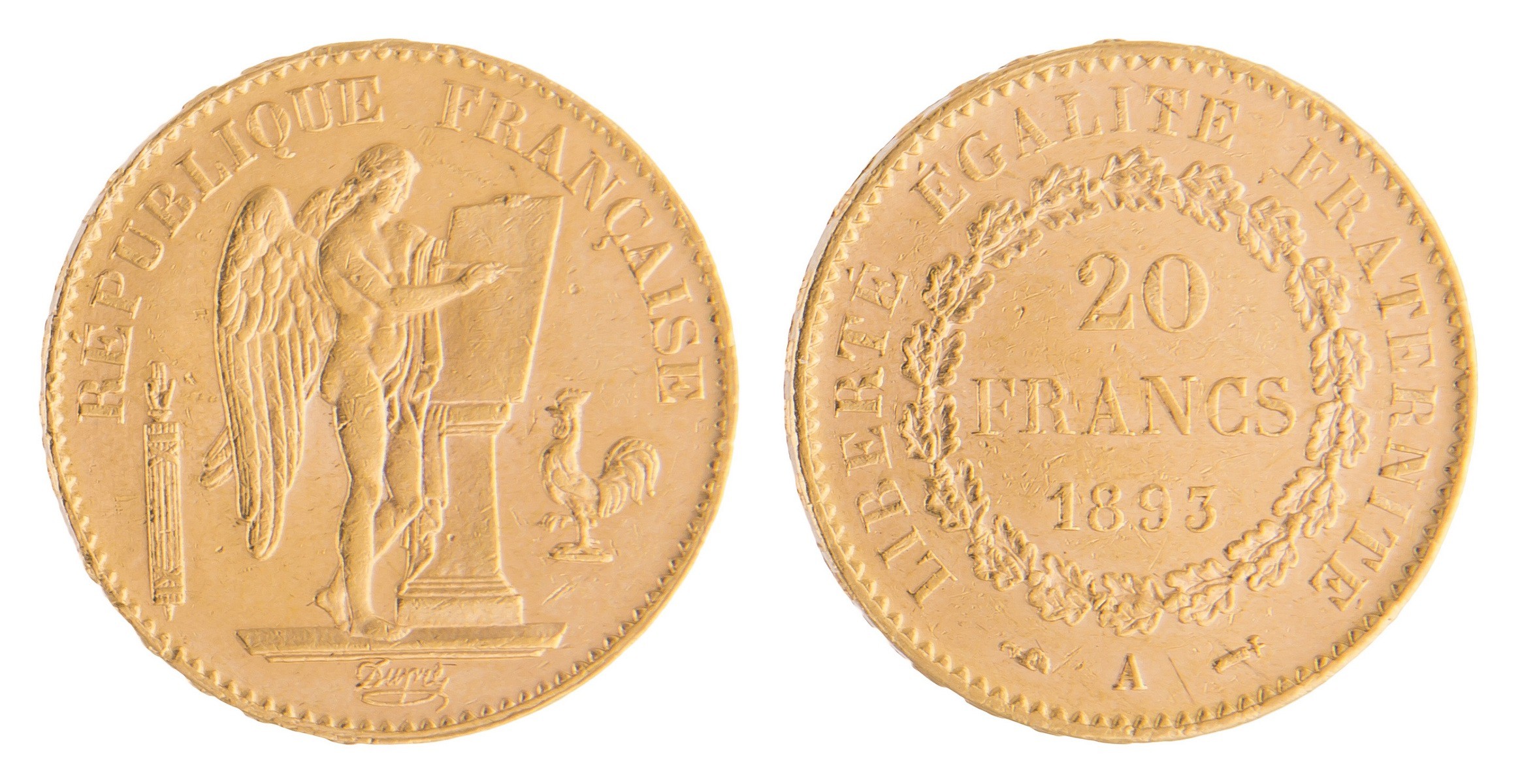 Остатки штемпельного блеска на аверсе и реверсе монеты. Монетный двор Парижа. Краузе № 825.