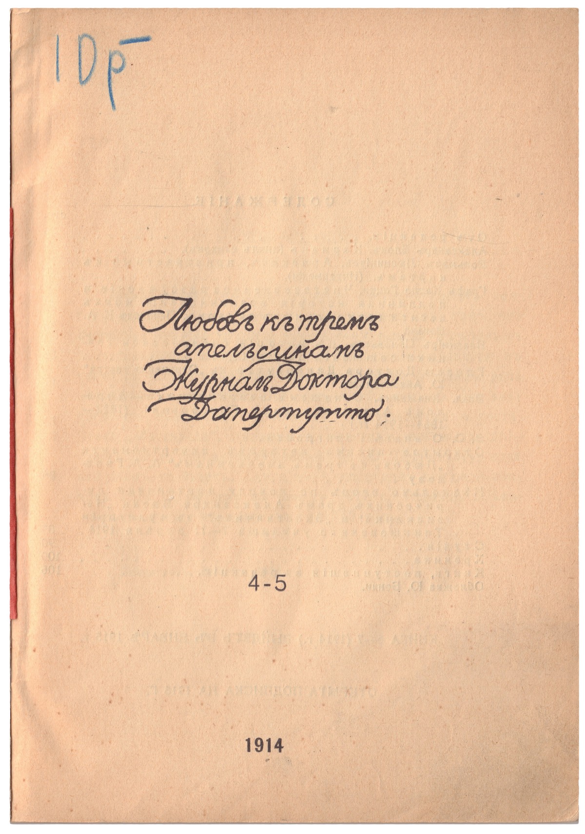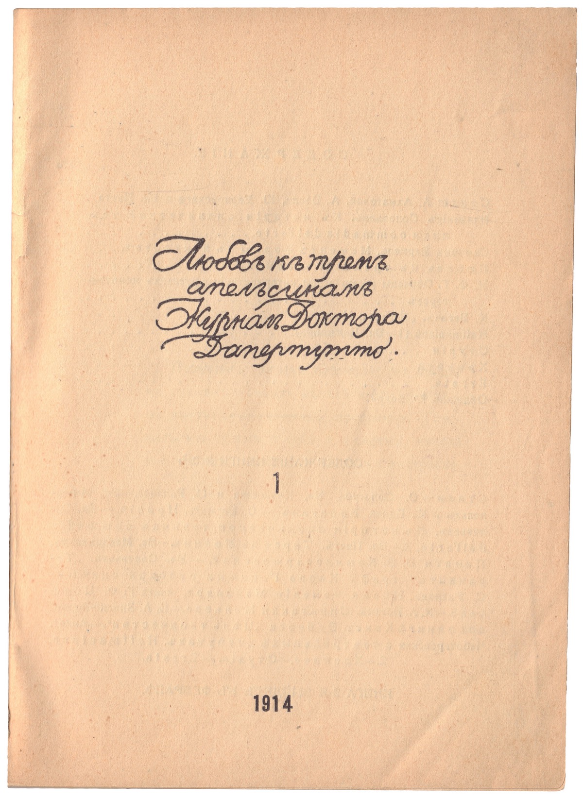 «Любовь к трем апельсинам» — театральный журнал являлся печатным органом экспериментальной студии В.Э. Мейерхольда (псевдоним — доктор Дапертутто), издавался в 1914-1916 гг. В редакцию издания входили ее участники — такие известные личности, как Л.Д. Блок, В.Н. Вергина, В.А. Пяст и др. Стихотворным отделением журнала заведовал А. Блок, в нем, помимо его собственных стихов, публиковалась лирические произведения самых известных поэтов времени: К. Бальмонта, З. Гиппиус, Ф. Сологуба, М. Кузмина, А. Ахматовой и др. Наиболее значительными из этих публикаций являются стихотворная переписка А. Ахматовой и А. Блока, цикл А. Блока «Кармен» а также его стихотворение «Голос из хора». Известен один интересный факт из истории журнала: номер, подаренный В.Э. Мейерхольдом С.С. Прокофьеву, был взят композитором на пароход с обещанием почитать на палубе. Результатом этого подарка стало появление оперы «Любовь к трем апельсинам».