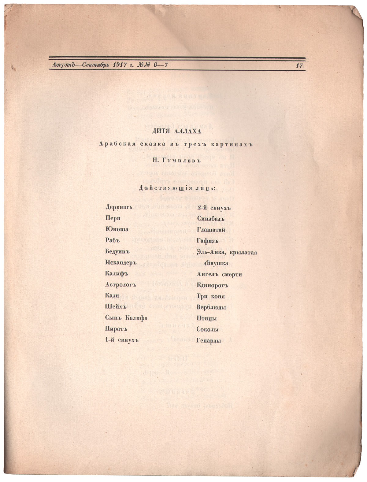 Драматическая сказка «Дитя Аллаха» создавалась Николаем Гумилевым для кукольного театра марионеток Ю. Сазоновой-Слонимской, но, к сожалению, постановка не была осуществлена. Впервые опубликованную в № 6-7 журнала «Аполлон» пьесу сопровождают утонченно стилизованные иллюстрации Павла Кузнецова, который был приглашен оформить несостоявшуюся постановку. Позже сказка выходила отдельными, гораздо более скромными, изданиями в Петрограде (1918) и Берлине (1922). Лесман № 737, Турчинский, с. 156.