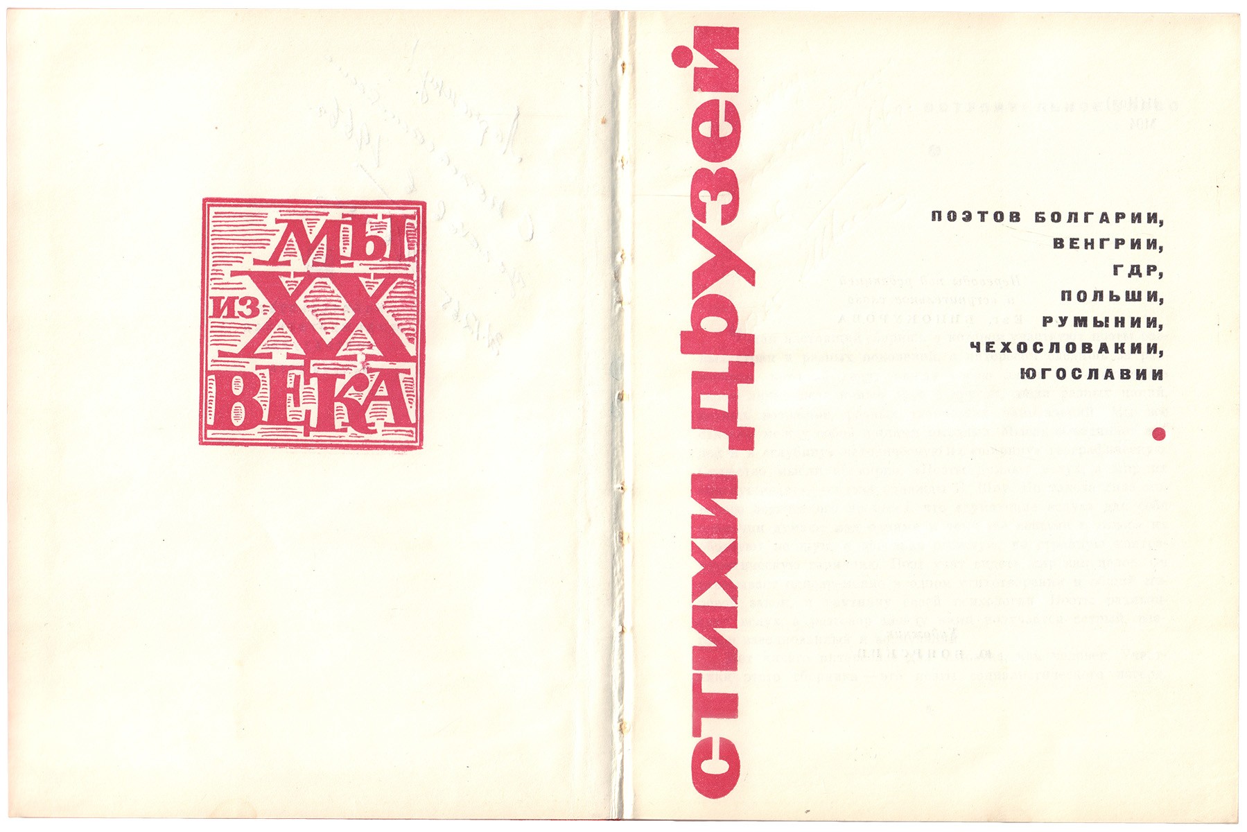 1. Заря над Кубой. М.: ГИХЛ, 1962. 256 с. 16,3×10 см. В издательской обложке и иллюстрированной суперобложке. Перевод Бродского стихотворения Пабло Армандо Фернандеса. Сборник «Заря над Кубой» вышел практически одновременно с № 11 (1962) журнала «Костер», где состоялось первое выступление в печати Бродского (Охлопков, с. 34). Таким образом, стихотворение Фернандеса есть основания считать второй публикацией поэта и первым напечатанным переводом Бродского. 2. Поэты Югославии XIX-XX вв. М.: Художественная литература, 1963. 667 с. 17×12,5 см. В издательском ледериновом переплете. Опубликованы одни из самых ранних переводов Иосифа Бродского: стихотворения поэтов Милана Ракича и Тина Уевича. 3. Поэзия Гаучо. М.: Художественная литература, 1964. 240 с. 16,5×10 см. В издательской обложке и иллюстрированной суперобложке. Опубликован перевод стихотворения Хосе Рамон Луна. 4. Мы из XX века. Стихи друзей: поэтов Болгарии, Венгрии. ГДР, Польши. Румынии, Чехословакии, Югославии. М.: Художественная литература, 1965. 320 с. 16,5×12,5 см. В издательском ледериновом переплете. Переводы Иосифа Бродского поэтов: Тадеуша Кубияка Танасие Младеновича, Валерия Петрова (пер. с болгарского), Ежи Харасимовича (два стихотворения). 5. Ренессанс. Барокко. Классицизм. Проблемы стиля в западноевропейском искусстве XV–XVII веков. М.: Наука, 1966. 348 с., ил. 21×16 см. В издательском коленкоровом переплете, в иллюстрированной суперобложке. Надрывы суперобложки. Впервые опубликовано в переводе Бродского стихотворение Джона Донна «Посещение» в статье Аникста. 6. Галчинский, К.И. Стихи. М.: Художественная литература, 1967. 264 с. 13,5×10,5 см. В издательской иллюстрированной обложке и в суперобложке. Четыре стихотворения из сборника переведены Иосифом Бродским. 7. Завада, В. Одна жизнь. Стихи и поэмы. М.: Прогресс, 1967. 120 с. 16,5×12,5 см. В издательской иллюстрированной обложке. На задней части обложки след от ценника. Содержит поэму «Дорога пешком» в переводе Бродского. 8. Поэзия Австралии. М.: Художественная литература, 1968. 316 с. 16×12,5 см. В издательском ледериновом переплете, в иллюстрированной суперобложке. Небольшие надрывы суперобложки. В сборнике опубликованы в переводах Бродского два стихотворения Флексмора Хадсона и стихотворение Кристофера Уоллес-Крэбба. 9. Остров зари багряной. Кубинская поэзия ХХ века. М.: Художественная литература, 1968. 264 с. 16,5×10 см. В издательском коленкоровом переплете, в иллюстрированной суперобложке. В сборнике помещены следующие переводы Иосифа Бродского: два стихотворения Эухенио Флорита, два стихотворения Анхель Аухьера, по одному стихотворению Вирхилио Пиньера и Пабло Армандо Фернандеса. 10. Аймерич, А.Ф. Жестокая красота / пер. с испанского. М.: Художественная литература, 1968. 104 с. 14×10 см. В издательском ледериновом переплете. Восемь стихотворений из сборника переведены Иосифом Бродским. 11. Высокие деревья. Стихи польских поэтов. М.: Детская литература, 1970. 208 с. 20×12 см. В издательском составном иллюстрированном переплете. Опубликован перевод стихотворения Константы Галчинского. 12. Паламас, К. Избранная поэзия / перевод с новогреческого. - М.: Художественная литература, 1971. - 240 с., 16,5×12,5 см. В издательском иллюстрированном переплете. Стихотворение «Восток» в переводе Бродского. 13. Максимович, Д. Стихотворения / перевод с сербскохорватского. М.: Художественная литература, 1971. 391 с., ил. 16,5×12,5 см. В издательском ледери