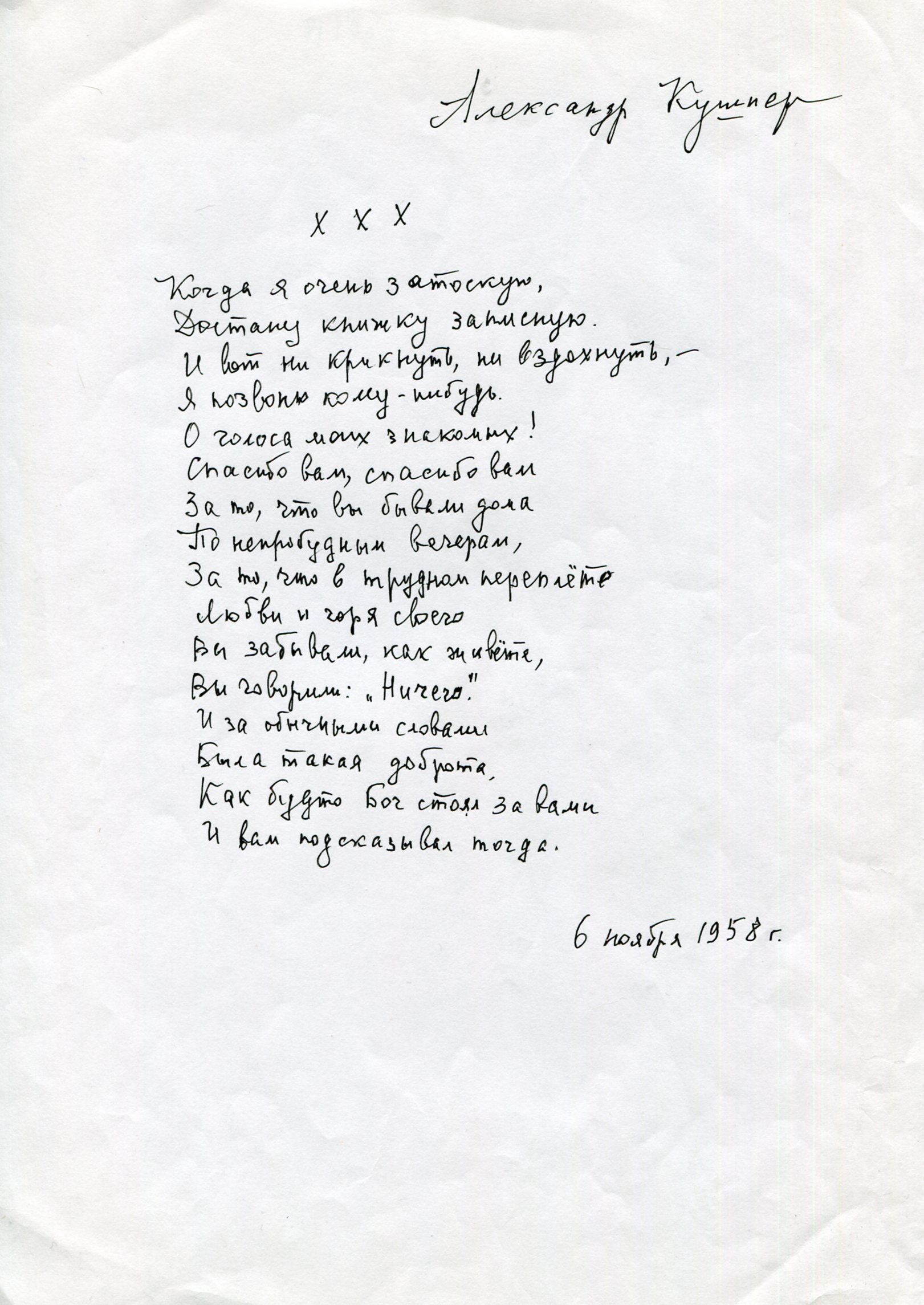 Автограф стихотворения Александра Кушнера "Когда я очень затоскую..."