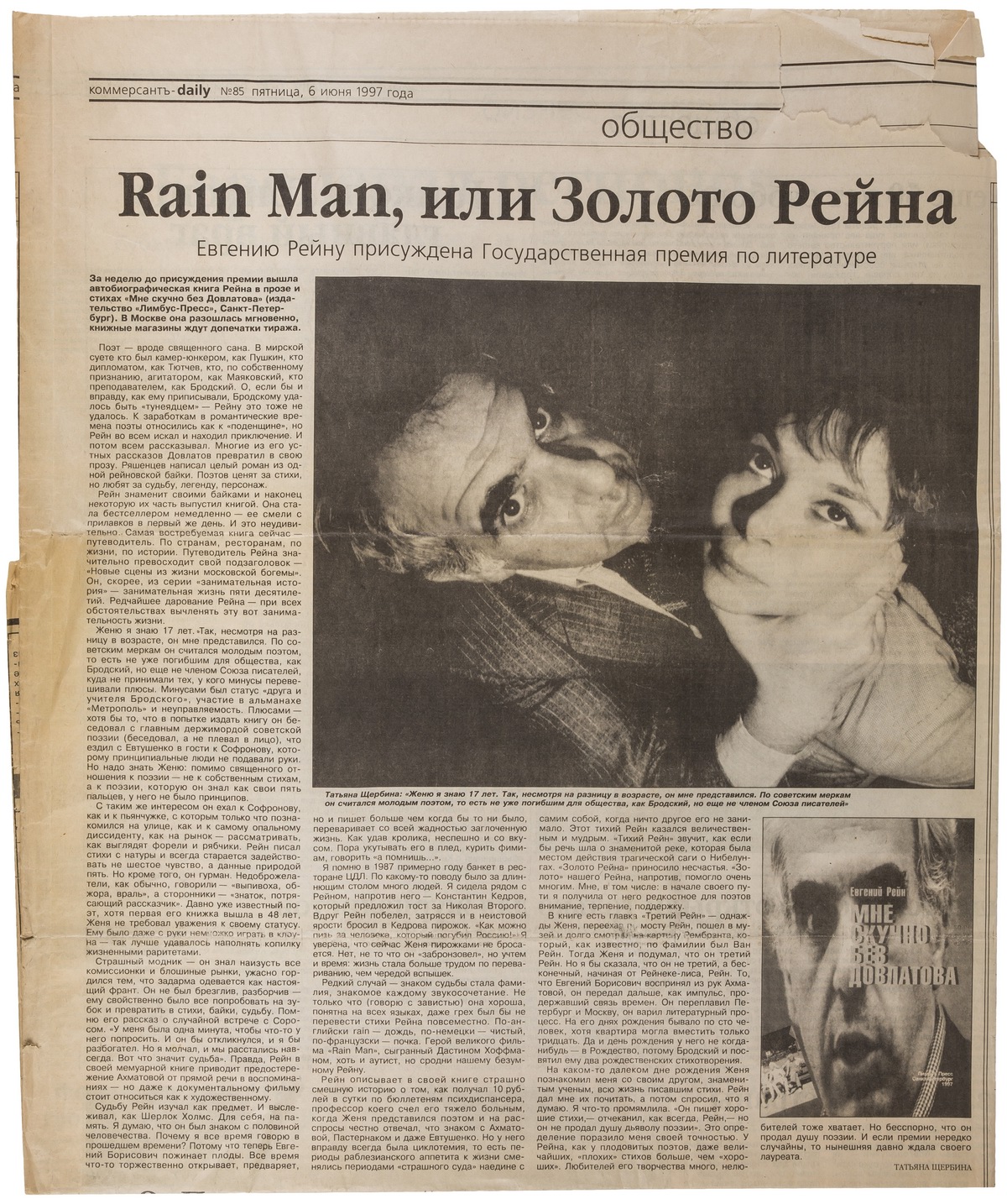 Приложена газета "Коммерсант-daily", в которой опубликована фотография Сергея Борисова и статья Татьяны Щербины о Евгении Рейне.
